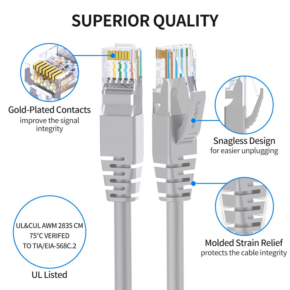 Cat 6 Performance: TIA/EIA-568C.2 compliant and UL listed, conductors are applied 24 AWG stranded copper wire provides up to Cat6 10-Gigabit Ethernet, backward compatible with 10Base-T, 100base-tx(fast Ethernet) and 1000Base-T (Gigabit Ethernet) for 8P8C cat5e and Cat5 cable. Premium Quality: Gold-plated contact connectors increase transmission stability and durability for daily insertion and removal. UL listed with high quality CM grade PVC material further improves durability of the cable for both in-wall and out-wall use. Unshielded Twisted Pair(UTP): Two conductors are twisting closely into one pair and 4 twisted pair construct to one cable so that the radio waves radiated during conductor transmission will be internally cancelled, effectively reducing the degree of signal interference. Length: Length does not include connectors and the injuction mold tail, which can help to better estimate and purchase the required length before wiring. Compatibility: RJ45 standard Ethernet patch cable provides universal connectivity for LAN network components such as PCs, laptop, computer servers, printers, routers, switch boxes, network media players, NAS, VoIP phones, etc. Product Description Cat6 High Speed Performance Conductors are applied 24 AWG stranded copper wire provides up to Cat6 10-Gigabit Ethernet, backward compatible with 10Base-T, 100base-tx(fast Ethernet) and 1000Base-T (Gigabit Ethernet) for 8P8C cat5e and Cat5 cable. Certified and Verified TIA/EIA-568C.2 compliant and UL listed with AWM 2835 standard and CM grade. 4 Twisted Pairs 1, Cross skeleton isolation frame; 2, 24AWG Copper Conductors; 3, High quality individual insulation. 4, Flexible PVC jacket. Gold-plated Contact Gold-plated contact further improve stability of signal transmission. Molded Strain Relief Boot Enhancing cable intergrity and improving durability. High quality PVC Jacket UL listed with AWM 2835 standard with up to 75°C temperature resistance and CM grade Flame retardant rating for secure wiring and using. Length Length does not include connectors and the injuction mold tail for more efficient to estimate the length which fit the usage scenario. Connection T568B sequence straightly connect to T568B sequence.
