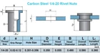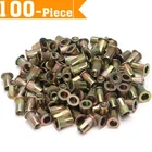 Pack of 100 1/4-20 Rivet Nuts Threaded Rivet Nuts Insert Nutsert Rivnuts 1/4-20UNC Body Diameter:0.350" (8.9mm). Application Hole Size:0.351"-0.356". (9mm). Head height: 0.055" (1.4mm). Head diameter: 0.490" (12.4mm). Grip Range:0.020"-0.120" (0.5-3mm); , Total Length: 0.590" (15mm); Installed Length: 0.360" (9mm) 100 pieces 1/4-20 rivet nuts threaded rivet inser nuts nutserts. Rivet nuts thread pitch: 1/4-20, they are made of carbon steel. 1/4-20 rivet nuts head height: 0.055" (1.4mm), head diameter: 0.490" (12.4mm). 1/4-20 rivet nuts grip range:0.020"-0.120" (0.5-3mm); body diameter:0.350" (8.9mm), application drill hole size:0.351"-0.356". (9mm) 1/4-20 rivet nuts total length: 0.590" (15mm).