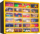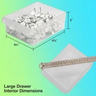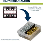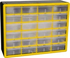 HEAVY DUTY CABINET WITH 24 DRAWERS: The 24-drawer small storage cabinet is made in the U.S.A. from rugged, high-impact plastic and measures 20" W x 6" D x 16" H; Organizer drawers - 6" x 4-1/2" x 2-3/16" GARAGE ORGANIZATION: The small parts organizer is great for garages and workshops for both homeowners and businesses; The plastic storage drawers can be used as tool box, screw organizer or for battery storage; Keep nails and other small parts accessible CLASSROOM ESSENTIALS: Teachers can use the stackable storage drawers for classroom organization; Use it as a teacher toolbox, art supply storage organizer, craft storage cabinet for scrapbook supplies, and more HOME STORAGE AND ORGANIZATION: This plastic storage cabinet offers many uses around the home; It can be a lego storage organizer, craft organizer, or sticker organizer; Use it for makeup storage and organization or for medicine and first aid supplies FEATURES: Stack cabinets securely or use keyhole slots to mount for wall storage; Finger-grip drawer pulls provide easy access; Rear stop tabs prevent contents from spilling; Drawer dividers are included and molded into the back of the cabinet The Akro-Mils 10124 24-Drawer Plastic Storage Cabinet Organizer with Drawers is a great solution for all your storage needs. This heavy-duty cabinet is made in the U.S.A. from rugged, high-impact polystyrene plastic and features 24 large and small plastic drawers offering ample storage space for all your small parts and tools. Plastic organizer drawers inside dimensions: 4-7/8-Inch x 4-1/4-Inch x 2-Inch. Whether you're looking to organize your garage, workshop, classroom, or home, this storage cabinet has you covered. Garage owners and businesses will love the versatility of this cabinet, with the plastic storage drawers perfect for use as a hardware organizer, screw organizer box, or for battery storage. Keep your nails and other small parts accessible with ease. Teachers can use the cabinet for classroom storage, as a teacher toolbox, art storage, craft storage box, for scrapbook supplies, and more. This plastic storage cabinet is also perfect for home storage and organization. Use it as a lego organizer, craft organizer, hobby organizer, or bead storage organizer. It's even great for makeup storage and organization or for medicine and first aid supplies. And with the ability to stack cabinets securely or wall-mount them using keyhole slots, along with finger-grip drawer pulls and rear stop tabs to prevent contents from spilling, this cabinet has everything you need to keep your items safe and organized. Cabinets have 8 small crosswise dividers and 4 large length dividers included. Included dividers are molded into the back of the cabinet (remove with scissors). Additional dividers can be purchased separately.