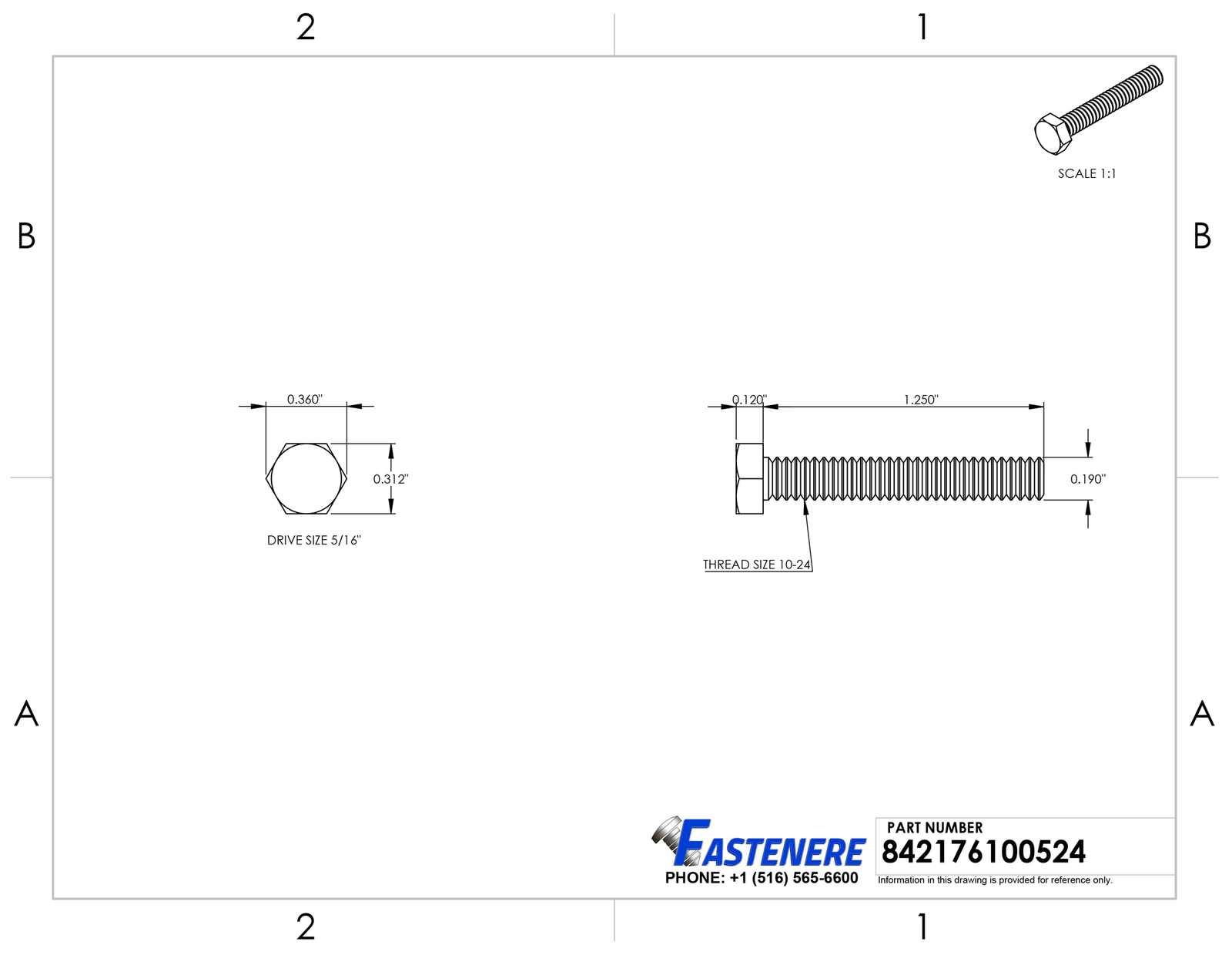 10-24 x 1-1/4" Stainless Steel Bolts Hex Head Grade 18-8 Qty 1000 Hex Tap Bolts, also known as fully-threaded Hex Cap Screws. These bolts have a variety of uses for construction, agriculture and automotive applications. General Product Information Head Style : Hex Drive Style : Socket Drive Size : 5/16" Thread : 10-24 Length : 1-1/4" Material : Stainless Steel 18-8 Quantity of Hex Bolts in Package : 1000 Detailed Product Information: Hex Head Width Flat to Flat : 5/16" Head Height : 1/8" Thread Diameter : 0.190" Threads Per Inch (TPI) : 24 Coarse or Fine Thread : Coarse Thread Coverage : Full Thread Thread Length : 1.250 Key Notes: Hex bolt made from high quality stainless steel grade 18-8 which offers one of the highest levels of corrosion and chemical resistance and will out last all other standard and plated fasteners available Stainless steel hex bolts are the most common construction fastener having a hex head that can be secured with a socket or wrench and mated with a nut or other internally threaded item with a machine thread pattern of 3/8-16 Hex bolts also reffered to as tap bolts are fully threaded with a 4 inch of thread length that is measured starting from underneath the head to the end of the thread Fastenere brand Stainless steel bolts have a high tensile strength of 70,000 PSI and meet ASMEB14.2.1 specifications for bolts that you can trust to stand strong under presure and secure your projects for years to come with no requirement for costly maintenance Fastenere ultra stainless hex bolts are guaranteed to out live and out last all other grades of hardware when exposed to outdoor elements Shipping: All orders placed before 3:30 pm EST Will Ship Same Day Tracking is provided on ALL Orders Priority Mail Shipping service is offered at a discount of only $3.95 UPS Ground UPS Next Day Air is available, Please inquire for pricing Returns : ALL returns are accepted if returned within 60 days. Money Back or exchange guaranteed. NO Restocking Fees. For YOU, we constantly strive to find ways of improving our performance.