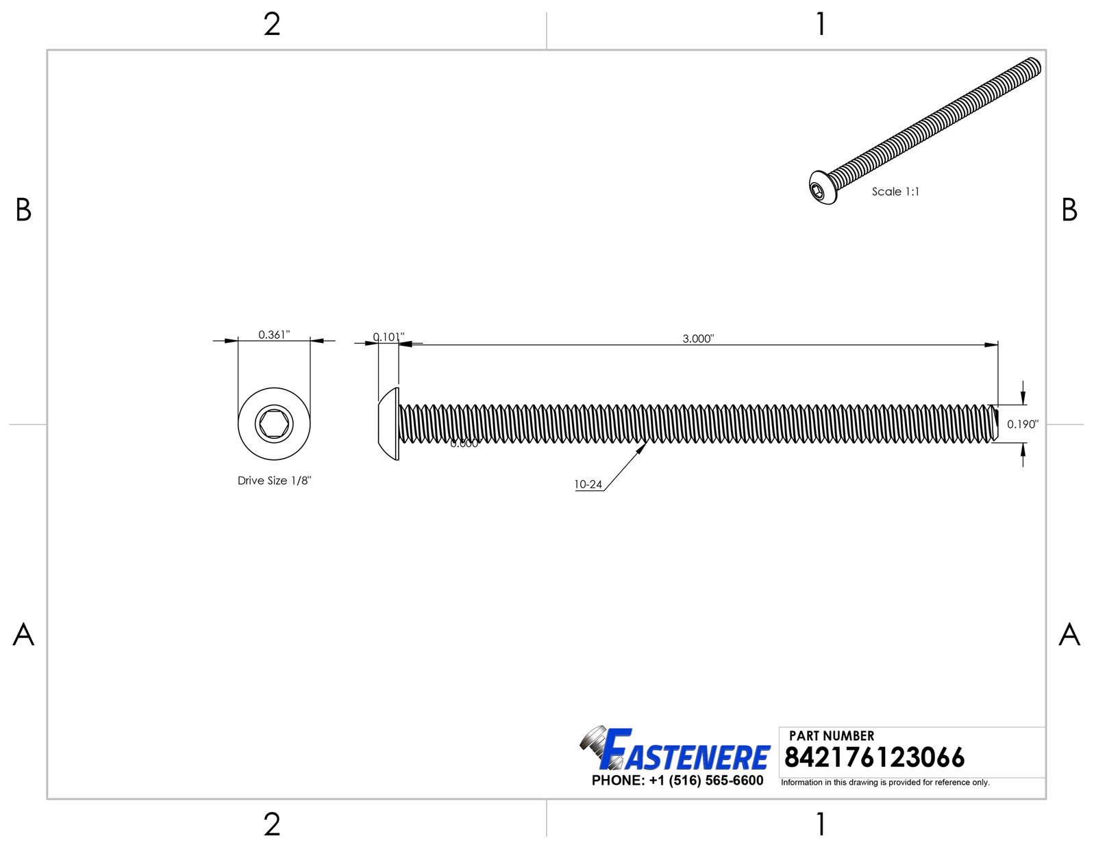 10-24 x 3" Button Head Socket Cap Screws Black Oxide Alloy Steel Qty 500 General Product Information Head Style : Button Drive Style : Allen Hex Key Drive Size : 1/8" Thread : 10-24 Length : 3" Quantity of Fasteners in Package : 500 Material Type : Alloy Steel Grade Rating : 8 Detailed Product Information: Head Diameter : Head Height : 0.101" Thread Diameter : 0.190" Threads Per Inch (TPI) : 24 Coarse or Fine Thread : Coarse Thread Coverage : Full Thread Thread Length : 3.00 Key Notes: Button socket cap screws have a wide bearing surface and high tensile strength but are low profile allowing for clearance in tight spaces where there is not sufficient space for wrenches or sockets button head cap screw is recommended for lighter fastening operations and is not suggested for use in critical high strength applications where socket head cap screws should normally be used Black oxide is not a coating but a surface chemical conversion process that offers a mild corrosion resistance Fastenere black oxide button head socket cap screws are treated with a heavy water displacing oil that coats the fastener offering a greater level of corrosion resistance than most other black oxide fasteners These button cap screws are a grade 8 equivalent offering a high tensile and yield strength These fasteners have a machined thread pattern of 10-24 which is apart of the unified thread system Shipping: All orders placed before 3:30 pm EST Will Ship Same Day Tracking is provided on ALL Orders Priority Mail Shipping service is offered at a discount of only $3.95 UPS Ground UPS Next Day Air is available, Please inquire for pricing Returns : ALL returns are accepted if returned within 60 days. Money Back or exchange guaranteed. NO Restocking Fees. For YOU, we constantly strive to find ways of improving our performance.
