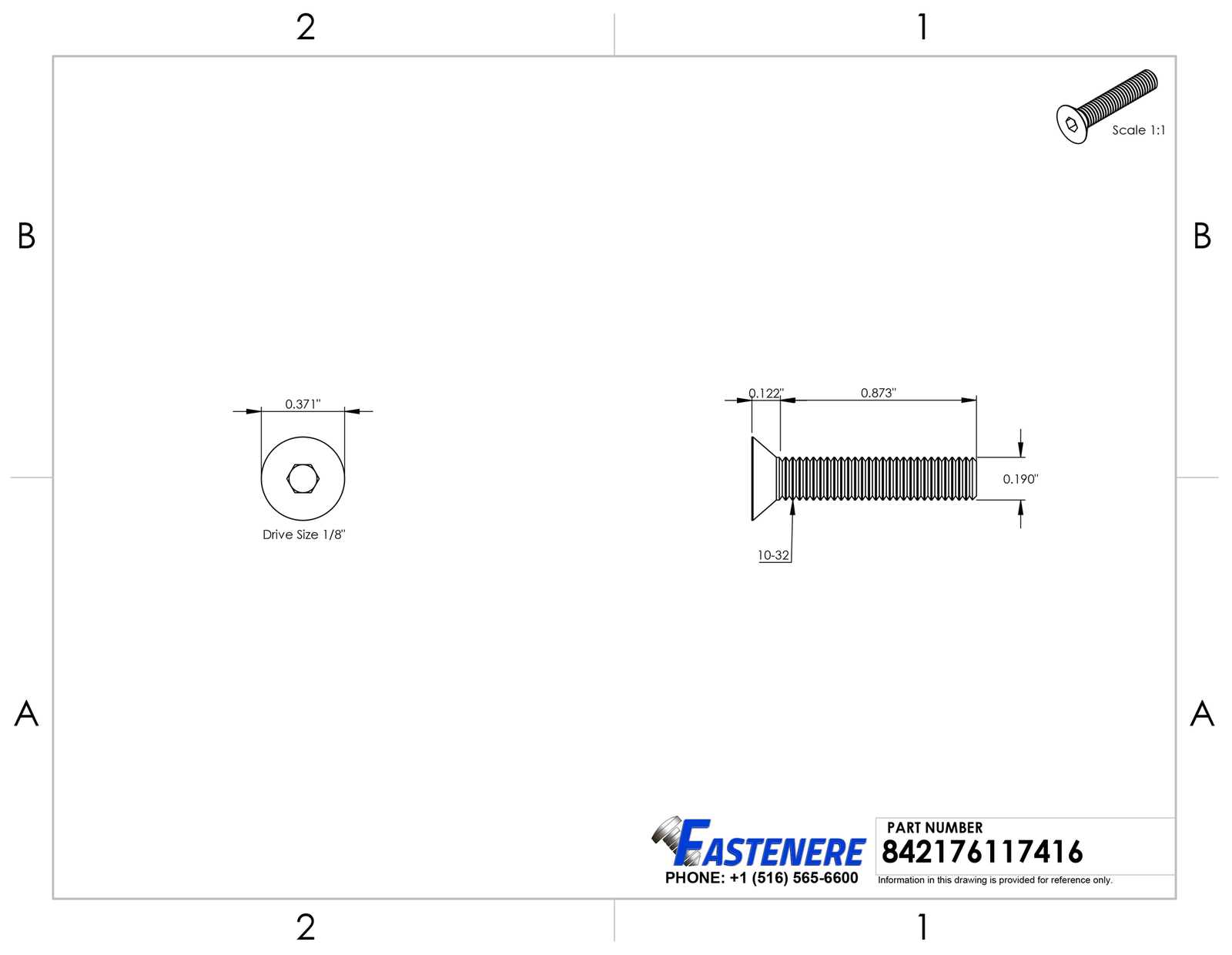 10-32 x 1" Flat Head Socket Cap Screws Allen Drive Stainless Steel Qty 2500 The stainless steel socket cap screw has a plain finish and a flat head with an internal hex drive. Stainless steel resists corrosion and may be magnetic. The flat head is cone shaped for use in countersunk holes and has a flat top that fits flush with the mated surface. The internal hex drive, also known as a hex-socket drive, has a hexagonal slot that requires an Allen key driver, also known as a hex key or Allen wrench. Socket cap screws are threaded fasteners that have a cap head with an internal socket drive for installing in areas with limited side clearance. These screws are available with a variety of head shapes, which determine how the screw interacts with the mating surface, and drive styles, which determine the type of tool required to install the screw. General Product Information Head Style : Flat Drive Style : Allen Hex Key Drive Size : 1/8" Thread : 10-32 Overall Length : 1" Quantity of Fasteners in Package : 2500 Detailed Product Information: Head Diameter : Head Height : 0.128" Countersink Angle : 82 Degree Thread Diameter : 0.190" Threads Per Inch (TPI) : 32 Coarse or Fine Thread : Fine Thread Coverage : Full Thread Thread Length : 0.873 Key Notes: Flat head socket cap screws have a internal hex drive that can be driven with an allen key or hex bit and a machine thread that will match up to any internally threaded item with the same machined thread patern which is apart of the unified thread system Flat head screws have a flat top that tapers down to a cone shape that will sit flush into a countersunk hole and give a finished appearance 82 degree flat head is the most common countersunk screw head angle These flat socket cap screws are made of a high quality 18-8 grade stainless steel that offers a great corrosion and chemical resistance that will stand strong against the elements. Flat head countersunk machine screws length are measured from the top of the flat head to the end of the thread and the thread length is the overall length minus the height of the head Shipping: All orders placed before 3:30 pm EST Will Ship Same Day Tracking is provided on ALL Orders Priority Mail Shipping service is offered at a discount of only $3.95 UPS Ground UPS Next Day Air is available, Please inquire for pricing Returns : ALL returns are accepted if returned within 60 days. Money Back or exchange guaranteed. NO Restocking Fees. For YOU, we constantly strive to find ways of improving our performance.