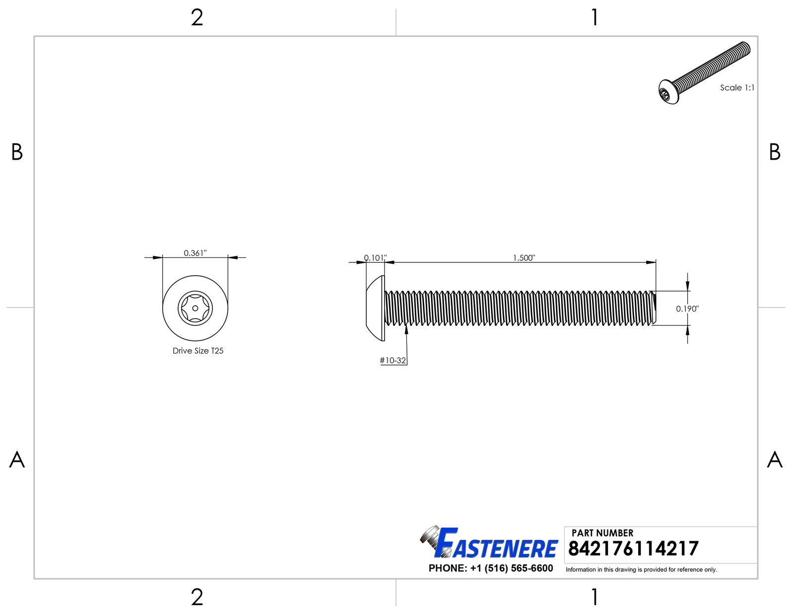 10-32 x 1-1/2" Torx Security Machine Screws Button Head Stainless Steel Qty 500 Fastenere Specialize in tamper resistant screws as well as security fasteners, spanners, nuts, bolts and more. At Fastenere Inc., we supply the toughest and most durable security screws around. They are available in both sheet metal and machine threads.Our tamper resistant screws provide a higher level of security for you with their drive design, which prevents removal with normal screw drivers. We offer a large number of head-styles, driver kits and matching tools for installation and removal. These tamper resistant screws are suitable for providing tamperproof fastening for a wide range of applications. Tamper pruf resistant screws will allow you to save thousands of dollars by protecting you from such things as theft, vandalism, corrosion, and tampering. General Product Information Head Style : Button Drive Style : Pin In Star Drive Size : T-25 Thread : 10-32 Length : 1-1/2" Quantity of Fasteners in Package : 500 Detailed Product Information: Head Diameter : 0.361" Head Height : 0.101" Thread Diameter : 0.190" Threads Per Inch (TPI) : 32 Coarse or Fine Thread : FINE Thread Coverage : Full Thread Thread Length : 1.5" Key Notes: Machine screws are uniformly threaded screws of 1/4" nominal diameter or less that is designed to be threaded into uniformly threaded nuts or threaded holes in the parts they are intended to fasten. Machine screws primary tightening is accomplished by turning the head of the screw. With a bolt, the primary tightening procedure might be accomplished by turning the nut. Button is low domed style head with a wide bearing surface that is perfect for use on applications in tight spaces. Pin in Star Drive also referred to as Security Torx has a star shaped recess with a center pin in the fastener with six rounded points which was designed to permit increased torque transfer from the driver to the bit and adding a level of security. This style requires a special security driver bit for installation. The vast majority of stainless steel fasteners are produced with metals from the austenitic family. Their high levels of chromium and nickel provide tough corrosion resistance and the ability to withstand considerable physical strain without fracturing, albeit at a higher cost than the martensitic varieties. Made of stainless steel grade 18-8 which offers a high level of chemical and corrosion resistance and strength that will out perform and out last all zinc plated fasteners for years with out the need to perform costly and time consuming maintenance. Shipping: All orders placed before 3:30 pm EST Will Ship Same Day Tracking is provided on ALL Orders Priority Mail Shipping service is offered at a discount of only $3.95 UPS Ground UPS Next Day Air is available, Please inquire for pricing Returns : ALL returns are accepted if returned within 60 days. Money Back or exchange guaranteed. NO Restocking Fees. For YOU, we constantly strive to find ways of improving our performance.