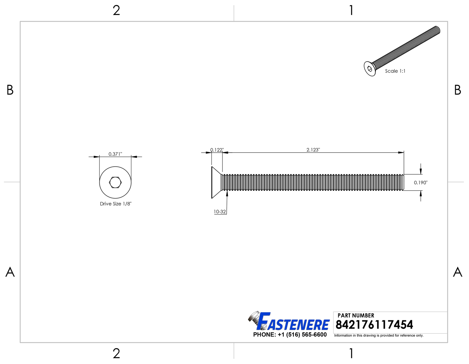 10-32 x 2-1/4" Flat Head Socket Cap Screws Allen Drive Stainless Steel Qty 500 The stainless steel socket cap screw has a plain finish and a flat head with an internal hex drive. Stainless steel resists corrosion and may be magnetic. The flat head is cone shaped for use in countersunk holes and has a flat top that fits flush with the mated surface. The internal hex drive, also known as a hex-socket drive, has a hexagonal slot that requires an Allen key driver, also known as a hex key or Allen wrench. Socket cap screws are threaded fasteners that have a cap head with an internal socket drive for installing in areas with limited side clearance. These screws are available with a variety of head shapes, which determine how the screw interacts with the mating surface, and drive styles, which determine the type of tool required to install the screw. General Product Information Head Style : Flat Drive Style : Allen Hex Key Drive Size : 1/8" Thread : 10-32 Overall Length : 2-1/4" Quantity of Fasteners in Package : 500 Detailed Product Information: Head Diameter : Head Height : 0.128" Countersink Angle : 82 Degree Thread Diameter : 0.190" Threads Per Inch (TPI) : 32 Coarse or Fine Thread : Fine Thread Coverage : Full Thread Thread Length : 2.123 Key Notes: Flat head socket cap screws have a internal hex drive that can be driven with an allen key or hex bit and a machine thread that will match up to any internally threaded item with the same machined thread patern which is apart of the unified thread system Flat head screws have a flat top that tapers down to a cone shape that will sit flush into a countersunk hole and give a finished appearance 82 degree flat head is the most common countersunk screw head angle These flat socket cap screws are made of a high quality 18-8 grade stainless steel that offers a great corrosion and chemical resistance that will stand strong against the elements. Flat head countersunk machine screws length are measured from the top of the flat head to the end of the thread and the thread length is the overall length minus the height of the head Shipping: All orders placed before 3:30 pm EST Will Ship Same Day Tracking is provided on ALL Orders Priority Mail Shipping service is offered at a discount of only $3.95 UPS Ground UPS Next Day Air is available, Please inquire for pricing Returns : ALL returns are accepted if returned within 60 days. Money Back or exchange guaranteed. NO Restocking Fees. For YOU, we constantly strive to find ways of improving our performance.