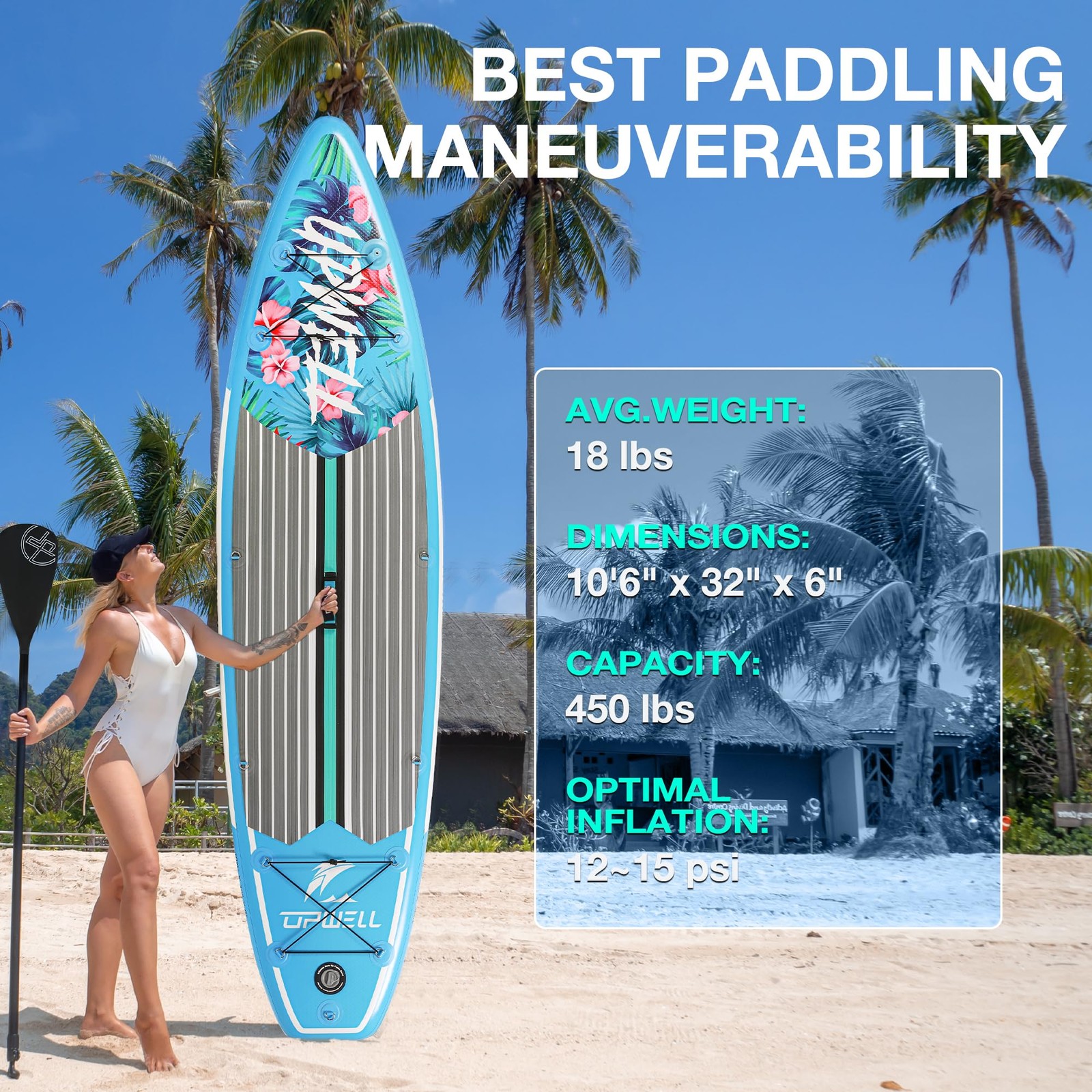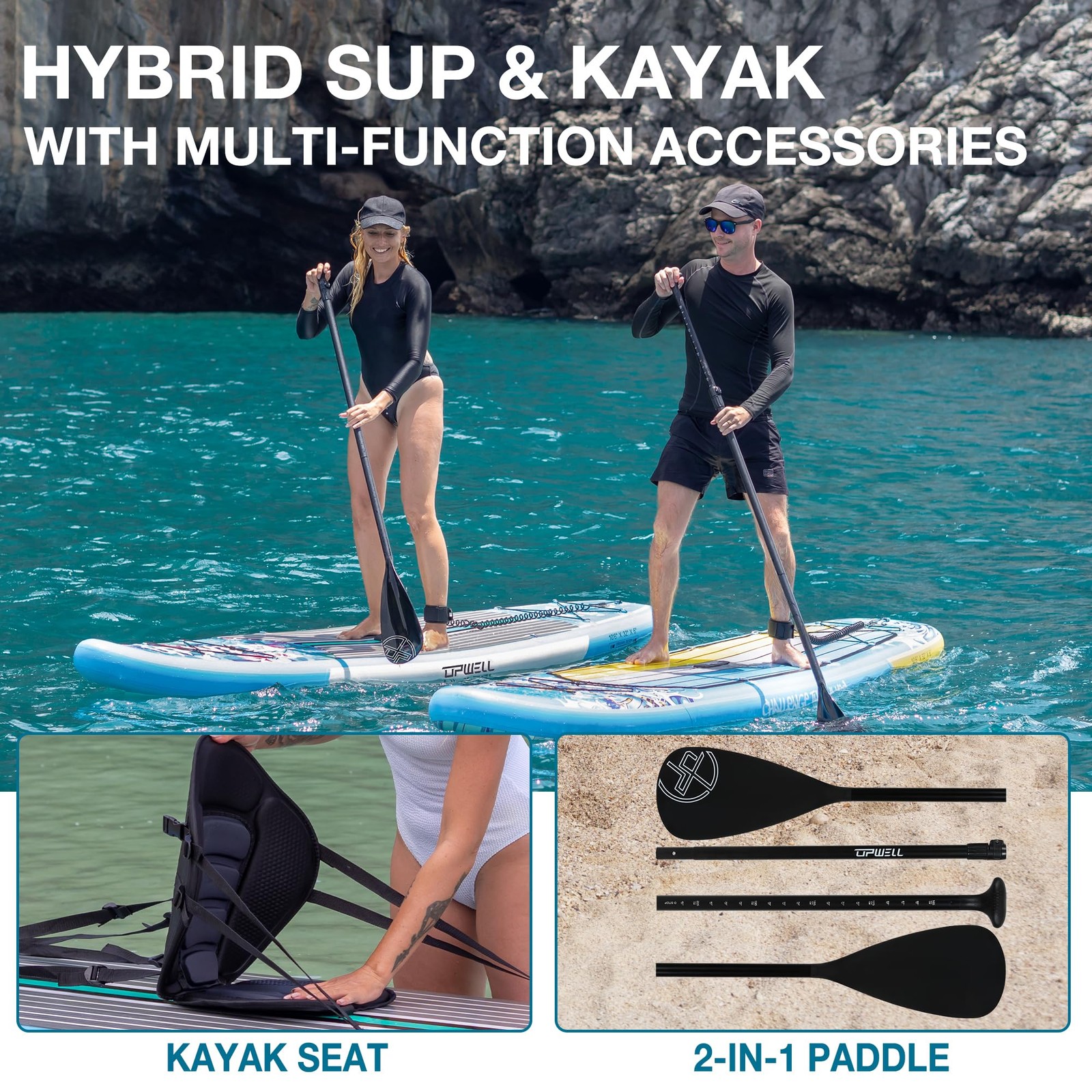 Inflatable Stand Up Paddle Board PROFESSIONAL SUP DESIGN:inflatable stand up paddle board is 10’6”x 32”x 6”. It's weight capacity up to around 450lbs and wide design ensures higher stability and flexibility. Our unique design suitable for all beginners and all skill levels to explore and enjoy themselves in different water areas, such as ocean, lake and river, withstand both fresh and salt water. This is an all-around board that can be used for surfing, fishing, touring, yoga and family fun PREMIUM MATERIALS:Our boards are made of the highest quality military grade materials. Ultralight double wall PVC is 25% lighter than other same size products. Meanwhile, this reinforced lightweight fabric creates a firmness, anti-corrosion, wear-resistance sup board which can be used for years. Soft non-slip EVA deck pad makes you feel comfortable while ensuring your stability and safety when you stand for a long time. paddle board is your optimal choice for water sports FULL SET OF ACCESSORIES(Updated June 9, 2025):Purchase one you will get all gears you need: 1x inflatable stand up paddle board, 3x removable fins, 1x 2-in-1 Paddle, 1x coiled ankle leash, 1x hand pump for quick inflation and deflation, 1x 10L waterproof storage bag for your essentials, 1x roomy backpack, 2x emergency PVC patch, 1x wrench, 1x waterproof phone bag, 1x SUP kayak seat has combined polyurethane foam waterproof cushion and the best mid-sized seat back on the market ULTRA PORTABLE: Our paddle board is designed wider and lighter only 18lbs and it's easy to inflate and deflate quickly. Whether you'd like find a relax water place to enjoy yourself alone, or finding a perfect space to have a fun water experience with your lover or family or friends. offer spacious and comfortable backpack that is large enough to accommodate paddle board and all accessories. While you’re having a pleasant holiday, we hope to ease a little tired of your journey 100% SATISFIED CUSTOMER SERVICE: have been devoted to research and design the stylish and high quality paddle boards for many years. Not only we attach importance to the quality of inflatable SUP, but also we care more about your purchasing and using experience. We are glad to offer a 1-year manufacturer's warranty on the paddle boards at no additional cost. If there is any problem, please feel free to contact us. we will give you a 100% satisfactory reply within 24 hours