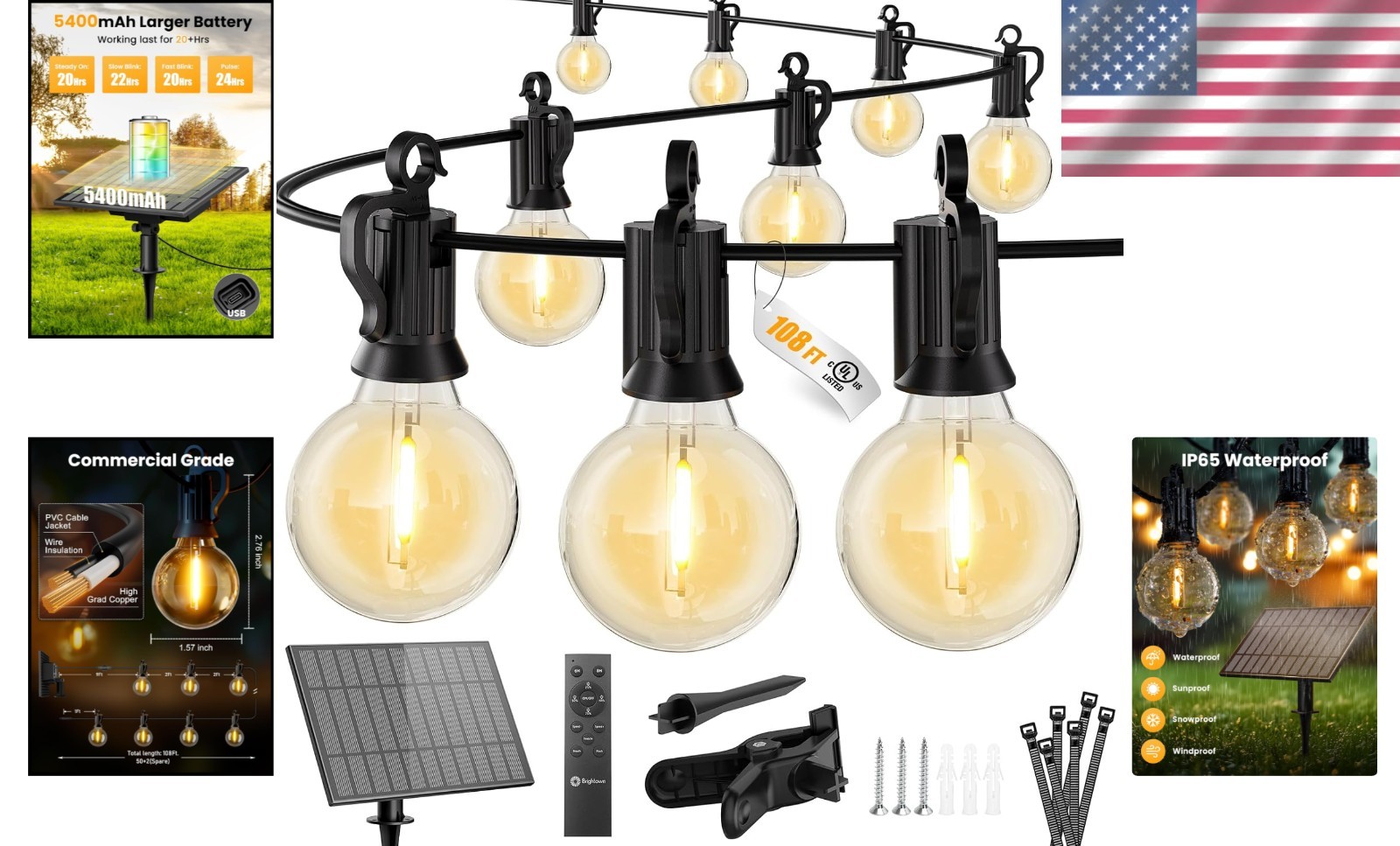 108FT Solar String Lights with Remote - 52 Shatterproof LED Bulbs, Dimmable & Timable ‹ › ‹ › ‹ › ‹ › ‹ › ‹ › ‹ › ‹ › ‹ › ‹ › ‹ › 108FT Solar String Lights with Remote Transform your outdoor space into a breathtaking oasis with our exquisite 108FT Solar String Lights, featuring: 52 Shatterproof LED Bulbs: Equipped with 50 shatterproof bulbs and 2 extra bulbs, each 0.15W LED G40 bulb with E12 candelabra base, perfect for instant replacements. Convenient Ready-to-Go Setup: Enjoy easy installation with 55 cable ties that allow for secure positioning on walls, fences, and more. Remote Control with Timer: Tailor your ambiance with adjustable brightness settings (25%, 50%, 75%, 100%) and timer options (6H, 8H, 10H default), enhancing your evening gatherings. Automatic Operation: Charge effortlessly during the day—these lights turn on at dusk and off at dawn, conserving energy while bringing your evening to life. Versatile Power Options: Equipped with solar and USB rechargeable capabilities, stay illuminated even on cloudy days—the convenience of a USB Type-C socket for quick charging ensures up to 16-20 hours of brilliance. Commercial Grade Durability: With waterproof certification, these lights withstand the harshest weather conditions, ensuring longevity and beauty for every occasion. Magical Ambiance: Ideal for any celebration or everyday use—perfect for backyard BBQs, romantic dinners, weddings, and holiday parties. Benefits: Create a warm and inviting atmosphere indoors and outdoors. Enjoy energy savings with solar charging and automatic operation. The timeless design enhances every setting: from patios to cafes and gardens to rooftops. Perfect gift for all occasions, suitable for anyone who appreciates elegance in decoration. Why choose our Solar String Lights? Elevate your outdoor experience with our 108FT Solar String Lights—an exquisite blend of aesthetics and functionality. The shatterproof bulbs together with a convenient remote allow you to create and customize your perfect ambiance with minimal effort. Whether it’s a joyful celebration or a simple evening under the stars, these lights are not just decorations; they are a promise of beautiful memories, all round. Don’t miss the chance to transform your space—order your Solar String Lights today and bring warmth to every setting! Shipping Free & Fast Shipping - We offer free shipping to most of the USA with a normal delivery time of 3-7 days. However, due to the current situation, additional delivery time (up to 3 weeks) may be required for some items. Alternative Carriers - We may use alternative carriers (e.g. USPS, FedEx, UPS, etc.) to ensure your package arrives safely and on time. Due to the use of multiple carriers, we are unable to provide a tracking number automatically. Handling Time - Orders are processed and shipped within 1-2 business days of receiving cleared payment. Shipping Restrictions - Shipping to Alaska, Hawaii, Puerto Rico, Guam, and other US territories may incur shipping charges or delivery restrictions. Please contact us before ordering, or your order can be refunded/cancelled. State Restrictions - There may be restrictions based on your state of purchase. For example, certain items may not be shipped to California due to state regulations. Contact for Tracking Updates - If you require tracking updates or have any concerns about the delivery of your order, please feel free to contact us, and we will be happy to assist you. Return 30-Day Hassle-Free Returns - We want you to be completely satisfied with your purchase. If you are not, you can return the item within 30 days of receiving it for a full refund or exchange. Easy Return Process - To start a return, simply contact us and we will provide you with a prepaid return shipping label and detailed instructions. Restocking Fee - There are no restocking fees for returns. However, the buyer is responsible for return shipping costs if the return is not due to a seller's error. Refund Processing Time - Refunds will be processed within 5 business days of receiving the returned item in its condition. Payment We accept all major credit cards, PayPal, and Apple Pay for your convenience. Your payment information is secure and encrypted to ensure a safe and seamless transaction. Please complete your payment within 3 days of purchase to avoid any delays in shipping. Feedback Your feedback is extremely important to us. We strive to provide the best products and customer service possible. If you are satisfied with your purchase, please take a moment to leave us a positive review. If you have any concerns or issues with your order, please contact us before leaving negative feedback. We are committed to resolving any problems and ensuring your satisfaction. Contact Us If you have any questions or concerns, please feel free to out to our customer support team. You can contact us through the eBay messaging system. We are available Monday to Friday, 9:00 am to 5:00 pm EST, and we will do our best to respond to your inquiry within 24 hours. Buy it now and enjoy a pleasant shopping experience! Size: 108 Feet Lumens: Solar String Lights Item Height: Solar String Lights Power Consumption: 0.15W Unit Quantity: 1 Features: Dimmable,Waterproof,With Remote Control,Timer,3 Lighting Modes,Shatterproof Light Color: Warm White Occasion: Christmas,Thanksgiving,Outdoors,Holiday Parties,Birthday Celebrations,Weddings,Housewarmings Control Style: Remote Control Department: Kids,Teens,Adults,Unisex Theme: Outdoor,patio Room: Porch,Outdoor,Garden,Deck,Patio Material: Copper,Plastic Type: String Lights Lighting Technology: LED Light Shape: G40 Sensor Type: Light Installation Area: Outdoor Color: Black Power Source: Solar Cord Color: Black Number of Settings: 3 Voltage: 5.5 V Style: Traditional Number of Lights: 50 Color Temperature: 2700 K Unit Type: ft
