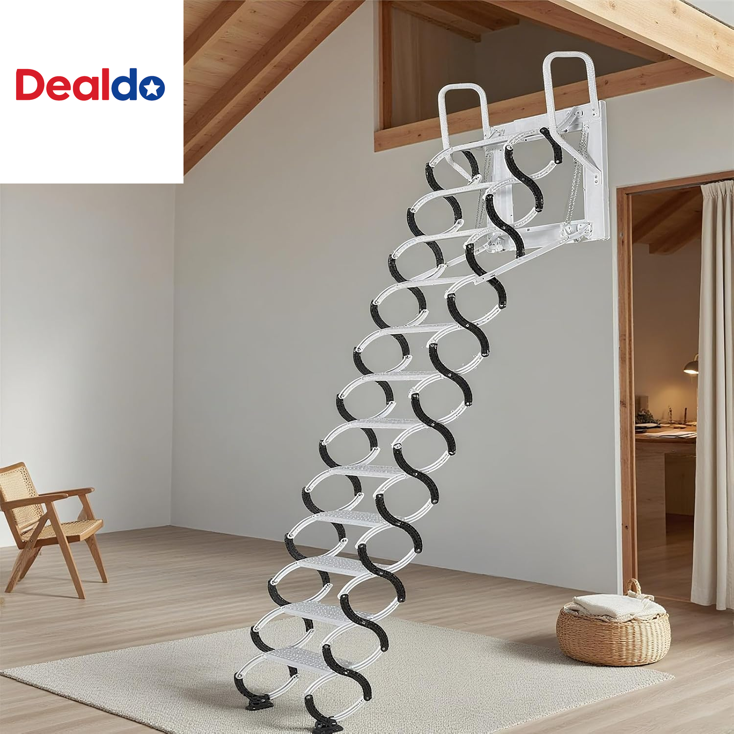 [Easy to Assemble]This wall mounted attic ladder is easy to install. Comes with installation instructions. includes a standard expansion screw kit and can be installed on concrete, brick, and wooden walls to meet various height requirements in locations such as attics, rooftops, and warehouses. Cleaning is also easy; simply wipe with a damp cloth. [Space Saving]This Wall Mounted Loft Staircase wall mounted retractable design allows the folding pull down stairs to be folded up when not in use and securely attached to the wall without taking up any floor space.The tread width is 5.1 inches (about 13.7 cm). [Customizable Height] The optimal pull-down loft staircase can have a maximum vertical height of up to 10 feet. If the height is less than 10 feet, the three treads at the bottom of the staircase can be removed, and the ladder can be switched to any length from 9 to 12 steps. [High Load Capacity] This wall-mounted attic stair features durable carbon steel treads and can support up to 600 pounds (280 kg). The bottom features rubber non-slip pads for stability even in wet conditions. The rounded edges effectively prevent bumps and dents. [Easy to Use] The unique S-shaped structure of this Retractable attic stairs not only facilitates folding and stowing, but also increases the ladder's load-bearing capacity. Holes in the handrails allow you to adjust the ladder's tilt angle to suit different spaces. High-manganese springs and the S-shaped structure ensure smooth folding and stowing. [High Safety] The treads of this loft ladder are non-slip textured, making them more stable. The textured surface increases friction to prevent slipping. The tread width is 5.1 inches (about 13.7 cm). Product description