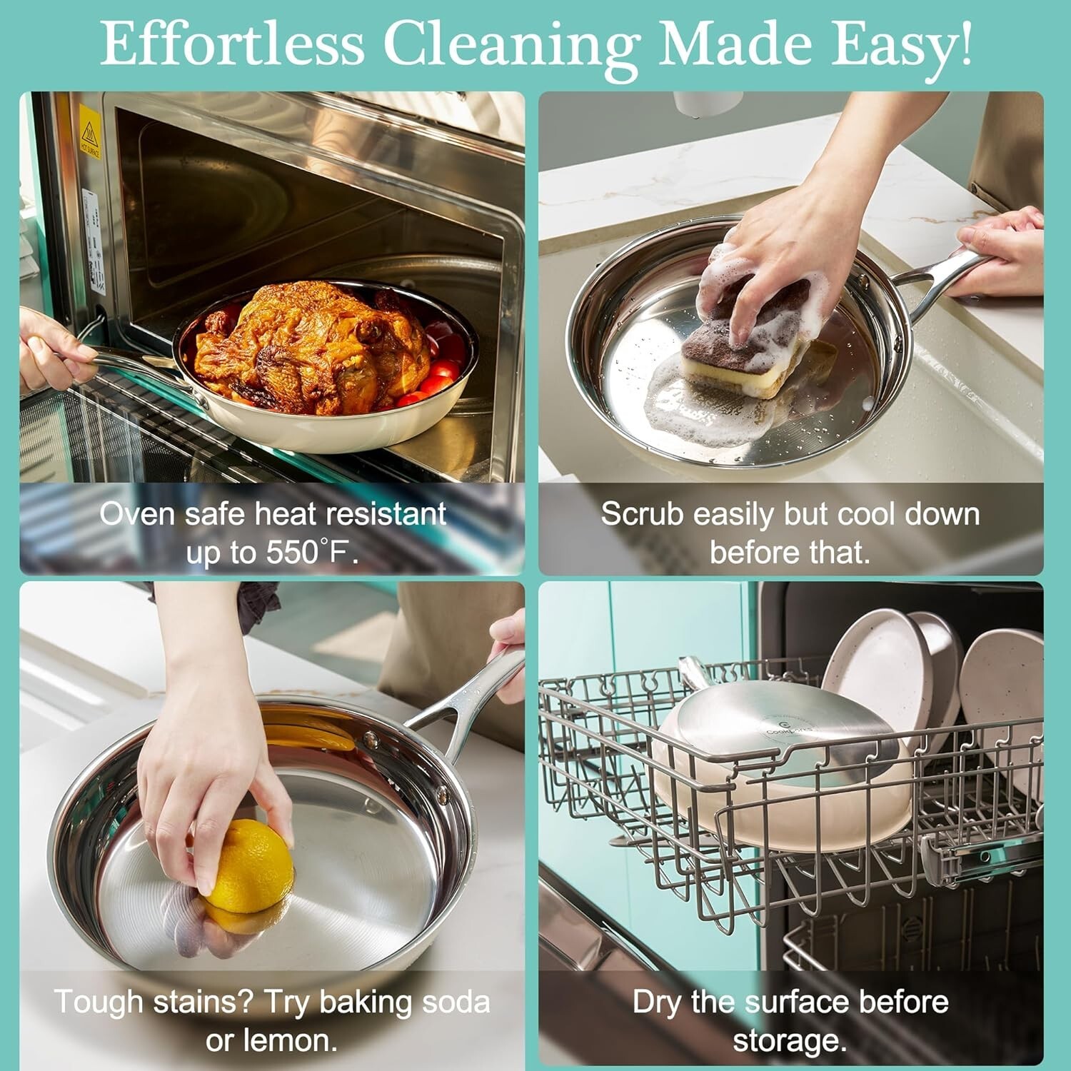 The Ultimate Stainless Steel Skillet: A work of art with a four-layer design. Aluminum core, 18/10 stainless steel inside and out, and a dazzling BlacSAFE & HEALTHY MATERIALS: Free of PFOA, PTFE, PFAS,PFCA. Our stainless steel frying pan focuses on safer and healthier meals for you and your family.k Pearl exterior. Believe us, it's the most stunning stainless frying pan you've seen. MORE DURABLE AND STURDY: Crafted from EU standard tri-layer stainless steel, which includes 18/10 stainless steel and aluminum core, excellent rub and scratch resistance. Our frying pan can lead to up to 20% savings in gas or electricity usage. It enhances cooking efficiency, enabling fast and effective searing, sauteing, simmering and etc. INDUCTION COMPATIBLE: The pan's bottom is flat and equiped with a high magnetic conductive stainless steel base, which helps to heat evenly and quickly. Compatable for most stoves including induction cooktops. STAY-COOL HANDLE: Ergonomic stainless steel metal handles that stay cool to touch, allowing you to safely pick the pan right off the stove to flip foods or simply for easy transfer. EASY TO CLEAN: Our pan interior surface with highly mirror polished techonology, so food remains, such as sauces, eggs, etc., are easy to wash away. And it's completely dishwasher safe allowing you to simply throw your pan in the dishwasher. No toxic-healthy lifestyle SAFE & HEALTHY MATERIALS Free of PFOA, PTFE, PFAS,PFCA, Special designed for health-conscious household. Smooth and easy-to-wipe surface SUPER EASY TO CLEAN With our highly mirror polished techonology sauce could be easily washed off. Brand COOKPORTS Material Stainless Steel Special Feature Electric Stovetop Compatible Color Silver Capacity 6 Cubic Inches Compatible Devices Smooth Surface Non Induction Product Care Instructions Dishwasher Safe Handle Material Stainless Steel Number of Pieces 1 Is Oven Safe Yes Model Name BLACKPEARL Has Nonstick Coating No Is Dishwasher Safe Yes Recommended Uses For Product frying, sautéing, and searing Specific Uses For Product frying, sautéing, searing Shape circular UPC 737706949066 Product Dimensions 5 x 10 x 3 inches Item Weight 2.07 pounds Manufacturer COOKPORTS ASIN B0CH19HKR5 Item model number BLACKPEARL