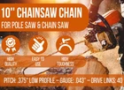 This chainsaw chain is a fantastic replacement—sharp, durable, and fits perfectly on my Milwaukee pole saw. The install was quick, and it cuts smoothly without any issues. Great value for the price, and it matched my OEM specs exactly. Highly recommend for anyone needing a reliable 10-inch chain!