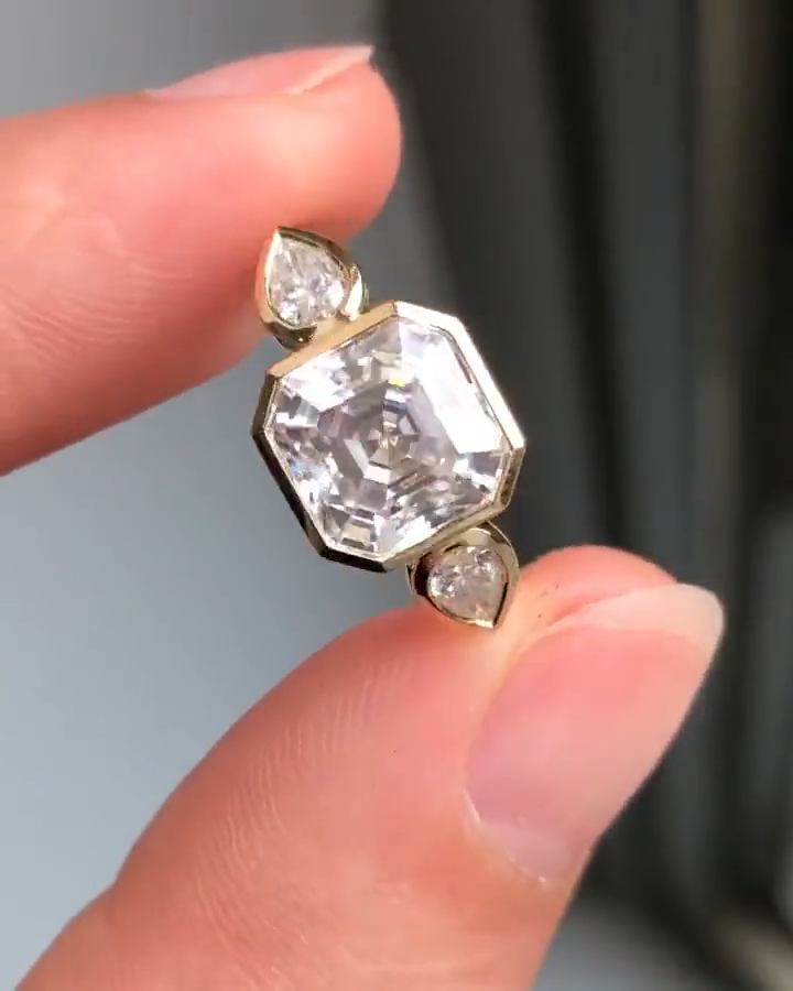 Asscher Cut Three Stone Bezel set D Colorless VVS Moissanite Ring ๐ Available Metals: A) 5X Platinum Vermeil, B) Solid 10K Gold, C) Solid 14K Gold, D) Solid 18K Gold, E) Solid 950 Platinum. โ HIGHEST QUALITY Certified White Gold, Rose Gold, Yellow Gold & 950 Platinum. (Not Trash). ๐ Ring Size: 2,3,4,5,6,7,8,9,10,11,12,13,14,15,16 and anything between these ring sizes available. It could be 1/4, 1/2, or 3/4. We Fit It to your Exact Finger Size no matter what size you want. ๐ Main Stone: HARDEST Quality VVS GRA Certified Hand Cut Moissanite (Pass Diamond Testers) โจ Side Stones: Premium Quality VVS Moissanite. (Pass Diamond Testers) ๐ Certified: GRA - GRC ๐ Polish: Excellent Polish. Shiny & Clean for Maximizing Sparkles. โฆ Cut: Hand cut Excellent cut & Symmetry with Crisp & Sharp Edges/Corners. ____________________ ๐ 100% Handmade with GORGEOUS & Accurate Details. Itโs an Art, not only a Valuable Material. ๐ 60 Days Money Back Guarantee for Any Reason even if you don't Fall In Love with it. ๐คฏ FREE LIFETIME Main Stone Warranty & Side Stone Replacement. (No Color Change). ๐ FREE LIFETIME Jewelry Cleaning & Re-plating. ๐ Hypoallergenic. Skin Friendly. Doesnโt cause any type of Allergies. ๐ Customizable with/to Your Favorite Stone/Jewelry Type & Shape. ๐ FREE STUNNING Random GIFTS On Every Order (we sell them for +$200 up to over +$700). ๐ฅฐ Amazing Wooden Gift Boxes for Your Main Jewel & its Gifts. ๐ฅณ Gift Wrapping Available (we wrap with no tags or receipts, ready to present). ๐คฉ VIP Customer Service to Make Your Dreams Come True in the Most Fantastic Way. ๐ FREE SUPER FAST FedEx Express Shipping. ____________________ ๐โ + Our 5X Platinum Vermeil: Platinum is 9.4 times RARER & slightly more DURABLE than gold. Rings with platinum end up more EXPENSIVE than gold because the DENSITY of platinum is a lot HIGHER and the QUALITY is EXTREMELY PURER. Rings THICKLY plated FIVE TIMES with platinum offer MUCH STRONGER PROTECTION against wear and scratches than gold plated jewelry. Therefore they LAST the LONGEST while giving you a SHINY LOOK ALL THE TIME. ๐โ + Our Rare Stone Quality: Here you have the NATURAL looking color of the diamonds in a RARE size with extraordinary VVS1 clarityโฆ Weโre offering the GREATEST QUALITY and VALUE at the BEST PRICE with this design by using very SPECIAL types of GRA Certified Moissanite stones. Natural diamonds in this color, clarity and size are super rare and very hard to find. Some of them easily cost over $10,000 per carat. (please message me for natural diamonds like this color, size and shape so I can give you the accurate price based on your preferences) ____________________ ๐ข๐๐ FREE FAST EXPRESS SHIPPING Processing + Shipping = Receiving Time PROCESSING: Only 1 available. This ring will be shipped within 48 hours. (Other sizes require customization for 2-3 weeks. ) SHIPPING: 2-6 days via FedEx Express for FREE โ Youโll get updated with the tracking code, once your package is shipped. โ We ship with insured FedEx only which is very secure. โ An adult signature is required at the time of delivery. _____________________ โ๐๐ CUSTOMIZATION/PERSONALIZATION: Custom orders with me are SUPER EASY & COMFORTABLE, no matter if youโve never done it before or youโve done lots of them. ๐ค I break down everything into small steps. And we go through the steps one by one together. On each step, youโll get to pick or guide me from the options I represent. ๐ Once we get to the end, your dream comes true. ๐คฉ๐ Because every single detail is just exactly what you want. ๐๐ ๐จ HOW TO DESIGN YOUR RING: A โ Send me some/one image similar to your idea. Or tell me whatโs your favorite shank, profile or stone? So I can show you some options to choose from. B โ Next, I will start designing it right away. Iโll send you some screen shots from what I designed. We can adjust any part of it together, until itโs exactly the way you want it to be. C โ After we get to the ideal conclusion, Iโll render several Ultra High Quality 3D images and a 4K video, so you see what the end result is gonna look like in reality. D โ The moment you approve everything, we start making it. Once itโs finished, weโll ship it the same day. + 3D IMAGE SAMPLES: Before you order yours, you can ask me for some samples of the 3D rendered images and videos. Youโre gonna absolutely love the quality, because they look like real rings. ๐คฉ๐ + Designing your dream ring with me is gonna be a fantastic experience. While you just sit and order, youโll watch how I take care of everything from your idea to the end product in the SIMPLEST & GREATEST way possible.โ โ------------ ๐ AVAILABLE GEMS: All stones are available - Colorless & Colorful Moissanite or Simulated Moissanite. Natural & Lab Grown Diamonds in Colorless or Colorful. Natural and Lab made Emerald, Ruby, Sapphire, Amethyst, etc. Just ask! ๐ฅ AVAILABLE METALS: All metals are available - 925 Sterling Silver, 5X Platinum Vermeil, 9K Solid Gold, 10K Solid Gold,14K Solid Gold, 18K Solid Gold (in Rose, White or Yellow), Platinum 950. ๐ AVAILABLE MATCHING PIECES: We can make matching pieces for this product. Engagement Rings, Bridal Sets, Wedding Bands, Earrings, Studs, Hoops, Bracelets, Bangles, Necklaces, Pendants, and anything youโd dream of. We can design all to set with this item. ๐จ๐จ๐ง๐ฆ AVAILABLE OTHER JEWELRY: We make jewelry as per occasion and celebration like birthdays, birth months, anniversaries, motherโs day, valentine's day, fatherโs day, memorials, thanksgiving, zodiac signs, graduation days, and many more per your request. ____________________ โโโโโ 5 STAR PRISTINE PROMISES: โฆ๏ธ 100% Satisfaction Guaranteed โฆ๏ธ Ethically Sourced โฆ๏ธ FREE Lifetime Ring Resizing โฆ๏ธ FREE Complimentary ENGRAVING โฆ๏ธ 100% Conflict F