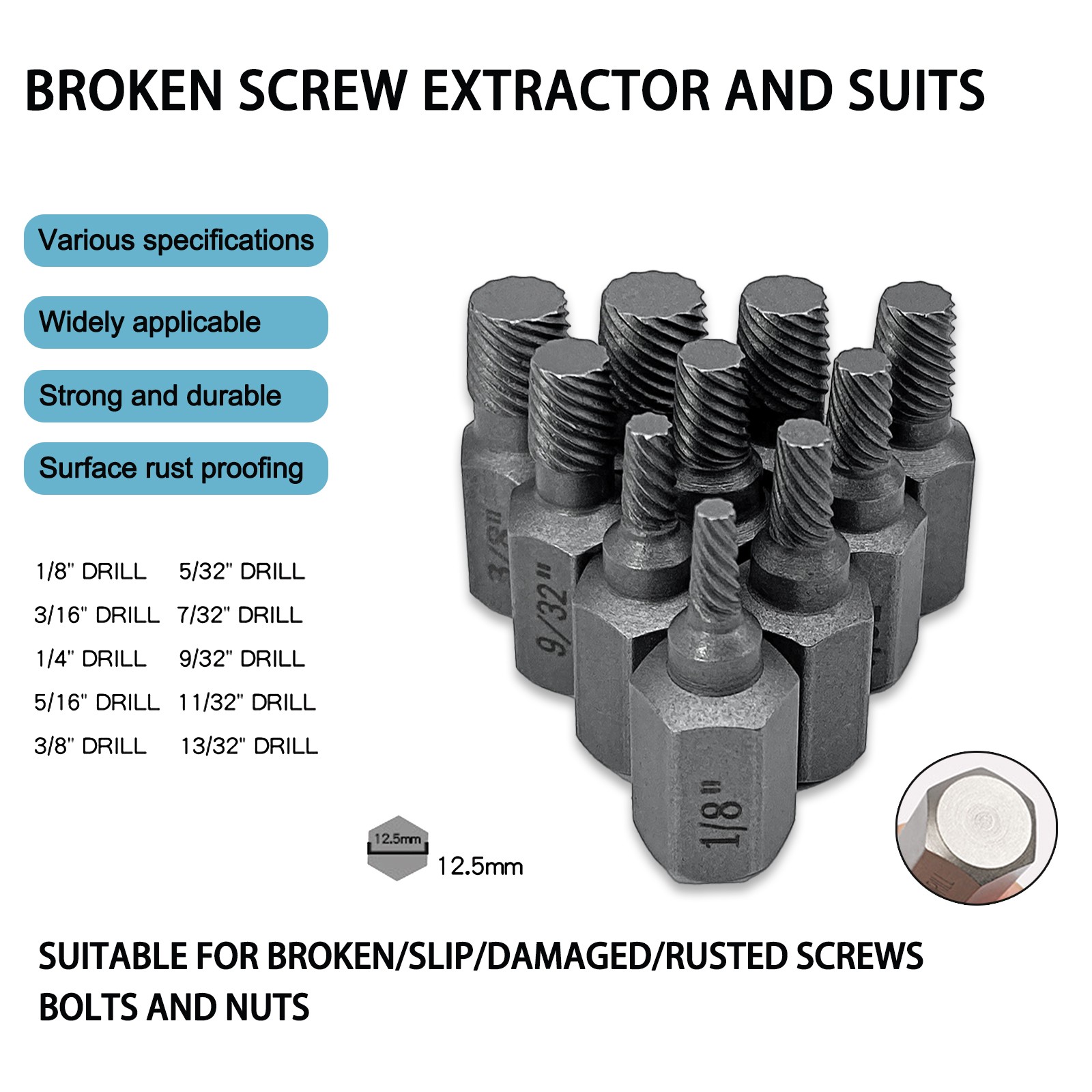 10pcs Screw Extractor Drill Bits Broken Damaged Bolt Stud Remover Set Description 10pcs Multi-Spline Screw Extractor Set For removing broken studs / pipes and screws. Also Alemite grease nipples and fittings. Can be used with a 13mm socket or wrench Sizes: 1/8 | 5/32 | 3/16 | 7/32 | 1/4 | 9/32 | 5/16 | 11/32 | 3/8 | 13/32in. Package: 1X Screw Extractor Set