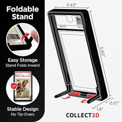 Unique foldable Incorporated card stand makes it very easy to displayed in your favorite showcase or store your collection. Our display card stands are designed for a perfect secure fit to provide protection and style to your collectibles. The simple design of the display frame makes for a no hassle experience to enjoy your trading card collection. The display frame is specifically designed with a stable base that will not accidentally tip over easily like other stands. Accidental tip overs from a simple nudge are a thing of the past!