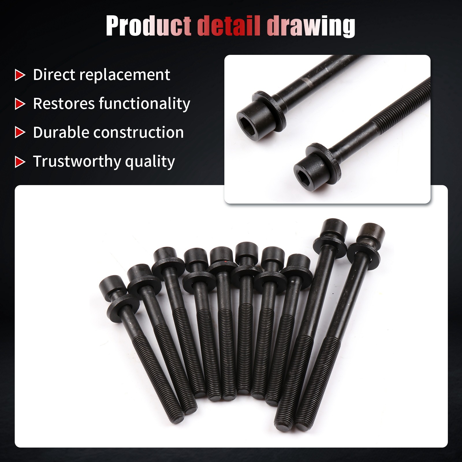 Compatibility should be checked and confirmed before placing order! Steps of confirming the compatibilities: Manage " My Garage ", and chose the right one when placing order; Or chose the " Year / Make / Model / Trim / Engine " of your vehicle on the compatible chart; Or Contact us if you have any question in confirming the compatibility, to make sure you will get the right and compatible item. Applications 96 - 97 For Hyundai Elantra 1.8L 1795CC L4 DOHC (16 Valve) Eng.Code "G4GM" 98 - 98 For Hyundai Elantra 1.8L 1796CC L4 DOHC (16 Valve) Eng.Code "G4GM" 99 - 12 For Hyundai Elantra 2.0L 1975CC L4 DOHC (16 Valve) Eng.Code "G4GF" 97 - 97 For Hyundai Tiburon 1.8L 1795CC L4 DOHC (16 Valve) Eng.Code "G4GM" 97 - 08 For Hyundai Tiburon 2.0L 1975CC L4 DOHC (16 Valve) Eng.Code "G4GF" 05 - 09 For Hyundai Tucson 2.0L 1975CC L4 DOHC (16 Valve) Eng.Code "G4GF" 04 - 09 For Kia Spectra 2.0L 1975CC L4 DOHC (16 Valve) Eng.Code "G4GF" 05 - 09 For Kia Spectra5 2.0L 1975CC L4 DOHC (16 Valve) Eng.Code "G4GF" 05 - 10 For Kia Sportage 2.0L 1975CC L4 DOHC (16 Valve) Eng.Code "G4GF" Package Included 10 Pcs Head Bolts Specifications Direct replacement - this Head Bolts are designed to match the original gaskets required to reseal and restore proper function on specified vehicles. Restores functionality - this Head Bolts are made to fit and fully restore part functionality after the original gasket fails. Durable construction - this Head Bolts is made from quality materials to ensure reliable performance and long service life Trustworthy quality - These Head Bolts are designed for the professional installer. It does not come with any installation instructions. If you do not have a service manual, please consult a professional mechanic prior to installing this kit. You will get what you see in the picture showed. About US: We are committed to making the best auto-parts products and providing you with better services. So if you have any quesiton or problem, please fell free to contact us about that. Payment: All of these methods which are acceptalbe by eBay. Shipping: All item will be packed with well condition in box or envelope, we make sure the item is in good protection, also please check all the item when you get the package. Product will be shipped within 2 business days after full payment is received and verified. All domestic orders will be shipped via USPS, UPS or FedEx from our US warehouse and usually arrives to your door in about 2-7 business days. Returns & Refund: 30-day free return will be provided. -Please note that the situations below will not be incounted: -Ordered by mistake. -Don't like it. -Duplicated orders. -Damaged product during installation. Contact Us: Any quesiton or problem, do contact us please. We are always online to answer. End Save for Web Slices