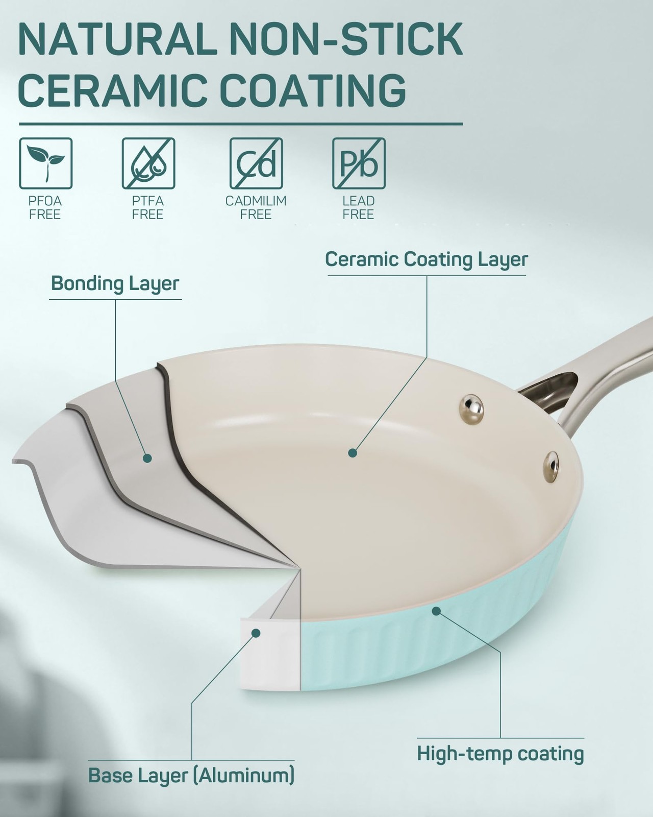 This cookware set is a game-changer! The ceramic coating makes cooking and cleaning effortless, while the stylish green design adds a pop of color to my kitchen. The sturdy handles stay cool, and the glass lids let me monitor my food without lifting. The included wooden utensils complete the elegant look while being practical. Everything heats evenly and cooks beautifullyโno more stuck-on food! Perfect for everyday meals and entertaining. Highly recommend for anyone wanting both performance and style in their kitchen.