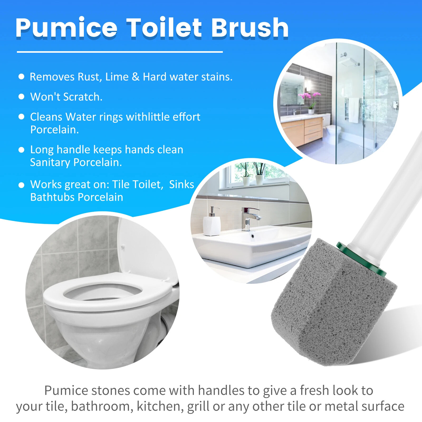 Features: Special Texture: The pumice stick is made of premium quality texture, the shape and hardness of the brush head can better fit the surface of the toilet, and go deep into the crevices and corners for cleaning Wide Range of Application: It can be used not only to clean the crevices and corners of the toilet, but also to clean the narrow parts and hard-to-clean areas of the bathroom facilities such as bathtubs, washbasins, tile crevices, etc., which is highly practical and multi-functional Easy to Operate: The shape and design of pumice brushes are usually compact and flexible, convenient for hand-held operation, and can easily penetrate into various crevices and corners for cleaning, very convenient to use Texture: Plastic + Pumice Stone Size: Brush Head: 6 × 4. 5cm Handle: 18cm Package includes: 1 × Pole 10 × Brush Head