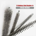 Tube Brush Kit 10 Piece Brass & Stainless Steel Bristle * Brass brushes: 1/4", 5/16", 3/8", 1/2", 3/4" * Stainless steel brushes: 1/4", 5/16", 3/8", 1/2", 3/4" * 4" long brush area * Brushes are 12" overall length * Twisted wire handle with loop Multi Size Cleaning Brush Kit: This 10-piece Tube Cleaning Brush Kit includes 5 steel wire brushes and 5 stainless steel brushes in various sizes, from 1/4" to 3/4". Ideal for engine cleaning, metal rust removal, and detailed cleaning tasks. It's your go-to set for thorough cleaning! Access Hard-to-Reach Areas: These 12" metal brushes with a 4" brush area easily clean 3/8 stainless steel tubing, tight spaces, and narrow areas. Heavy-Duty Build: Designed with twisted wire handles, flexible shaft and a storage loop, these durable metal brushes are designed for tough cleaning tasks, making them perfect for heavy-duty use. Safe and Cautious: This kit includes brushes for rust, steel, and stainless surfaces, making it versatile for various cleaning tasks. Please be careful and keep away from children. Always wear protective glasses while using these tools to ensure safety. Customer Satisfaction Guaranteed: If you have any quality issues with the product, us for a .