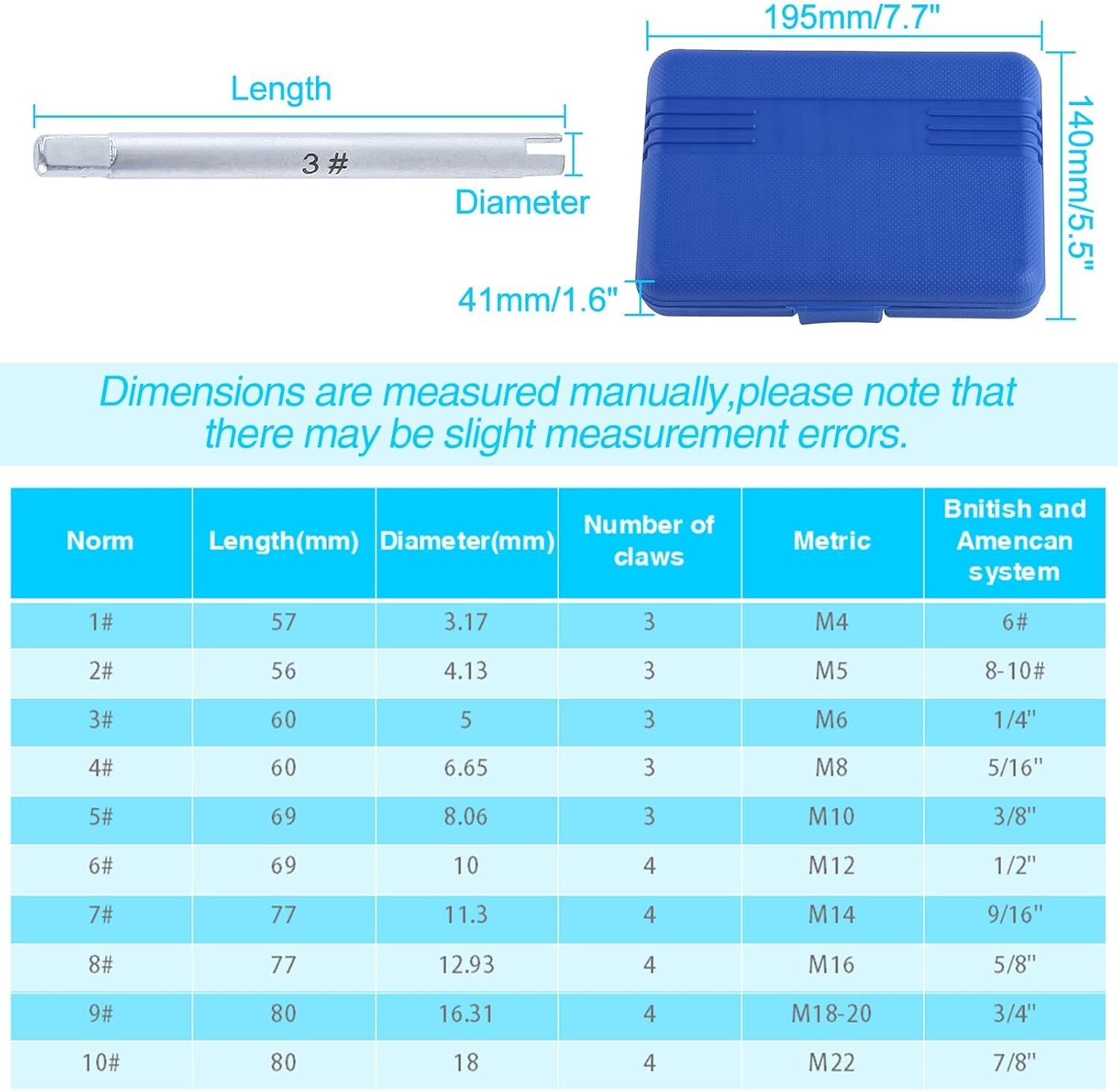 10 Pcs Tap Extractor Set 3/4 Flute Broken Head Screw Remover Stripped Tap Ext... Premium Material: Made of high-hardness Chrome-molybdenum steel with anti-rust electroplated surface for high torsional strength and ensuring long-lasting performance. 3/4 Flute Specification: 1#: 3 flute, M4, 6#; 2#: 3 flute, M5, 8-10#; 3#: 3 flute, M6, 12#-1/4; 4#: 3 flute, M8, 5/16"; 5#: 3 flute, M10, 3/8"; 6#: 4 flute, M12, 1/2"; 7#: 4 flute, M14, 9/16"; 8#: 4 flute, M16, 5/8";9#:4 flute, M18-20, 3/4"; 10#: 4 flute, M22, 7/8". Precision Size: There are 10 sizes of tap extractors, 1#-5# are 3 flutes, and 6#-10# are 4 flutes, featuring the groove structure, these tap extractors can grab broken screw taps speedily. The square head is compatible with a tap wrench or adjustable wrench. Efficient Extraction: Select the appropriate tap extractor and insert it into the tap's groove. Then, using a tap wrench or adjustable wrench, unscrew in the opposite direction. The result will be a newly restored tap thread. Wide Application: The tap extractor is specially designed for fast grasping and easy removal of stripped, rusted, broken, or corroded screw taps. It's an essential tool for industrial and home repair work. Shipping We offer FREE shipping on all orders! We ship within Three business days of payment, usually sooner. Local pickups and combined shipping options are not provided at this time. Return You can return a product for up to 30 days from the date you purchased it. Any product you return must be in the same condition you received it and in the original packaging. Please keep the receipt. Payment We accept payment by any of the following methods: PayPal Please pay as soon as possible after winning an auction, as that will allow us to post your item to you sooner! Feedback Customer satisfaction is very important to us. If you have any problem with your order, please contact us and we will do our best to make you satisfied. Contact Us If you have any queries, please contact us via ebay. We usually respond within 24 hours on weekdays. Please visit our eBay store to check out other items for sale! Thank you for shopping at our store.