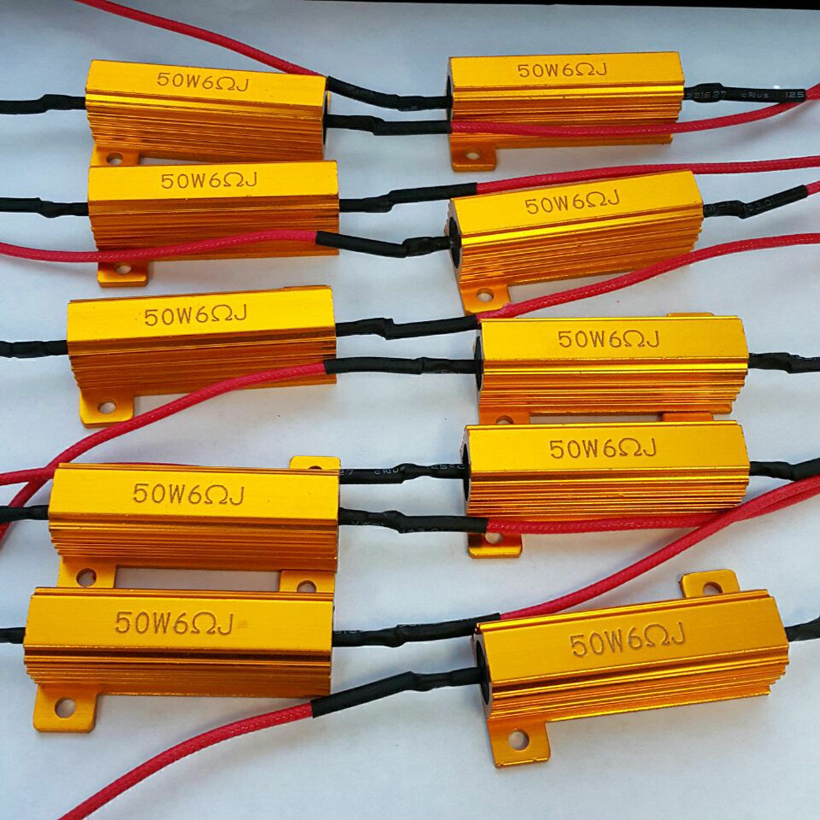 Product Description 10x 50Watt 6 ohm Load Resistors with T-Tap included Application for Hyper Flash Turn Signal Blink Blinker Item Description: This listing features 10pieces(5Pairs) of BRAND NEW,50W 6 ohm Load Resistors with T-Tap included. Brand New and high quality; Can be used with vehicle turn signal lights's LED conversion; Solve hyper flash or no blinking of turn signal; Each LED bulb installation requires one resistor connected in parellel(see picture below for instruction); Package Contain: 1. 10 pieces of BRAND NEW Load Resistors; 2. 20 pieces T-Taps. Descriptions: 1. Voltage:DV 12V 2. Number: 10PCS of 50W 6 ohm LED Load Resistors 3. Type:One LED resistor is required for each turn signal bulb or each license plate light bulb. 4. Height: 15mm 5. Lenght: 50mm 6. Weight: 31.47g 8. Feature: Solution for "bulb out signal" / "OBC error message" after installing SMD LED light bulb Solution for fast turn signal blinking response after installing SMD LED light bulb Note: If they don't light after inserting into the socket,insert oppositely When using LED bulbs for turn signal,you will need to use the above load resistor or decoder set to prevent hyper flash or bulb malfunction. These Load Resistors will get really hot as a working halogen bulb.Please mount them steadily onto metal surface and keep them off of any plastic parts to avoid plastic from melting down. Connection Instruction: One resistor is required for each LED turn signal bulb connect one wire to ground and the other wire to the turn/brake wire. You can use the T-taps so you don't have to cut your car's wiring. One load resistor is required for each signal bulb. Contact US Dear buyers We will reply to your message in 24-48 hours . If there is any problem, please feel free to contact us . Contact US Dear buyers We will reply to your message in 24-48 hours . If there is any problem, please feel free to contact us . powered by
