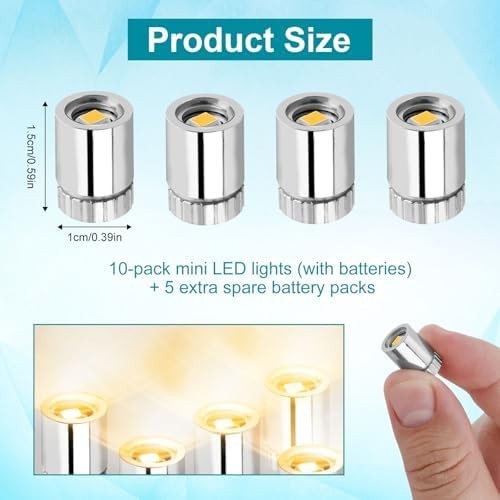 BRAND NEW Product Contents: You will receive 10 pieces of mini lights with batteries and 5 extra spare batteries. Sufficient quantity to meet your needs. Excellent Materials: Our small led light shell is made of plastic, which is reliable and not easy to damage. With good materials, you can use it with confidence. Easy to Use: Our small led light is very convenient to use. Just rotate to loosen the cover, remove the plastic sheet, and tighten it to light up. Product size: The size of our small led light is measured to be approximately 1.5x1cm/0.59x0.39in, small and lightweight, cute appearance, simple and versatile silver shell can perfectly decorate any item. Wide Application: Our LED mini lights are suitable for a variety of occasions and can be used to decorate paper lanterns, balloons, handmade doll houses, mini scene buildings, toy building blocks buildings, etc.