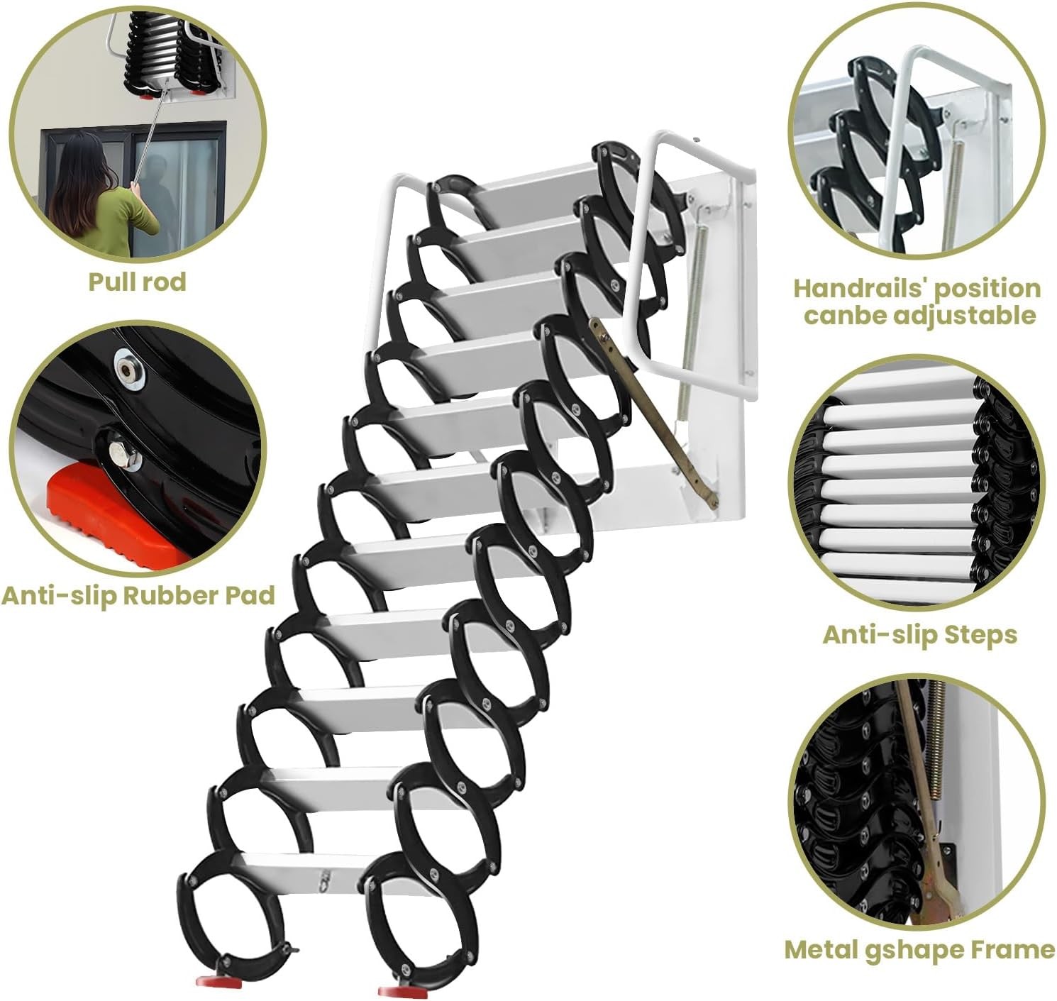 Anti slip rubber ladder feet The bottom of this folding attic ladder is equipped with anti slip rubber ladder feet, made of high elasticity rubber material, with a surface covered with micrometer sized suction cup patterns. When in contact with the ground, it automatically adheres and levels, and can form strong adhesion on various materials such as tiles, wooden floors, cement floors, etc., effectively preventing the stairs from moving or sliding when opened or closed. Rubber material combines wear resistance and shock absorption characteristics, buffering impact force when landing, reducing noise transmission, and protecting the ground from damage. solid ri vet All metal components are secured with solid rivets and have passed high-frequency vibration testing without loosening or cracking. The cold-pressing process eliminates the thermal damage caused by high-temperature welding, increasing connection strength by 20% compared to traditional welding methods. Even under extreme loads or frequent opening and closing cycles, the parts of the wall-mounted attic ladder remain tightly interlocked, fundamentally eliminating the risk of solder joint detachment and building a rock-solid overall structure. Fixed arm rest The surface of the folding ladder features a 3mm thick non-slip matte coating, ensuring a secure and comfortable grip. Internally, the armrest is built around a hollow steel-tube frame filled with shock-absorbing rubber, capable of withstanding longitudinal tensile forces of up to 1102 pounds without deformation. This design effectively shares the body's load during stair ascent and descent, alleviating pressure on the knees and lower back. This foldable wall mounted attic staircase is particularly suited for heavy lifting or use when mobility is limited, delivering a safe and comfortable stair-climbing experience. strut The folding support strut is constructed from reinforced steel. An angle-adjustment knob is mounted on its surface, enabling precise tilt calibration from 0° to 60°. This ensures the unfolded staircase remains perpendicular to the ground, providing stable support even on slightly uneven surfaces. A reinforced midsection enhances the strut's bending resistance, allowing a single support to bear a static load of up to 551 pounds. Combined with its S-shaped curves and solid rivet connections, it forms a three-dimensional load-bearing system capable of comprehensively adapting to complex installation environments. Baked paint spring The core power component—the coated spring—has undergon many times fatigue testing and certification. Its surface is protected by a thick epoxy coating and has passed salt spray test without any signs of rust, offering three times the corrosion resistance of conventional springs.The spring tension is precisely calibrated to match the weight of the staircase, ensuring a smooth, controlled descent without jerking when unfolded. When retracting, the wall mounted staircase with pull down system requires only a light push of 3kg to return automatically to its stored position.Combined with hydraulic damping technology, operating noise is kept below 45 dB, allowing elderly and female users to effortlessly open and close it with one hand. Even after a decade of use, the mechanism remains consistently smooth. Hand pulled lock buckle The bottom hand pulled lock buckle made of 304 stainless steel material has an accuracy error of less than 0.5mm between the lock tongue and the wall slot. When locked, it forms a 90 ° vertical grip and can withstand a horizontal tension of 100 pounds without detachment. In the unfolded state, the lock buckle and support rod form a triangular stable structure, effectively resisting the lateral sway of the stairs; After storage, the lock buckle automatically hides in the ceiling plane, with a surface level with the wall, without dust accumulation or collision, combining stability during use with aesthetics after storage Anti slip pedal The surface of the anti-skid pedal is treated with special technology, presenting a high-density diamond shaped concave convex texture. The friction coefficient is 40% higher than that of ordinary flat pedals, and it can still firmly grasp the sole in humid environments, effectively reducing the risk of slipping. The pedal width is up to 5.3 inch, designed with ergonomic stride and rounded edges to avoid collisions. Equipped with a anti slip front edge, our foldable staircase can maintain a stable center of gravity even when carrying heavy objects up and down, providing all-weather safety protection for the elderly, children, and people with limited mobility. S-shaped bent tube Breaking the limitations of traditional straight rod structures, the vertical pressure is evenly distributed to the two side supports through arc-shaped mechanical design, which increases the deformation resistance by 30% and can stably bear a dynamic load of 1102 pounds. The unique S-shaped curve not only enhances structural toughness, but also adapts to different tilt angles. After installation, it naturally adheres to the wall, balancing mechanical performance and spatial adaptability. Even with long-term high-frequency use, it is not easy to produce metal fatigue, laying a solid foundation for the core load-bearing structure of stairs. Anti loosening screw cap with embedded anti slip pad The key connections of folding stairs utilize anti-loosening screw caps with built-in non-slip pads. Inside each cap, a highly elastic silicone anti-slip gasket is embedded, creating a physical grip with the screw threads. This, combined with the external serrated anti-slip pattern, forms a dual-locking mechanism capable of withstanding high-frequency vibration amplitudes, improving anti-loosening performance by 50% compared to standard screws. Even under long-term vibration from repeated opening and closing, this ensures that the connections between the pedal, armrest, and support frame remain consistently secure, elimi