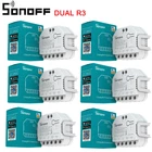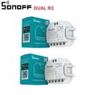 1-10PCS SONOFF DUAL R3/DUAL R3 WiFi MINI Switch With Power Metering 2 Gang Dual Relay Module For eWelink Alexa Google Home SONOFF DUALR3 takes your home to the next level. DUALR3 is a flush-mounted Wi-Fi smart dual relay switch module that is installed behind any standard switch to transfer it into a smart switch for wireless remote control with mobile devices or voice command. Unifying your home appliances into an integrated wireless network to make them communicate with one another which is convenient for you to manage and control, including lights, home appliances and motorized facilities like roller shutters, window shades, blinds, awning, etc. It’s TUV certified that provides a reliable quantity and advanced safety, without having to worry about the potential risk of fire and overheat. Three working modes available. DUALR3 comes with switch mode, motor mode and meter mode. One of the typical features is roller shutter and window shades smart control in the motor mode. The switch module offers the ultimate flexibility for your roller shutter and window shades by app remote control and scheduling timed events no matter whether you are home or away. Double two-way control. The double relay switch module distributes the load to two inputs compared to the simple relay, which this working mechanism lets you have two-way control for two devices independently. Power metering. What’s more, the module has an energy monitoring function that can be used to determine the exact energy consumption of the connected devices. In this mode, the load of electrical appliances connected with DUALR3 will always remain on and its relay status will not be changed on the app or the extra switch, used for power tracking and metering only. Powerful compatibility. In eWeLink app, you can manage your roller shutter to make it open, close and even stop at a certain position that you want. Designed to work with more switch types like the momentary switch, rocker switch, ON/OFF switch, dual momentary switch and ON/OFF/ON switch and then you can control your home appliances or motorized devices via the extra wall switch. Siri voice control. By setting up Siri shortcut in eWeLink that allows you to control your curtains with your voice. Even you can create a smart scene to make it keep linkage with other devices in your home, for example, ask Siri to close the curtain to trigger L1 Lite light strip on for an immersive movie night at home. NOTE: This link is for 1-20pcs combination of DUALR3, please confirm before purchase. DIY Your Automated Motorized Facilities DUALR3 can operate as a smart control module for 100-240V motors. Like tubular motor used in motorized curtains, blinds, roller shutter, awning, etc. Schedule to Open and Close for Comfortable Life Want to be awakened with the first ray of sunlight in the morning or adjust the percentage of curtain opening to avoid the light ruins your furniture? DUALR3 can help you easily realize, just connect it with your motorized curtain to enjoy your samrt life. Control It Wherever You Are Don't worry about the rain, close the window remotely. Creating an Atmosphere. Actually Simple DUALR3 works with other SONOFF products like L1. Just tell Siri and it will automatically close the curtain for you to create a romantic atmosphere. * Siri voice control is a shortcut of Siri in eWeLink. DUALR3 does not support Homekit temporarliy. Double Two-Way Control of Lights To control the lights via downstairs or upstairs switch? DUALR3 helps you! The working mechanism of DUALR3 allows you to achieve two-way control for two appliances respectively. Power Metering Helps You to save on Electricity Bills Want to turn off in schedule to save electricity bills? Want to check the real-time power of the appliances? Want to view historical power consumption? Keep Your Appliances always Be On-Meter Mode DUALR3 has a special working mode called meter mode. In this mode, the electtical appliance loads of DUALR3 will always remain on, the relay state will not be changed by APP or external switches. Only focusing on power monitoring and metering. Safety is Guaranteed Compatible with Your Existing Various Switch Types In addition to APP control, the original switch control can be retained. Specification of DUALR3 Power Supply: 100-240V AC Max Current: 15A(total),10A(1 gang) Max Power: 3300W(total) / 2200W(1 gang) Product Dimensions: 54*49*24mm Color: White Frequency: 802.11 b/g/n Security Mechanism: WPA-PSK/WPA2-PSK Humidity: 5%-95%RH, Non-condensing Enclosure Material: Fire-retardant ABS V0 Operating Temperature: -10ºC-40ºC Gang: 2 Product Details