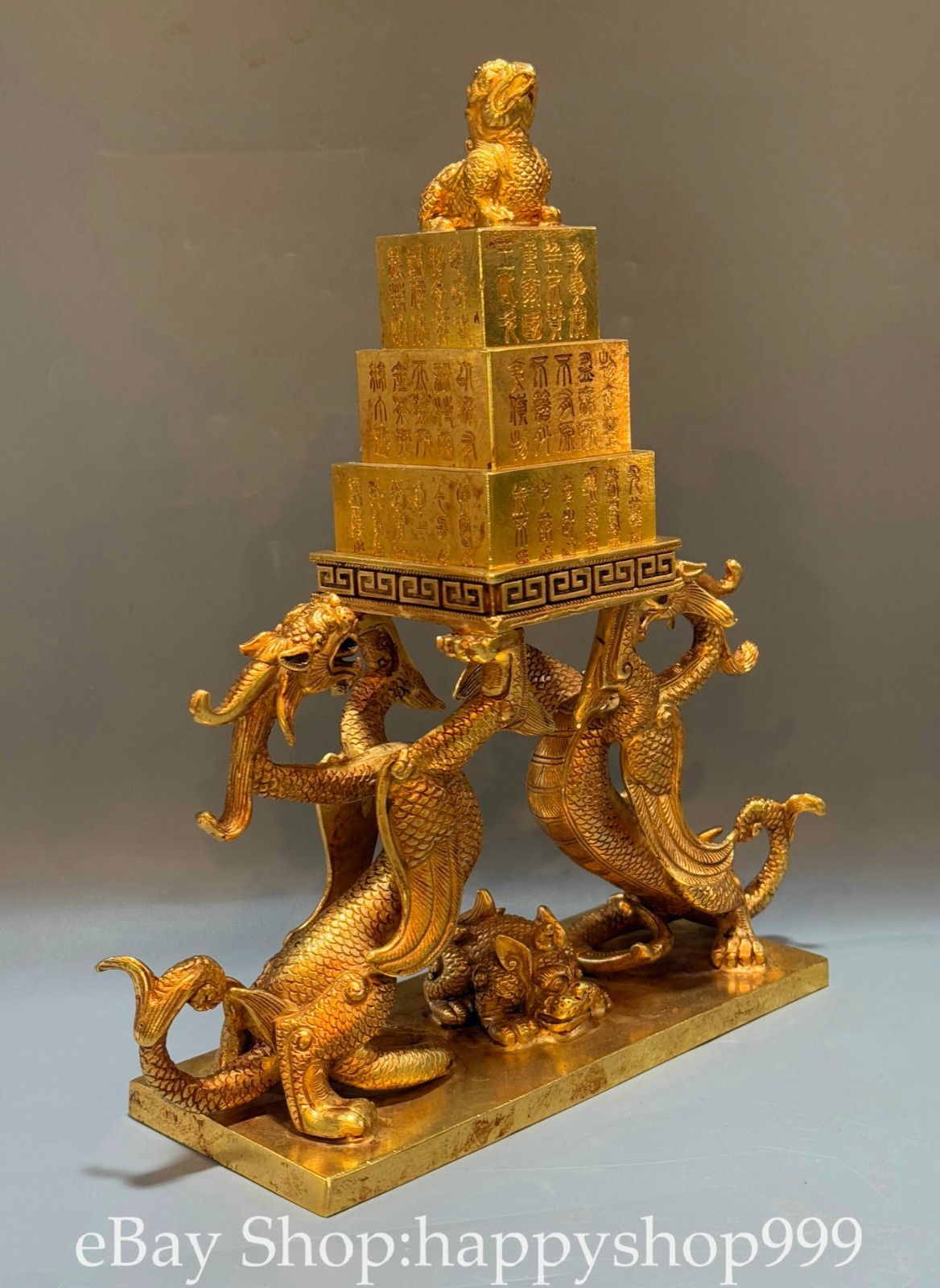 11.2" Chinese Bronze 24K Gilt Gold Dragon Beast Statue Seal Stamp Signet Set You are bidding for a 11.2" Chinese Bronze 24K Gilt Gold Dragon Beast Statue Seal Stamp Signet Set . It is in good condition without broken or fixing as photos showing and rare style from antique market. This is a great piece of valuable collection, a valuable personal alter or a very good present. the handwork is very fine with incredible detailling. Don't miss out this chance to get it . All the items we are showing is only one available and You will get the same one as photos. Condition Material : Bronze 24K Gilt Gold Origin : Chinese Style : Same as photos showing Size : High 11.2 Long 9.8 Breadth (inch) Weight : 5.0 KG----included the weight of packing materials Shipping cost by EMS or SF express (5-12 days) : Free Shipping. Terms of Sale We recommend the combine shipping and wholesale order , If you won more items once that we will give you a 5-10% di7scount off the price. Also We encourage you to make an offer if you're interested. Each piece is a testament to traditional craftsmanship and will make a stunning addition to any collection or home decor. Our priority is to ensure your satisfaction. Feel free to reach out with any questions or for additional information. Thank you for considering our items. About us We are business in Asian Antique and old collectable items over 12 years. My father is running them from China, korea, Singapore,Japan and Nepal every year and hold many rare items in stock. They are inculding the diference style porcelian , Cloisonne , Bronze。 Pottery . Silver also jade carving from difference time period. We are looking towards to have the friends online for working each other and learning. Thank you. Contact Me If you're in any way dissatisfied with your purchase or any problem of your order condition , Please let me know through "MY MESSAGES" or "Ask Seller Questions" though eBay. We will quickly to answer and try best to resolve it well for your happy . We are committed to ensuring that you are completely satisfied with every transaction. 100% Satisfaction guaranteed ! We will reply your mail with in 24 hours normally. Thanks for looking! We believe you will enjoy with our other items too !