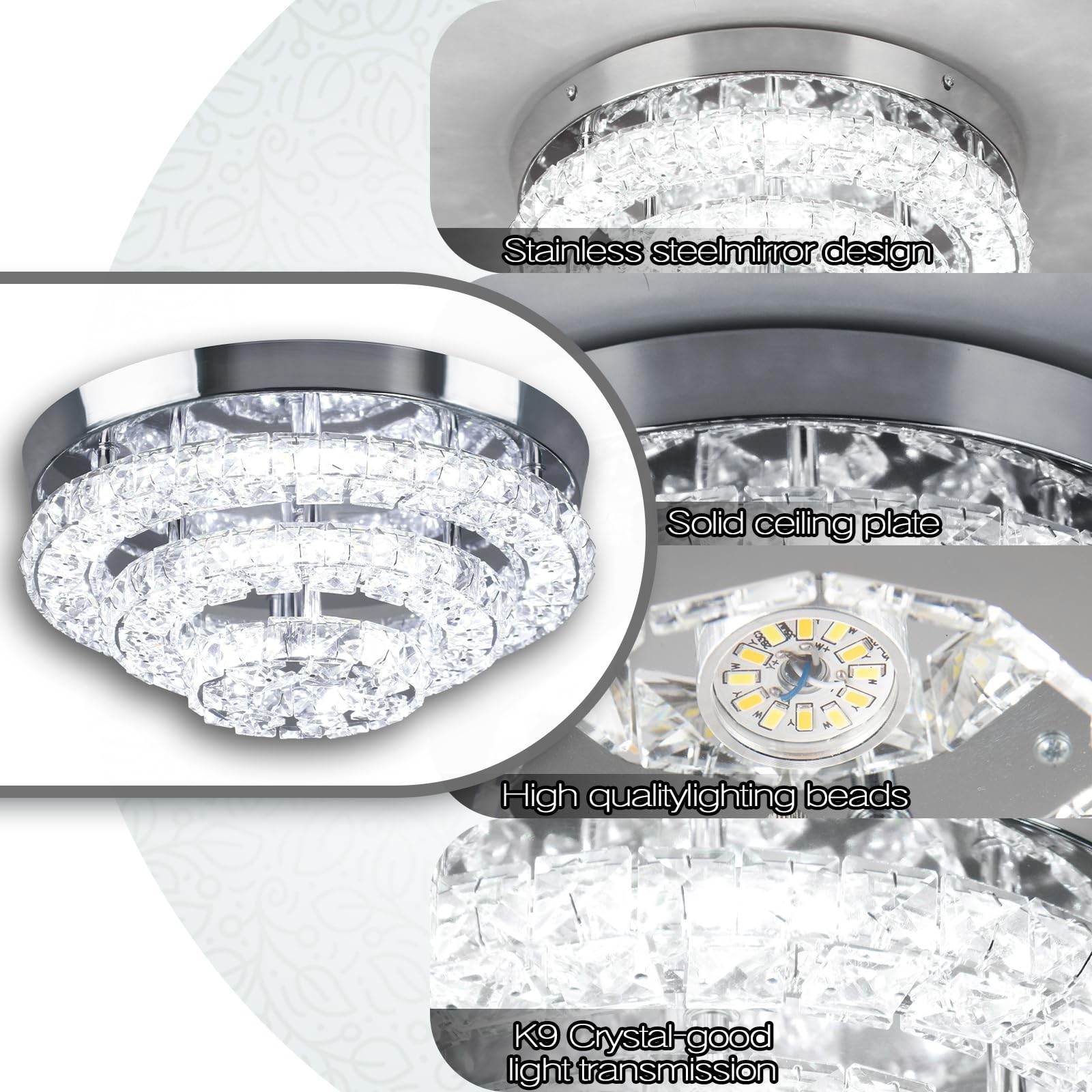 B0D6B1ZYFH 【Modern Crystal Ceiling Light】This chandelier size: 11.8” x 11.8" (30cm) and the overall height is 5.2 inches, Max Power 32W, LED-chip,AC: 85-265V; Light color: 6500K Cool White.Offering a cool white color temperature of 6000K. Save time and money on buying and replacing bulbs.Remote control not including! 【Ceiling Lamp Crystal Detail】 Crafted with a combination of stainless steel and K9 crystal, this small chandelier emits a sparkling lighting effect. 11.8-inch base diameter, Mirror polished finish, adorned with exquisite cut crystal pendants. 【Chandeliers Light Fixture】Perfectly integrated into a modern aesthetic, the striking design and elegant look are sure to enhance the ambience. It is a great choice for a thoughtful housewarming gift. 【Chandelier Versatile Applications】 Ideal for indoor decoration, this LED crystal chandelier is suitable for various settings such as the living room, dining room, bedroom, kitchen, hotel room, foyer, office, and hallway, adding a touch of elegance to any space. 【Simple Installation】Includes instructions and all necessary mounting hardware for hassle-free setup. Reach out to us for assistance with any quality issues or concerns about your purchase.