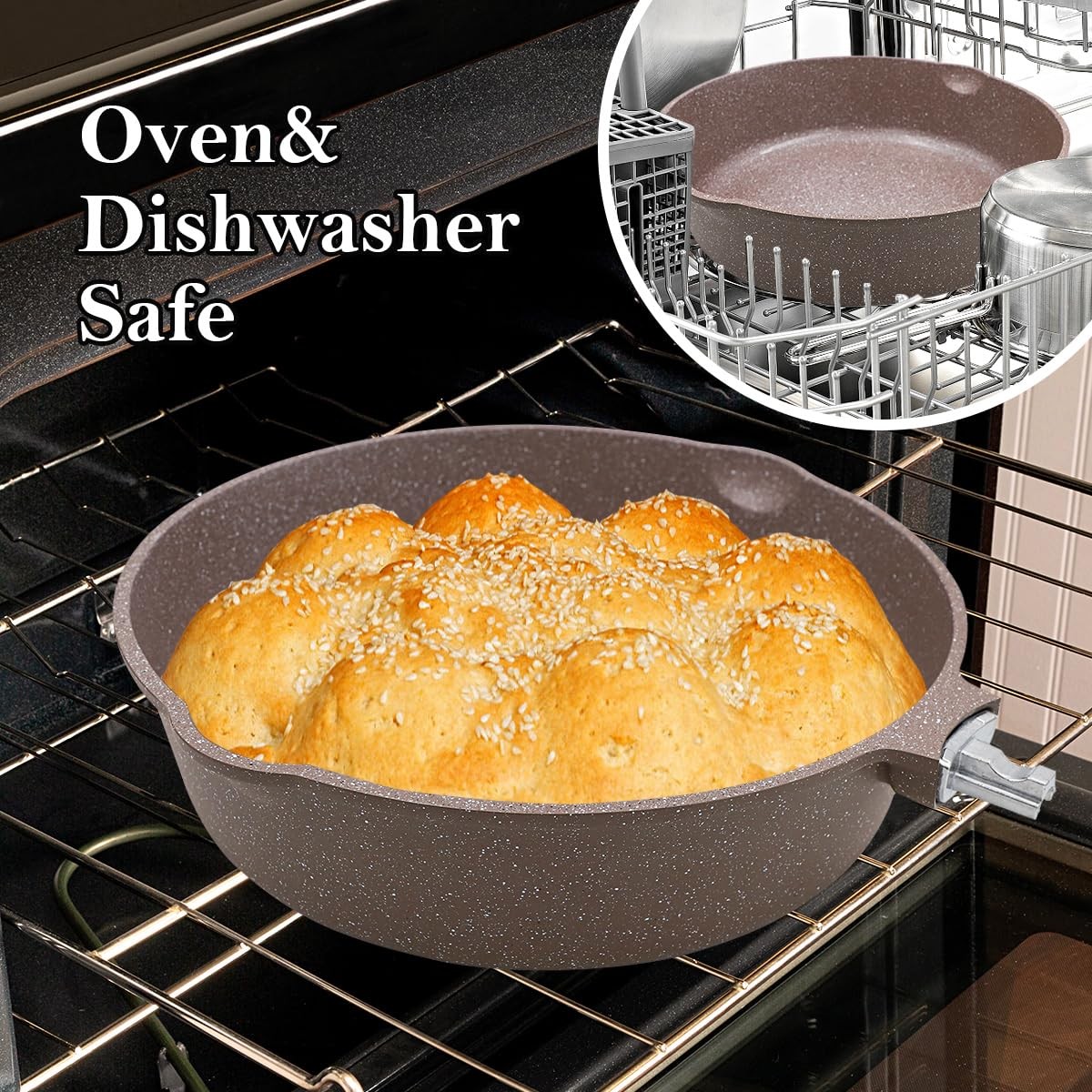 【DURABLE CERAMIC COATING】The 11 inch frying pan is made of natural ceramic coating and free from PFAS, PFOA, lead or cadmium. frying pan glass lid with a silicone seal that can be removed for cleaning. For a healthier and more enjoyable cooking experience at home. 【PREMIUM MATERIAL】The 11 inch nonstick ceramic frying pan with lid is made of high-quality aluminum, which allows better heat storage and distribution than conventional cast iron pans. Suitable for most heating methods. It is recommended to use low or medium heat for cooking. 【11 INCH CERAMIC FRYING PAN WITH REMOVABLE HANDLE】Easily removable by pressing the red button. Removable handle for more stability and no wobbling. Oven & dishwasher safe (without handle). Recommend hand washing to prolong the life of the deep frying pan. 【HEALTHY COOKING】The non-stick ceramic frying pan can be used for a variety of delicious dishes, such as frying vegetables, frying eggs, frying fish or frying steaks! 【NONSTICK CERAMIC FRYING PAN SPECIFICATION】1 *11 inch deep frying pan, 1 *Silicone lid, 1*Silicone Spatula. Non-stick saute pan size: Ø 11 inch, 3.1 inch high, 5 Quart large capacity. The pan with lid is deeper than a conventional frying pan. Please do not hesitate to if you have any questions.
