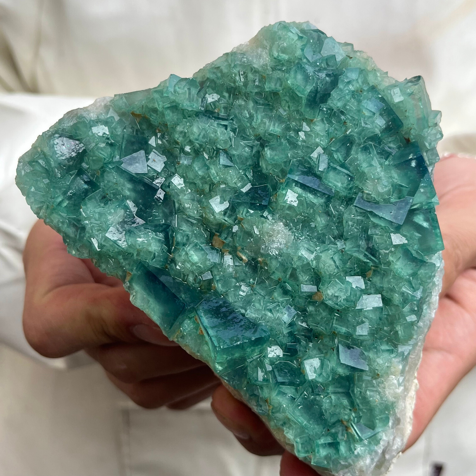 Amazing blue green hues in the fluorite. Item got here super quickly and it was wrapped completely in bubble wrap and tape. It looks exactly like the picture. It’s a solid chonk of a rock with interesting white flecks of crystal on the bottom. A+ transaction!!!
