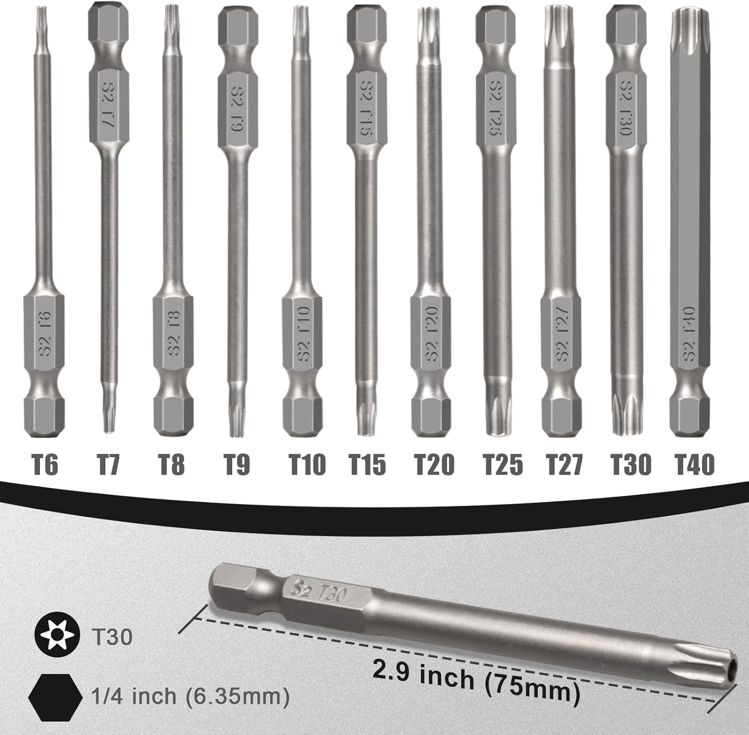 Torx Head Bit Set 02, 11-Piece 1/4 Inch Hex Shank T6 T7 T8 T9 T10 T15 Silver Description: Features: 【S2 Steel Material】:The torx head screwdriver bits are made of S2 alloy steel, hard, durable and anti-rust. The screwdriver bits are polished and have a smooth finish, friendly to use 【11-Piece Screwdriver Drill Bits】: T6, T7, T8, T9, T10, T15, T20, T25, T27, T30, T40, which can meet your various needs. 【Strong Magnetic】: The magnetic screw drill tip helps to suck the screw when in use, so it won't damage the screws and the screwdrivers. 【Easy to Use】: Directly insert the Torx Head Screwdriver drill bits into your tool, as long as it is inserted, it will not fall off easily. You can easily use them on vehicles, bicycles, furniture, engineering, machinery, home appliance repairs, etc. 【Widely compatible】: The Torx Bit Set are suitable for electric screwdrivers, hand screwdrivers, electric drills, air drills and other tools.But please note that it cannot be used for impact drills and electric wrenches SHIPPING: We are always working hard to ensure your package arrives as soon as possible. Please understand that some factors like weather, high postal traffic, and the performance of shipping companies are outside of our control. We offer free shipping to the lower 48 states and ship within 3 business days of payment, usually sooner. We do not accept P.O. Boxes. Please provide a physical address. For shipping outside of the continental USA, we only use eBay's Global Shipping Program. The item is shipped to KY and then sent to the rest of the world. International customers are responsible for all duties and taxes. Continue to check out in order to calculate costs for shipping the item to your country. Messages regarding eBay's Global Shipping Program MUST be directed at eBay EXCLUSIVELY. PAYMENT: We accept payment by PayPal only (Can accept all kind of credit cards). Please pay as soon as possible after winning an auction, as that will allow us to post your item to you sooner. Payment must be received within 3 business days of auction closing. Before buying, please make sure your PayPal and eBay address is correct. If not, please correct it before payment. We have confidence in our products, but if you are not fully satisfied please contact us within 30 days of purchase and you will get full refund of your money. Return the product in the same condition you received it. Please note - return shipping will be paid by the buyer.