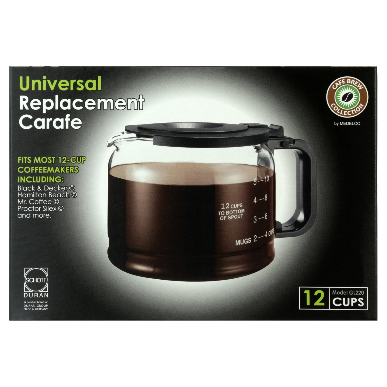 This carafe is packaged with a lid adaptor to expand the fit. The position of the "pause and serve" or "sneak a cup" feature on your coffee maker will determine if you need to use the adaptor.12 Cup Black color Height: 4.88" Height with Adaptor #1: 5.63" Diameter of pot: 6.25" Diameter of base: 4.25" Pause & serve. 12-Cup Traditional-Style Replacement Glass Coffee Carafe Household Appliance Accessories: Product Dimensions: Height: 5.1″, 130mm Height with Adaptor: 5.7″, 146mm Diameter of pot: 6.1″, 156mm Diameter of base: 4.2″, 106mm MODEL #GL220: PRODUCT INSTRUCTIONS: This replacement carafe is packaged with a lid adaptor. You will need to test the carafe to determine if the lid adaptor is required to trigger the “Pause & Serve” feature on your coffeemaker. To test the carafe: 1. Fill your coffeemaker with 2 cups of water; 2. Insert the carafe into the coffeemaker; 3. Turn on the coffeemaker. If the lid has properly activated the “Pause & Serve” feature, the water will flow into the carafe. If the water does not flow into the carafe, insert the lid adaptor into the lid center hole and retest. IMPORTANT SAFEGUARDS: A damaged carafe may result in burns from a hot liquid. Follow the instructions below to reduce the risk of breaking the carafe: The carafe is for household use only The carafe must never be used on a range top. Do not set a hot carafe on a wet or cold surface. Keep the lid on the carafe when in use. Do not use a carafe having a loose or weakened handle. Discard the carafe if chipped, cracked or damaged in any manner. Discard the carafe immediately if it is ever boiled dry. Do no subject carafe to impact, scratches or rough handling as this may weaken glass. CLEANING & PRODUCT CARE: Do not clean the carafe with abrasive cleansers, scouring pads or other abrasive materials; they will scratch and weaken the glass which may cause the carafe to break. Use only sponge, plastic or nylon wash pads with soapy water when washing by hand. Dishwasher top rack safe. Avoid carafe contact with other items in dishwasher.