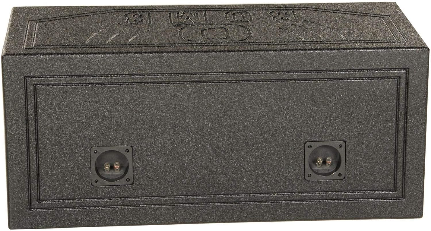 Dual 12 Inch Sub Box vented enclosures designed to hold 2 Subwoofers (not included) playing your music; Rock out and let the streets hear your anthems Dual-chamber design of 12 inch speaker box makes your sound twice as hard; Strong bass and smooth audio enhancement by your 12 inch subwoofer box will make your ride twice as fun Keep yourself and your 12in car speakers safe with a shared slot port vent design inside the 2 12 inch subwoofer box that ensures the speakers stay cool Put some class in your car with the 12 inch subwoofer enclosure built with durable black bed liner spray finish; Impress your friends and family with a stylish yet tough 12 inch subwoofer speaker box Dimensions (L x W x H): 14 x 32 x 13.25 inches, Cutout diameter: 11 inches, Air space (per sub): 1.5 cubic feet, MDF construction: 0.75 inch, Tuning frequency: 40 hZ Product Description Durable Bedliner Spray Finish Behind Seat Design
