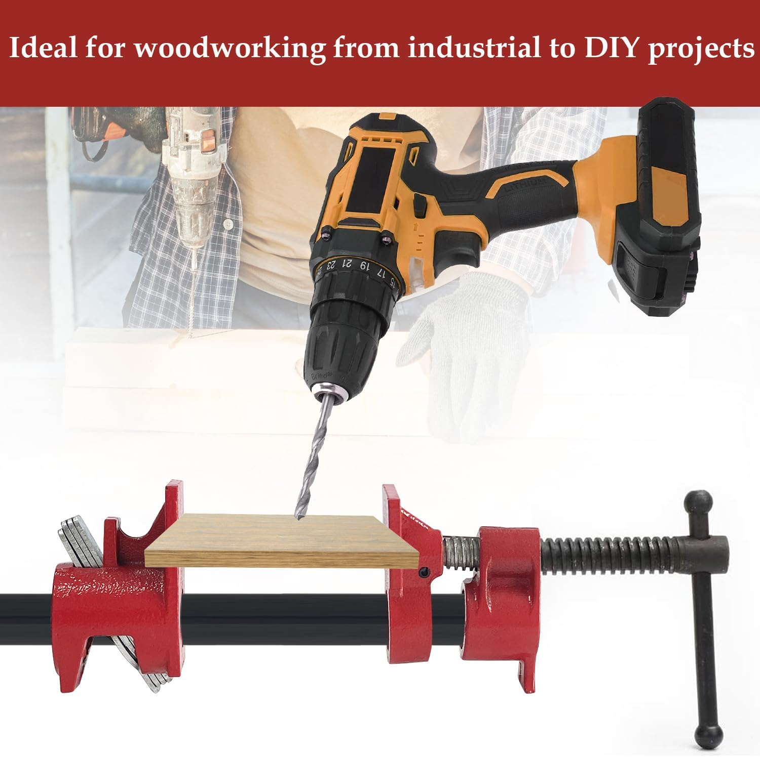 Store New Arrivals Add to Favorite View Feedback Contact Pipe Clamps 1/2 Inch 2 PACK Wood Gluing Pipe Clamp Set Bar Clamps Heavy Duty Woodworking Cast Iron Clamp Fixture (1/2 Inch) Description Item model number clamp pro50 Style 1/2 Inch Power Source hand_powered Color Red Material Cast Iron Country of Origin China Batteries Required? No Item Weight 1.62 Kilograms Batteries Included? No Package Dimensions 6.73 x 4.96 x 4.29 inches Included Components clamps Package Include 2 sets of 1/2-inch pipe clamps, total weight is about 3.3lbs. Made of premium cast iron with painted surface which is rust-resistant and wear-resistant, our clamps are durable and designed for long service time. Ergonomic design providing smooth rotary, comfortable operation and reduced hand fatique. Easy to assemble, just insert pipe into threaded end of the pipe clamp, another section slides along the pipe to match the size of your working piece. Perfect for assembly, gluing, construction, maintenance and woodworking projects. Product Description Features Premium Material Made of premium cast iron with painted surface which is rust-resistant and wear-resistant, our clamps are durable and designed for long service time. Multiple Plate Clutch Pipe clamps with four plate clutch for heavy duty woodworking, could prevent pipes from slipping. Ergonomic Handle Ergonomic design providing smooth rotary, comfortable operation and reduced hand fatique. Adjustable Clamp Length Easy to assemble, just insert pipe into threaded end of the pipe clamp, another section slides along the pipe to match the size of your working piece. Practical Tool Perfect for assembly, gluing, construction, maintenance and woodworking projects, ensure professional and efficient woodworking operations. ABOUT US We offer the best prices around on high quality products. Our E-store includes media such as books, movies, music and games while offering electronics, toys, sporting apparel, clothing, tools, general home, garden items and more. SHIPPING We are always working hard to ensure your package arrives as soon as possible. Please understand that some factors like weather, high postal traffic, and the performance of shipping companies are outside of our control. We offer free shipping to the lower 48 states and ship within 2 business days of payment, usually sooner. We do not accept P.O. Boxes. Please provide a physical address. RETURNS We offer a 30-Day Return Policy on items which you are not completely satisfied with. You have the option for a full-refund or an exchange of the item. No returns are available on items shipped outside of the USA. PAYMENT We accept PayPal. CONTACT US This page content is yet to come Please ad us to your favorite seller and visit again later Thank You CUSTOMER SATISFACTION We try our very best to make sure every customer is completely satisfied. If there's a problem, message us! We're happy to help.