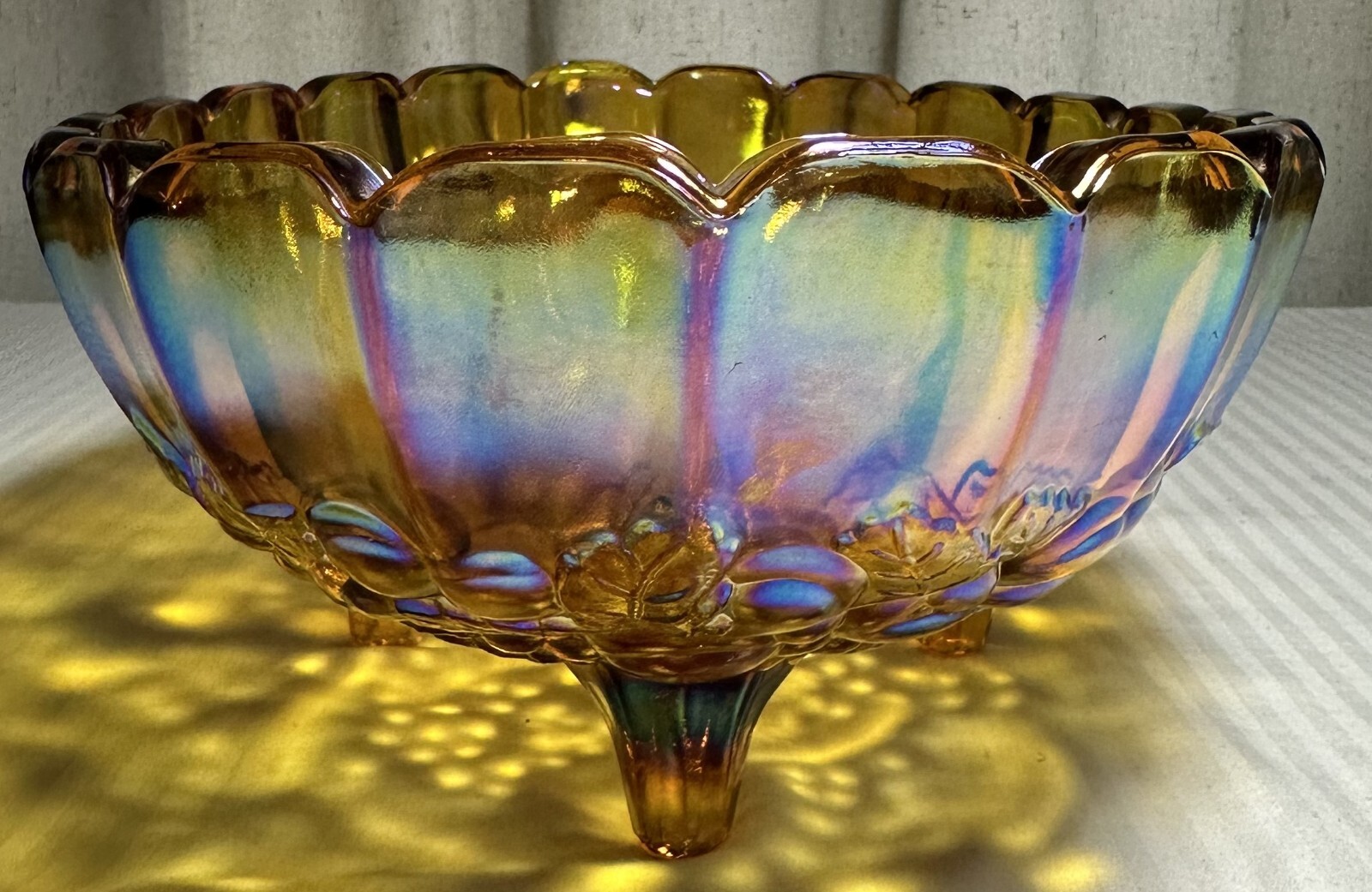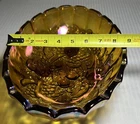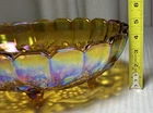 Elevate your home decor with the captivating Oval Footed Fruit Bowl from Indiana Glass, showcasing the timeless Harvest Grape pattern. This exquisite piece, dating back to the 1960s, is a testament to the enduring charm of American glassware. The iridescent amber carnival harvest grape design brings a touch of vintage elegance to any setting, making it an ideal centerpiece for all occasions.Crafted in the United States, the bowl measures a generous 12 inches in length, with a width of 8-3/4 inches and a height of 4-1/2 inches. The glossy finish, scolloped top rim and footed, decorative features underscore its high-quality craftsmanship. Whether used for special gatherings or displayed as a standalone piece, this glass bowl is a striking addition to your collection. This bowl is in excellent shape, no cracks for chips. Please look at photos for description and condition. If you have any questions, please leave me a message. Thank you for looking!