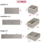 1, Classify Underwear, Bras, Socks, Ties, Scarves, Shirt, T-shirt, Underpants, Undergarment, accessories etc. Easy to find which you want to wear and never need to ransack all of your clothes. 2, These storage containers drawers Includes 4 large square organizer bins, 4 small square organizer bins, and 4 medium rectangular organizer bins that can hold a variety of personal items. These baskets dividers fits men, women. 3, The Collapsible cloths Storage Boxes Dresser Drawer organization set lightweight solution and easy carrying to many personal storage needs. These adjustable compartments can be used for closet, bedroom, shelf, wardrobe, chest of drawers, under bed storage, desk, nursery, office. 4, Made from non-woven fabric and Cardboard. Dresser drawer organizers measurements are: 11" X 11" X 4.7", 5.5" X 5.5" X 4.7", 11" X 5.5" X 4.7" (4 of each size). Color: Grey. 5, SPACE SAVING YOUR CABINET: Can be folded flat to save space when not in use. Multi-Purpose, Great for clothes, underwear, bras, socks, makeup, belt, lingerie, panty, clothing, sweatshirts. Classify Underwear, Bras, Socks, Ties, Scarves, Shirt, T-shirt, Underpants, Undergarment, accessories etc. Easy to find which you want to wear and never need to ransack all of your clothes. These storage containers drawers Includes 4 large square organizer bins, 4 small square organizer bins, and 4 medium rectangular organizer bins that can hold a variety of personal items. These baskets dividers fits men women. The Collapsible cloths Storage Boxes Dresser Drawer organization set lightweight solution and easy carrying to many personal storage needs. These adjustable compartments can be used for closet, bedroom, shelf, wardrobe, chest of drawers, under bed storage, desk, nursery, office. Made from non-woven fabric and Cardboard. Dresser drawer organizers measurements are: 11" X 11" X 4.7", 5.5" X 5.5" X 4.7", 11" X 5.5" X 4.7" (4 of each size). Set of 12. Color: Grey. SPACE SAVING YOUR CABINET: Can be folded flat to save space when not in use. Multi-Purpose, Great for baby clothes, underwear, bras, socks, makeup, belt, lingerie, panty, clothing, sweatshirts.