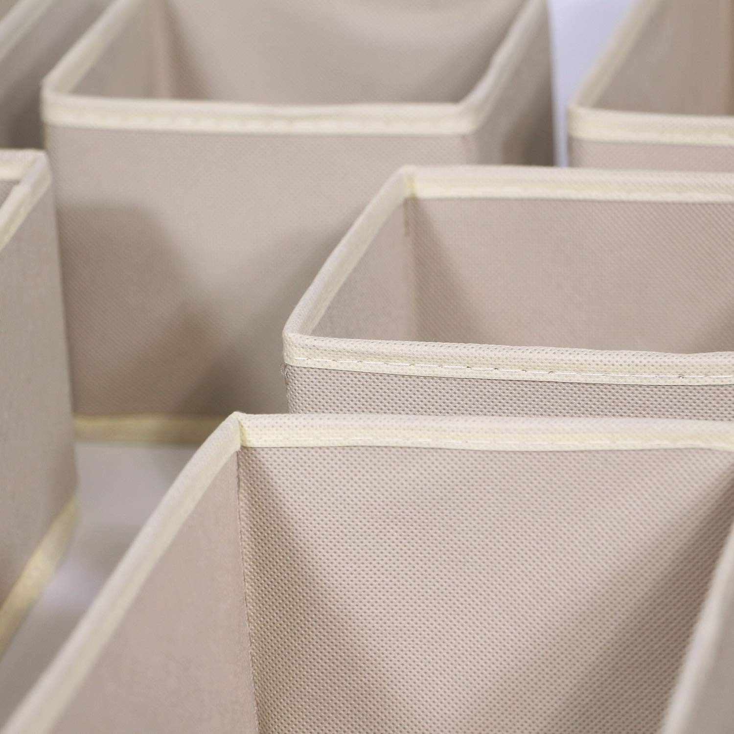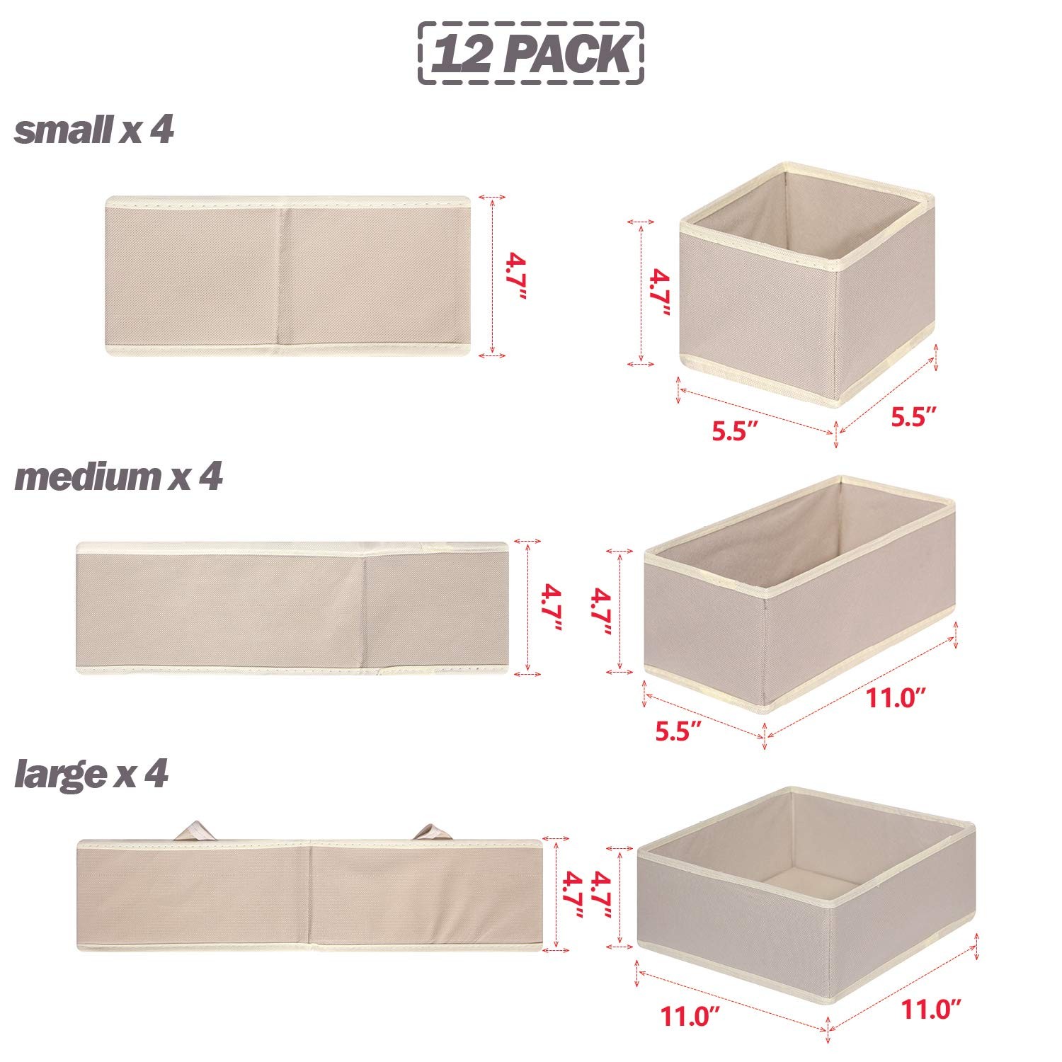 1, Classify Underwear, Bras, Socks, Ties, Scarves, Shirt, T-shirt, Underpants, Undergarment, accessories etc. Easy to find which one you want to wear and never need to ransack all of your clothes. 2, These storage containers drawers Includes 4 large square organizer bins, 4 small square organizer bins, and 4 medium rectangular organizer bins that can hold a variety of personal items. These stackable baskets dividers fit for men, women, male, baby, children, kids, girls, boys. 3, The Collapsible cloths Storage Boxes Dresser Drawer organization provides lightweight solution and easy carrying to many personal storage needs. These soft adjustable compartments can be used for closet, bedroom, shelf, bathroom, wardrobe, chest of drawers, under bed storage, desk, bookshelf, nursery, office. 4, Made from non-woven fabric and Cardboard. Dresser drawer organizers measurements are: 11" X 11" X 4.7", 5.5" X 5.5" X 4.7", 11" X 5.5" X 4.7" (4 of each size). Color: Beige. 5, SPACE SAVING YOUR CABINET: Can be folded flat to save space when not in use. Multi-Purpose, suitable for clothes, underwear, bras, socks, makeup, belt, lingerie, panty, clothing, diapers, sweatshirts, toys, crafts. Classify Underwear, Bras, Socks, Ties, Scarves, Shirt, T-shirt, Underpants, Undergarment, accessories etc. Easy to find which one you want to wear and never need to ransack all of your clothes. These storage containers drawers Includes 4 large square organizer bins, 4 medium rectangular organizer bins, and 4 small square organizer bins that can hold a variety of personal items. These stackable baskets dividers fit for men women male baby children kids girls boys. The Collapsible cloths Storage Boxes Dresser Drawer organization provides lightweight solution and easy carrying to many personal storage needs. These soft adjustable compartments can be used for closet, bedroom, shelf, bathroom, wardrobe, chest of drawers, under bed storage, desk, bookshelf, nursery, office. Made from non-woven fabric and Cardboard. Dresser drawer organizers measurements are: 11" X 11" X 4.7", 5.5" X 5.5" X 4.7", 11" X 5.5" X 4.7" (4 of each size). Set of 12. Color: Beige. SPACE SAVING YOUR CABINET: Can be folded flat to save space when not in use. Multi-Purpose, suitable for baby clothes, underwear, bras, socks, makeup, belt, lingerie, panty, clothing, diapers, sweatshirts, toys, crafts.