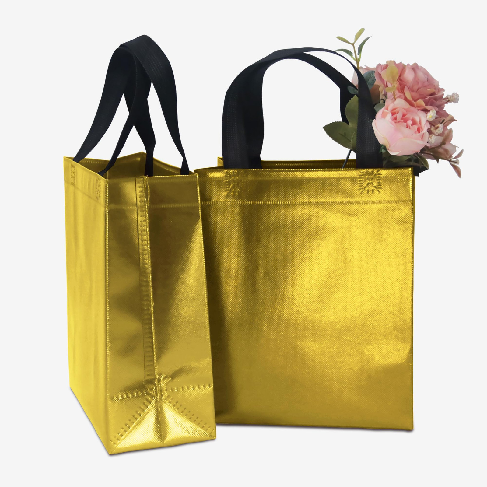 PREMIUM MATERIALS: This gold gift bags are made of high-quality non-woven fabric, so it can withstand heavier weight, stronger and not easy to break. ELEGANT & BEAUTIFUL: This shiny gift bags have a charming metallic luster on the surface, the appearance is beautiful gold, the handle is black, elegant and beautiful, fashionable and exquisite, as a gift bag is absolutely unique and attractive. REUSABLE: This reusable gift bags are made of strong and durable non-woven material, the surface is waterproof, the bottom is matched with cardboard, it can withstand heavier items, while ensuring that the bottom is flat, it can be used daily as a shopping bag, grocery bag, economical and practical. MULTIPLE OCCASIONS: This metallicl gift bags are suitable for various occasions, you can DIY various words and patterns with stickers or paint pens (please stay away from heat sources), which is very suitable for christmas, diwali, wedding, birthdays, party and other occasions. SIZE INFORMATION: The size of the gold gift bags are 8 x 4 x 10 inches/20 x 10 x 25 cm (L x W x H) , it can hold most gifts and enough party supplies.