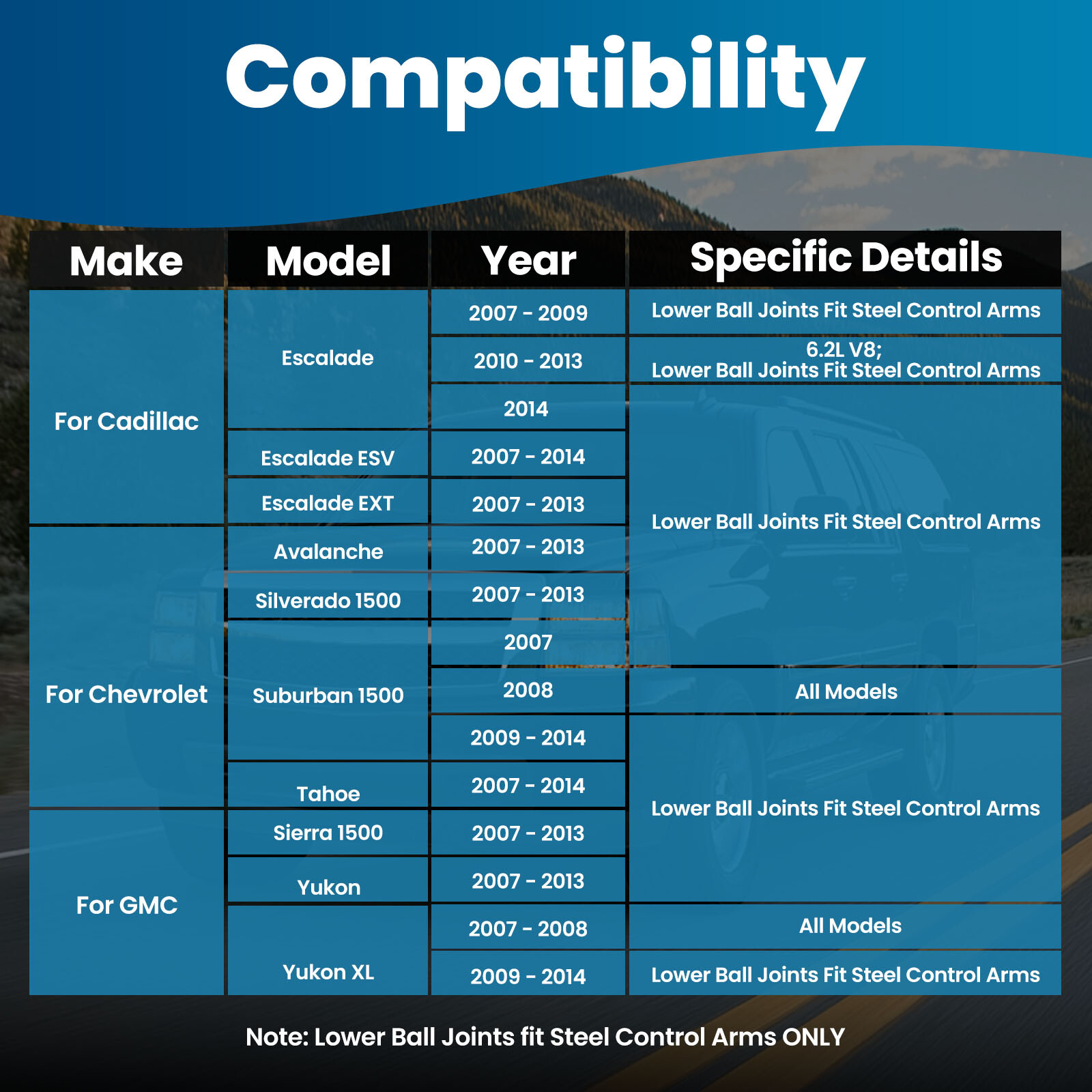 zjpss LOGO Home Contact us Promotion WHY CHOSE US Manufacturer We know our products Easy Return Quick, Simple Guaranteed Fitment Always the correct part PRODUCT DISPLAY 12 Pcs Control Arm with Ball Joint Assembly for GMC Sierra 1500 2007 - 2013 Fast Shipping International Shipping 30 Days Return Policy Secure Shopping DESCRIPTION 12 Pcs Front Upper Control Arm & Tie Rod Sway Bar For Silverado Application: for Cadillac Escalade 2007 - 2009 Lower Ball Joints Fit Steel Control Arms for Cadillac Escalade 2010 - 2013 6.2L V8; Lower Ball Joints Fit Steel Control Arms for Cadillac Escalade 2014 Lower Ball Joints Fit Steel Control Arms for Cadillac Escalade ESV 2007 - 2014 Lower Ball Joints Fit Steel Control Arms for Cadillac Escalade EXT 2007 - 2013 Lower Ball Joints Fit Steel Control Arms for Chevrolet Avalanche 2007 - 2013 Lower Ball Joints Fit Steel Control Arms for Chevrolet Silverado 1500 2007 - 2013 Lower Ball Joints Fit Steel Control Arms for Chevrolet Suburban 1500 2007 Lower Ball Joints Fit Steel Control Arms for Chevrolet Suburban 1500 2008 All Models for Chevrolet Suburban 1500 2009 - 2014 Lower Ball Joints Fit Steel Control Arms for Chevrolet Tahoe 2007 - 2014 Lower Ball Joints Fit Steel Control Arms for GMC Sierra 1500 2007 - 2013 Lower Ball Joints Fit Steel Control Arms for GMC Yukon 2007 - 2013 Lower Ball Joints Fit Steel Control Arms for GMC Yukon XL 1500 2007 - 2008 All Models for GMC Yukon XL 1500 2009 - 2014 Lower Ball Joints Fit Steel Control Arms Lower Ball Joints fit Steel Control Arms ONLY Feature: * 100% brand new in box * Silver Powder Coated Control Arm * All of our products undergo rigorous testing to assure high quality * Provides maximum performance, direct replacement for your damaged item * Fully assembled and ready to install. Easy 100% bolt in installation Package Includes: 1x Front Upper Left Control Arm + Ball Joint - K80669 1x Front Upper Right Control Arm + Ball Joint - K80670 2x Front Sway Bar Stabilizer Link - K700432 2x Front Lower Ball Joints - K6541 2x Front Inner Tie Rod Ends - EV800084 2x Front Outer Tie Rod Ends - ES800223 2x Rack and Pinion Boots & Bellows ( As Picture Shown) Part Number: K80669 K80670 K700432 K6541 EV800084 ES800223 Note: * Please feel free to contact us for whatever we can help via eBay message. * Instruction is not included. Professional installation is highly recommended. SHIPPING US Domestic Shipping Notice - All items will be dispatched within 24hrs(Mon-Fri) Our carrier collects all the parcels at 4:30am PDT, any payment paid after 5:00am PDT will be shipped the next day at 4:30am PDT. If you paid Item Shipped On Est.Delivery Time Before Apr. 1st at 4:30am Apr. 1st at 5:00am Apr. 5th - Apr. 7th After Apr. 1st at 4:30am Apr. 2nd at 5:00am Apr. 6th - Apr. 8th If our estimated delivery time and eBay’s are contradictory,please refer to the standard delivery time of ours. Estimated Delivery Time From To Service Est.Delivery Time US US UPS or Fedex Ground 3-5 Business days Outside of US DHL FedEx 4-7 Business days Tracking number will be updated in 24 hours after shipment Please provide the following shipping information for your order Full physical address Telephone number Otherwise your shipment will be deferred. We are not responsible for any shipping lost caused by wrong shipping information Shipping rate If our ebay item listing doesn't show the shipping cost to your place. Please contact us to calculate the shipping fee for you. International Shipment For international shipment, we do not cover any import taxes or duties. Import tax is charged by the government, not us. Our item price and shipping cost do not include any import tax which will be charged by the shipping company when you got the parcel. Please be noted that is not the extra shipping fee. ` NO hidden charge!!! WARRANTY Free 2 Year Warranty: All AutoModPlanet products have 2 year warranty (unless otherwise stated). In the very unlikely event that you have a problem with our product, please contact us via eBay messages. Easy Return: If you are unhappy with your purchase for any reason, you can return it to us in an un-used condition in the original packaging within 30 days of purchase and we'll give you a refund or exchange. The refund/Exchange will not include postage/eBay costs. Please note you MUST contact us to obtain a Return Authorization Number before returning any part. Any parcel without the Return Authorization Number will be rejected. If your item is faulty or was incorrect, you must contact our sales representative before returning the parcel and we will endeavour to solve the problem effectively. Video or picture is required to show the item condition before we issue the Return Authorization Number. Important notice: 1. Any returned item(s) without Return authorization number will be rejected. 2. Please return your item(s) in original packaging and ensure that all packages are securely wrapped 3. We will not accept responsibility for loss or damage of goods during transit, please ensure that the insurance cover option is taken where possible 4. Upon receipt, all products will be inspected at our discretion in 3-5 business days. Then, the updated result will be informed. If you have made a mistake on purchase and wish to cancel the order before it is dispatched please contact us by ebay massages or email as quickly as possible. Note: All parcel will be collected by carrier at 8:00am on Monday to Friday. FAQ Will this fit my car? We have used the eBay compatibility list as a guide for buyers to use, but the eBay data system is not accurate and incomplete sometimes. Please make sure you have read through the whole listing and paid attention to “note” and “notice”. If there is any uncertain, please use the eBay message to check with our sales first. How much does delivery cost and how long will it take? You can check the delivery cost in the listing “Shipping and payments” section by selecting your country and entering your zip code. If it is