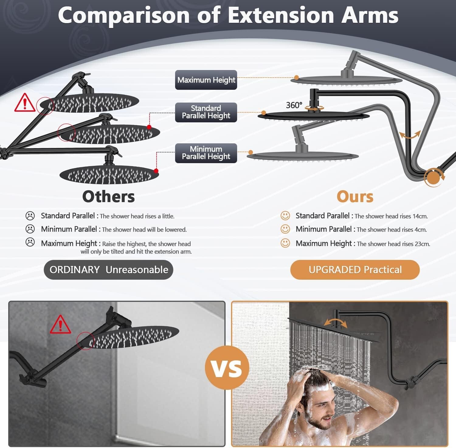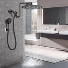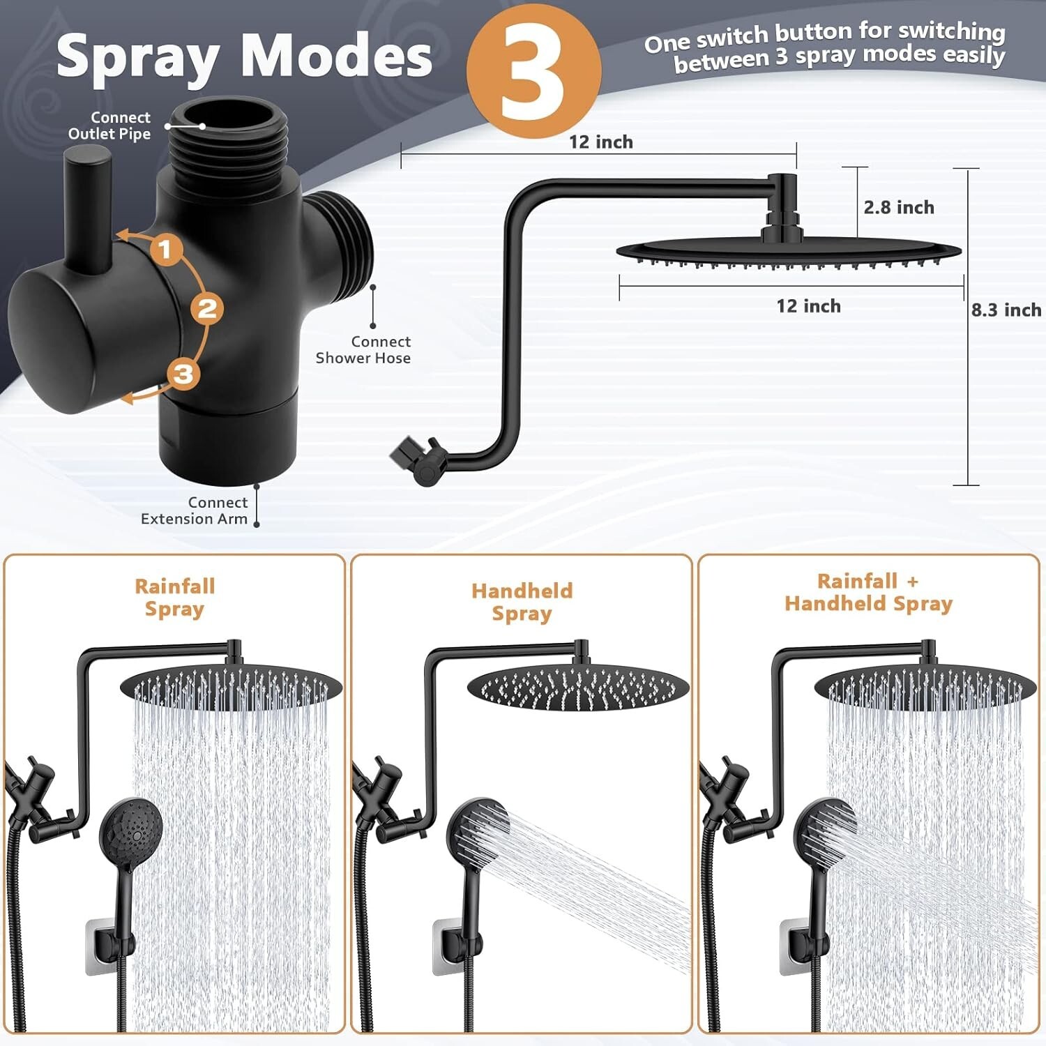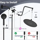12" Rainfall Shower Head with Handheld Combo, High Pressure Shower Heads with Upgraded 12" Adjustable Curved Shower Arm, 6 Settings Handheld Shower Head Built-in Power Wash Anti-leak Matte Black Upgraded 12"Adjustable Shower Extension Arm: shower head combo is equipped with upgraded Z-shaped shower arm, the height can be adjusted up and down, so that your large size shower heads is always vertical, will not hit the shower arm. The upgraded shower arm won't tilt out of the water like a normal straight shower arm, allowing you to enjoy an excellent bathing experience 12 Inch Large Rain Shower Head: With 12 Inch round waterfall shower head is large enough that your entire body is covered in a curtain of rain. Made of premium 304 stainless steel, durable and rustproof. Using advanced air booster technology to make the water pressure more higher, offer superior rain spray shower experience even at low water flow 6 Settings Handheld Shower heads: The hand held shower head made of high-quality ABS. Come with 6 different spray modes, including: Power Rain, Pulsating Massage, Rain & Massage, Rain, Massage and Power Wash. Suitable for adults, baby, pets and meet different shower needs Built-in Power Wash: Hand-held shower head is fully upgraded, built in power wash to help you solve all your bathroom cleaning problems. Those corner in bathroom,toilet and bathtub that is difficult to clean, you only need a few seconds to clean it, let your bathroom clean and sanitary Easy Installation & Accessories: No tools needed, installs in minutes. You can refer to the product image or the installation video at the bottom of the page. We give away a wrench and a small hex screwdriver in the installation accessories. Please read our instructions carefully before you install. If you have any questions, please feel free to contact me