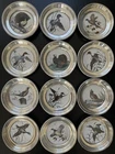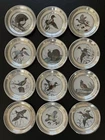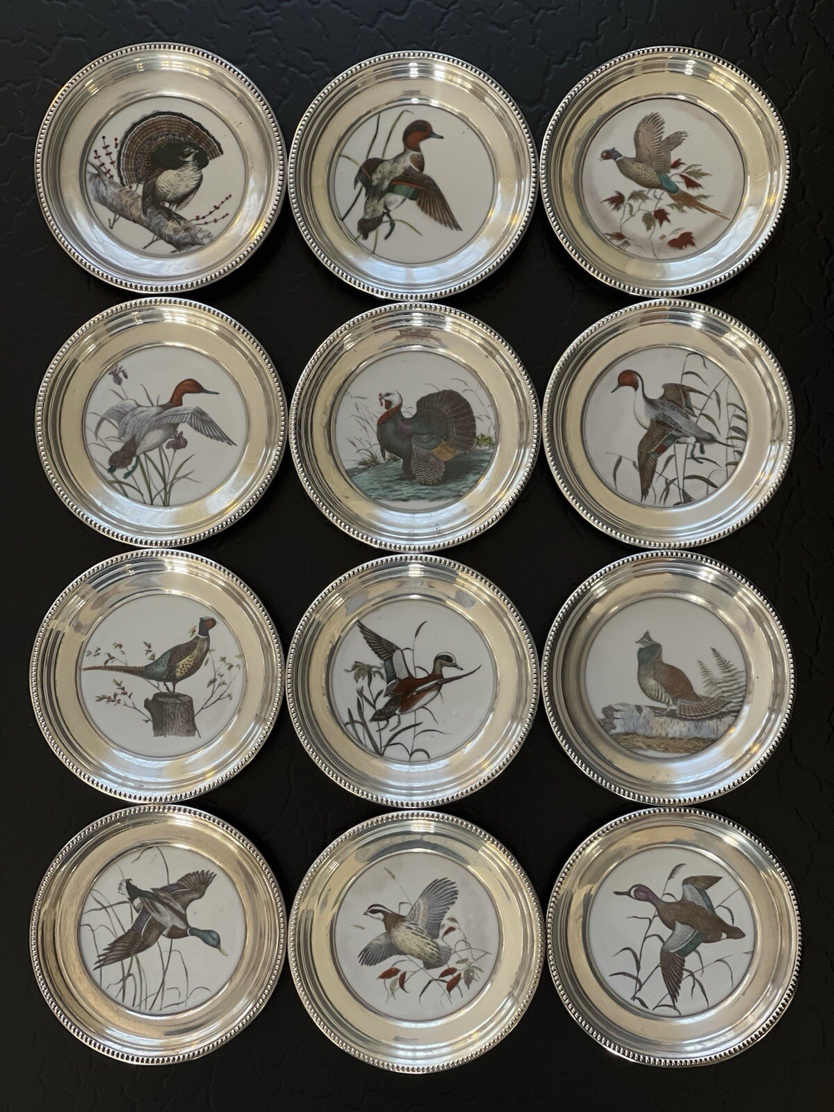 Add these stylish authentic American Whiting 925 sterling silver classic beaded mid-century modern coasters in a stupendous full set of 12 to any setting in which you wish to add a timeless touch of American game bird aesthetic. Every single one in the collection is here. There are twelve unique and scarce game bird hunt themed designs with gleaming sterling rims that will make a stunning showpiece for display or use. There are minimal light age related dings and light bends in places due to their malleable nature and period status, c1940, but nothing that takes from their elevated appearance. The fine color illustration by British-American nature artist Dennis Puleston (1905-2001) is hand applied to China which is in superb condition with no cracks. This is a worthy rare vintage MCM example to enjoy and delight. The coasters stack nicely and look sharp. Bear in mind that these are period objects and not brand new but are marvelous surviving examples from an elegant era in American design and culture. Made by Whiting, these 4.5” coasters are clearly marked Frank M. Whiting & Co Sterling to rim base verso. Lightly hand polished. Display ready. • Baldpate • Blue Wing Teal • Bobwhite Quail • Canvasback • Green Wing Teal • Mallard • Pheasant • Pheasant • Pintail • Ruffed Grouse • Ruffed Grouse • Turkey