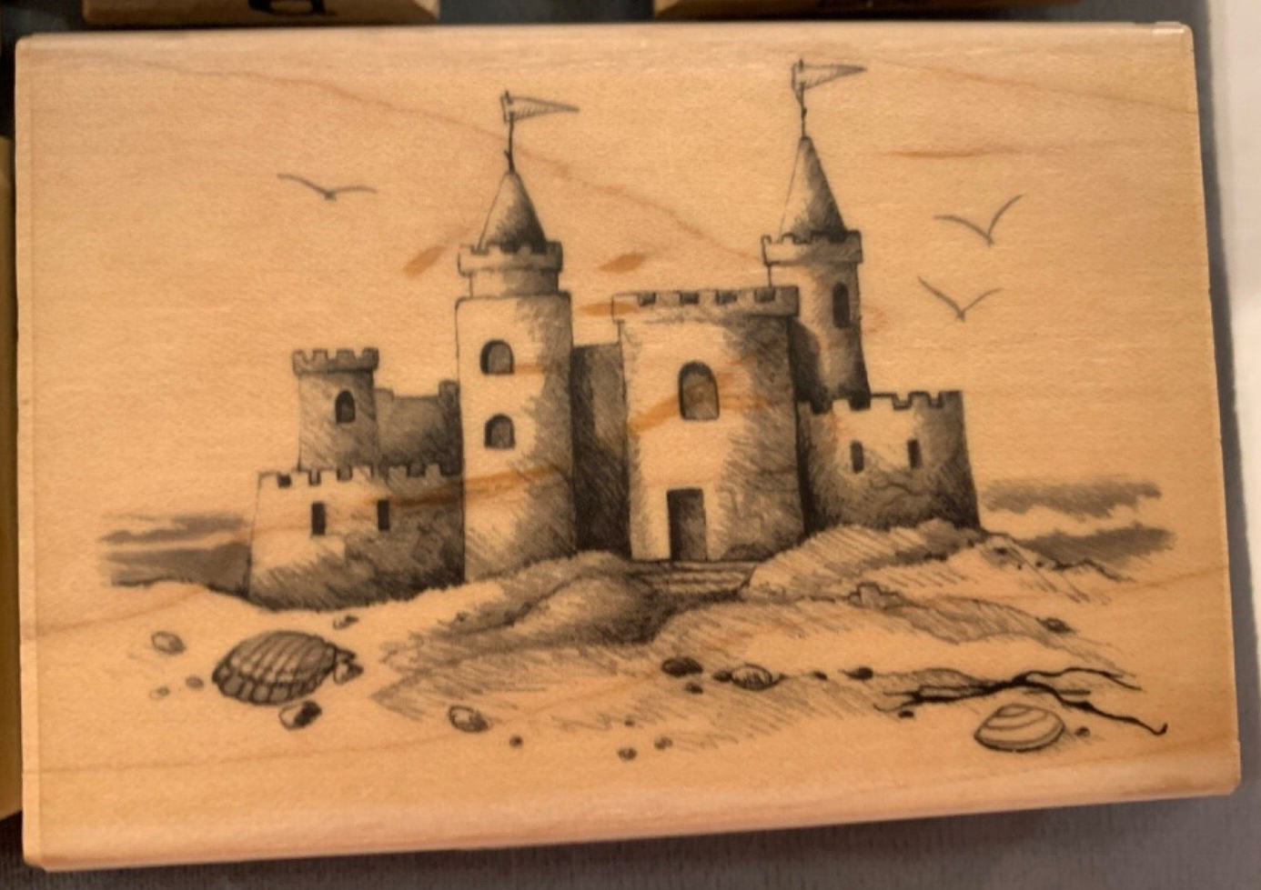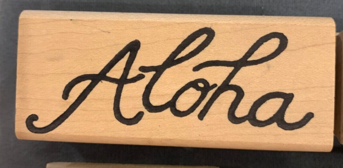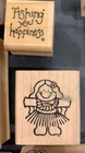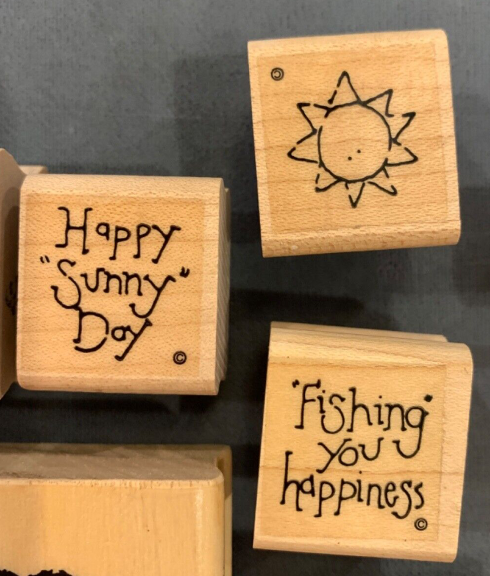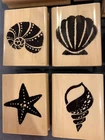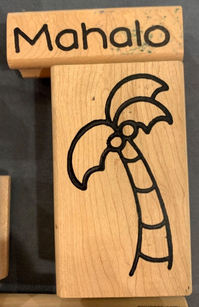This is a set of 9 rubber stamps with a beach and Hawaii theme. It includes a sand castle, a Hula dancer, palm tree, sea shells, sun, "Mahalo", "Aloha", "Happy Sunny Day" and "Fishing you happiness".