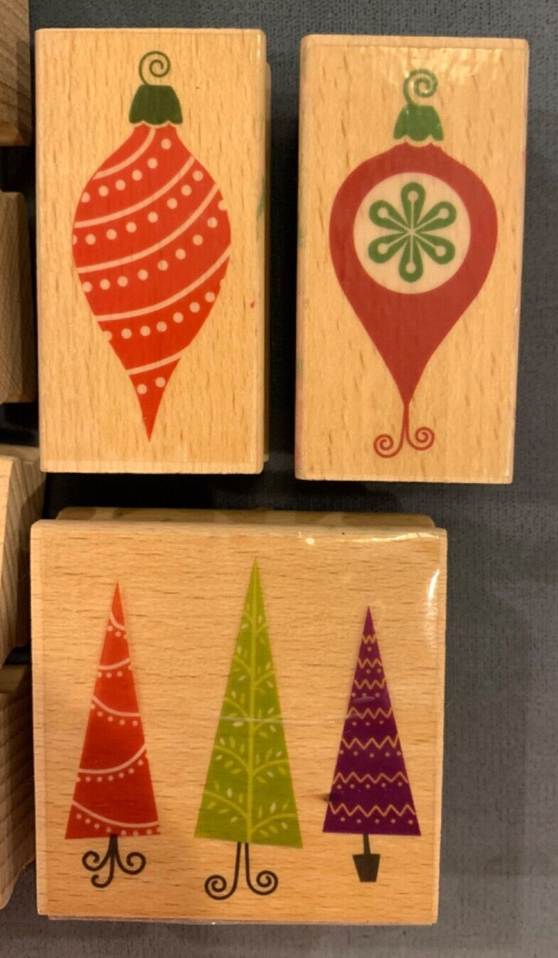 This is a set of 12 wood-mounted rubber stamps with a Christmas holiday theme. It includes Christmas trees, ornaments, saying, New Year's cheer, snowflakes and gifts. A perfect variety to create great scrapbook pages or paper crafting projects.