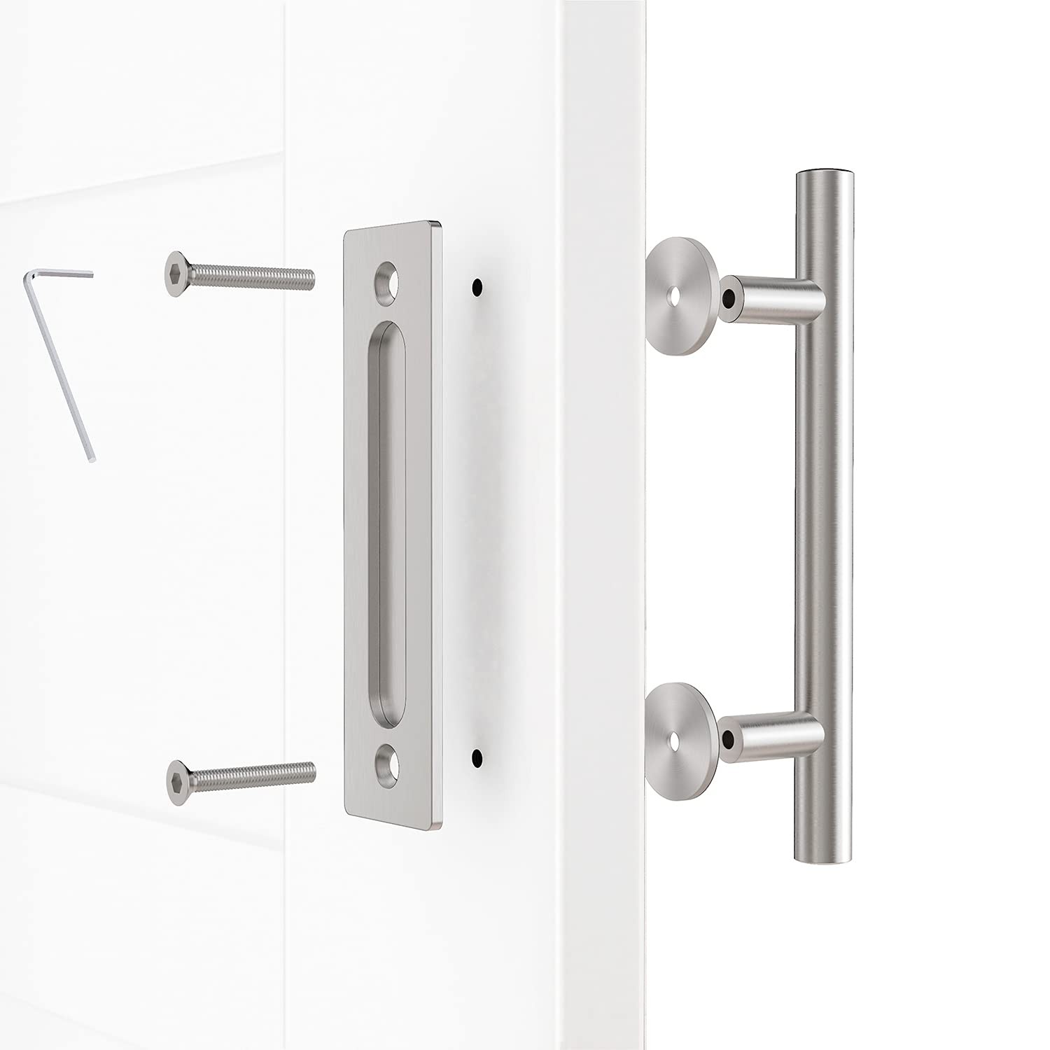 [ EXCELLENT MATERIALS & CRAFTSMANSHIP ] -- Made of high-quality metal material and coated with the excellent powder. Solid and well-made, with good rust and corrosion resistant. Superior finish provides greet touch feel. No sharp edges, and it will not scratch your hands. [ TWO-SIDE DESIGN ] -- This handle set can be used on the inside and outside of the door, the inside flush pull and the outside door pull handle. The door can be easily opened wherever you are. It is a perfect application for barn doors. [ DOOR PANEL THICKNESS ] -- Suitable for 1 3/8"- 1 3/4" thick door. It can used interior or exterior doors. Suitable for barn doors, closet doors, garage doors, garden sheds, wine cellars, etc. [ EASY TO INSTALL ] -- All the necessary hardware is included. Just drilling two holes in the door to install, no need to chisel the door, you can complete the installation in a few minutes. [ SERVICE ] -- 5 years warranty, 7 x 24 hours customer service. If there anything wrong with this door handle, our customer service will try best to solve your problem.