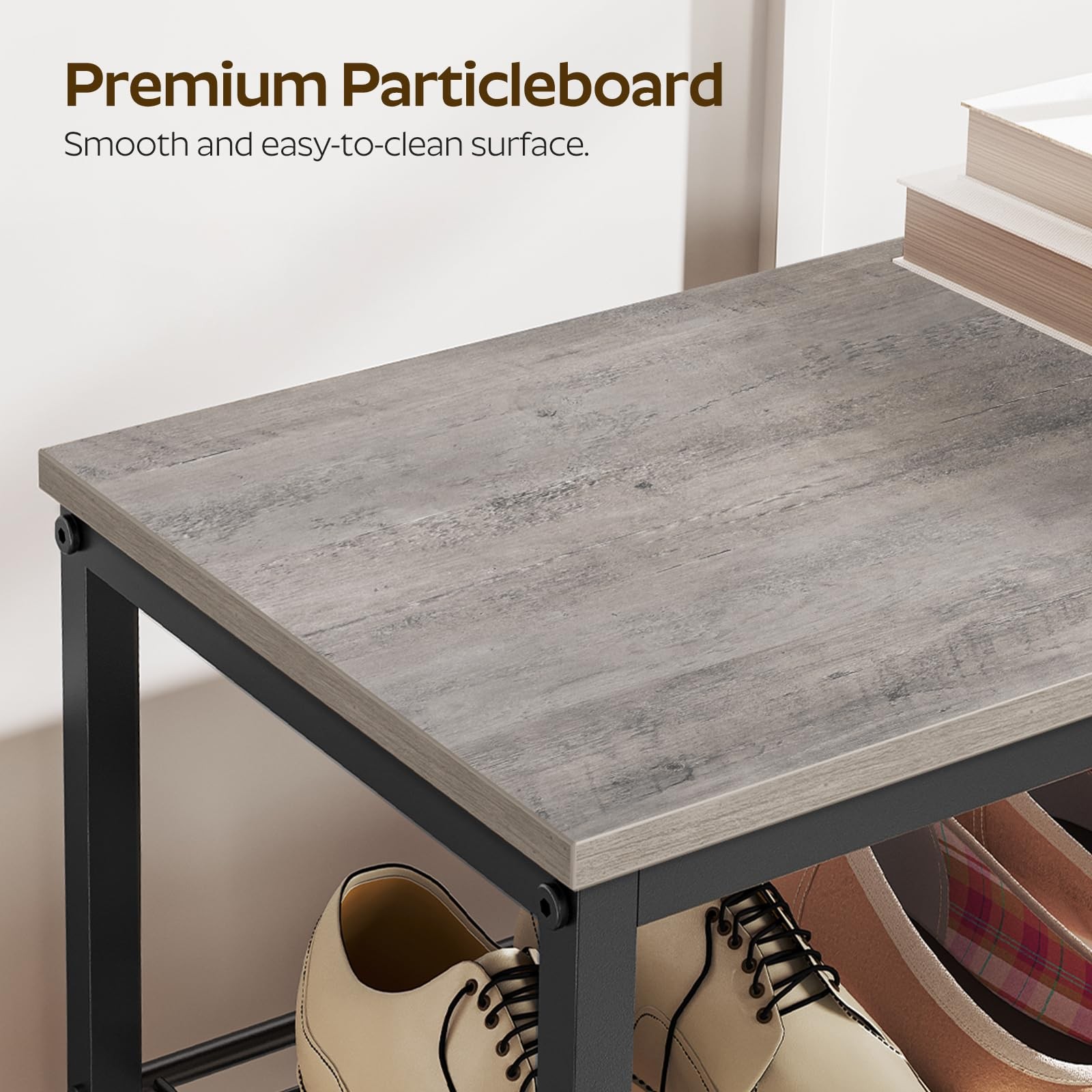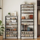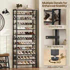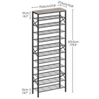 shoe rack consists of multi-layer metal mesh shelves, which provides you with a large storage space and can meet different storage needs. It is a good home for the family's shoes. Sturdy Shoe Rack The durable shoe rack is made of quality particleboard and metal frame and very stable with added side reinforcement design. The anti-tip device keeps you rest assured during use. Multi-Purpose Shoe Organizer Put it at the entrance, and you can quickly tidy up your shoes when you get home from work. It's a storage place for all kinds of family shoes. Put it in the bedroom cloakroom, it's a good place to organize and store other items. Specifications: - Color: Rustic Brown, Black - Material: Particleboard, metal - Dimensions: 27.8"L x 10.8"W x 65.7"H - Weight: 18.7 lb - Max. Static Load Bearing: Top: 44 lb; Each Mesh Shelf: 22 lb Package Contents: - 1 x 10-Tier Shoe Rack - 1 x Accessory Package - 1 x Anti-Tip Device - 1 x Assembly Manual Attentions: - The third and sixth mesh shelves above the bottom can be removed to reserve space for high boots. - It is forbidden for children to climb or play on the product for safety reasons. - For safe use, it is recommended to install the attached anti-tip device. Capacious Shoe Rack: The tall shoe rack sizes 27.8"L x 10.8"W x 79.3"H and has 12 storage shelves. Each tier can hold 4 pairs of shoes, making it competent to store shoes of whole family. The top is ideal for placing bags, helmets and other belongings Reliable Shoe Organizer: The shoe rack is built with quality particleboard and metal, strong and bearable. The top panel can undertake 44 lb and each mesh shelf 22 lb. The side X-shaped design of the metal shoe organizer offers doubled enhancement for overall stability Thoughtful Shoe Shelf: The combination of panel and black mesh frame represents the industrial style. The multi-level design effectively stores your shoes with protection, beautiful and practical Versatile Uses: Besides its original role of storing shoes, this shoe rack can be a display stand of books, greenery, flowers and artistic works in the living room, bedroom, office etc. powerful, practical and all-match Easy Installation: The shoe rack has a simple structure and all accessories have been numbered in order. With detailed assembly instructions and necessary tools, the assembly can be completed without too long and can be quickly put into use