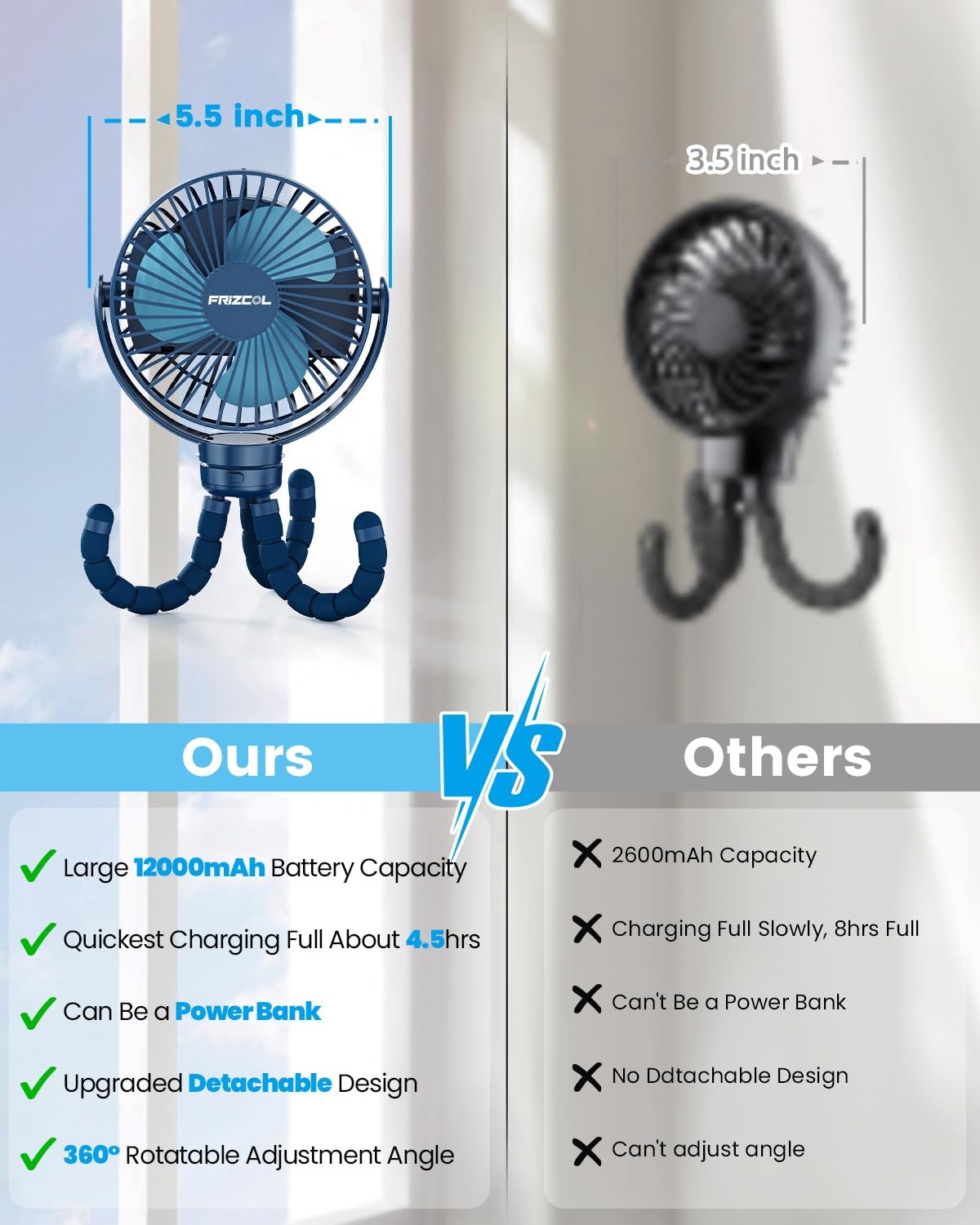INCREDIBLE 65-HOUR BATTERY LIFE, USB RECHARGEABLE FAN: Our battery powered fan built-in 12000mAh rechargeable battery, its battery will last anywhere from 12 to 65 hours depending on the fan speed setting. Simply charge it through a USB port from a power bank, pc, hub, outlet, etc. This flexible tripod fan is compact, lightweight, and gives an impressive cooling effect. USE AS BACKUP POWER BANK, POWERFUL&PRACTICAL: Are you worry that your phone is going to run out of power while you are outside? Don't worry about it anymore! Our small fan could use as a backup power bank for your electronic devices, such as smartphones, laptops. This mini fan is compact&lightweight, take it on the go, perfect for the car seat, baby stroller, golf cart, beach, camping, gym, travel, and other outdoor activities. Our battery powered fan is your must-have summer gadget! IMPROVED COOL AIRFLOW, MIGHTY YET QUIET BRUSHLESS MOTOR: Small but sturdy, this small portable baby fan has three different speeds, designed to keep your baby cool without an irritating noise. Its powerful 5000RPM turbo motor, giving you an instant breeze of up to three meters. Mighty yet quiet fan for baby stroller, bed, office, home. Now is the time to invest in a decent portable fan that will keep you cool all summer long. THREE ADJUSTABLE SPEED, 360° ROTATION, COMPACT, AND LIGHTWEIGHT FAN, FRIENDLY TO MOMMIES AND BABIES: This flexible tripod fan offers complete 360 vertical and horizontal rotations so you can direct the wind at an appropriate speed to any direction you need. The grid openings on the back and front are smaller than others, no need for concerns of little fingers making their way through the back of the fan to touch the blades. HIGH-END QUALITY, 300 DAYS WARRANTY, BUY WITH HASSLE-FREE: This is a multi-purpose USB rechargeable fan that combines clip on fan, handheld fan, small desk fan, and stroller fan in one. Its bendable legs give the option to attach this small fan wherever is available - Hold it, fix it, hang it, and fold it. No doubt this is the best all-rounder battery-operated colling fan. We also provide you with the finest customer service.