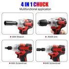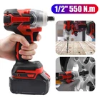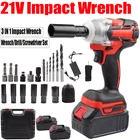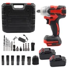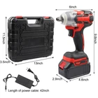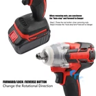 Drill Operation: First, turn the adjusting ring, predrill pilot holes to make dribing easier and to prevent splitting of the workpiece. Drilling in the wood: When Drillimh in wood, the best results are obtained with wood drills equipped with a guide screw. The guide screw makes drilling easier by pulling the bit into the workpiece. Drilling in metal: To Prevent the bit from slipping when strating a hole, make an indentation with a center-punch and hammer at the piint to be drilled. Drilling in stone: We provide drill bits that can be used with diamond heads, specifically for diamond heads, walls, tiles etc. Please add water during the drilling process to prevent overheating. Place the point of the bit in the indentation and start drilling. Use a Cutting lubricant when drilling metals. The exceptions are iron and brass which should be drilled dry. Specifications: Voltage: 21V Li-ion Battery Motor Type: Brushless Max. Torque: 550 N.m Wrench Chuck:1/2" Powered Source: Battery Powered Battery Capacity:5.5 Ah Li-Ion Battery Qty:2PCS Working Time: 1.5-2 hours(One Battery working time) Charging Time: 3-4 hours Material: Metal & Plastics Package Includes: 1 x Cordless Impact Wrench 2 x 5.5Ah Batteries 1 x Charger 1 x Case 20 x Accessories Features: Cordless Power Impact Wrench: This Impact Wrench has a powerful brushless motor, delivers a maximum torque of 550N. M for fastening various applications. Brushless Motor: Brushless motor for higher performance and durability with increased efficiency and runtime, less noise and sparkles compared to brushed motor. 2PCS 5.5Ah Li-ion Batteries: Double batteries can last for 3-4 hours (each 1.5-2h). The impact wrench have stepless speed, you can adjust the speed at any time. Equipped with LED light, there is no hindrance to work in a dark environment. Forward / Reverse Button: Enables easily change rotating direction,can be used for tightening or loosening nuts and bolts. Robust design combines with aluminum alloy housing which prevents damage to the tool. Come with Wrench Sockets: Different sockets used to be tighten or loosen the nuts and bolts, suitable for automobile repair, engineering maintenance and other applications. Come with a Tool Box as well,easy to carry and storge. Humanized Design: Light weight and compact size suitable for use a variety of environments; Handle designed more comfortable and better grip. Battery Tips: Before first using,please make sure fully charge(3-4 hours) the battery to activate battery performance. Keep the battery away from water,do not pound the battery violently. If you encounter any problems during use, please let us know as soon as possible and our team will help you.