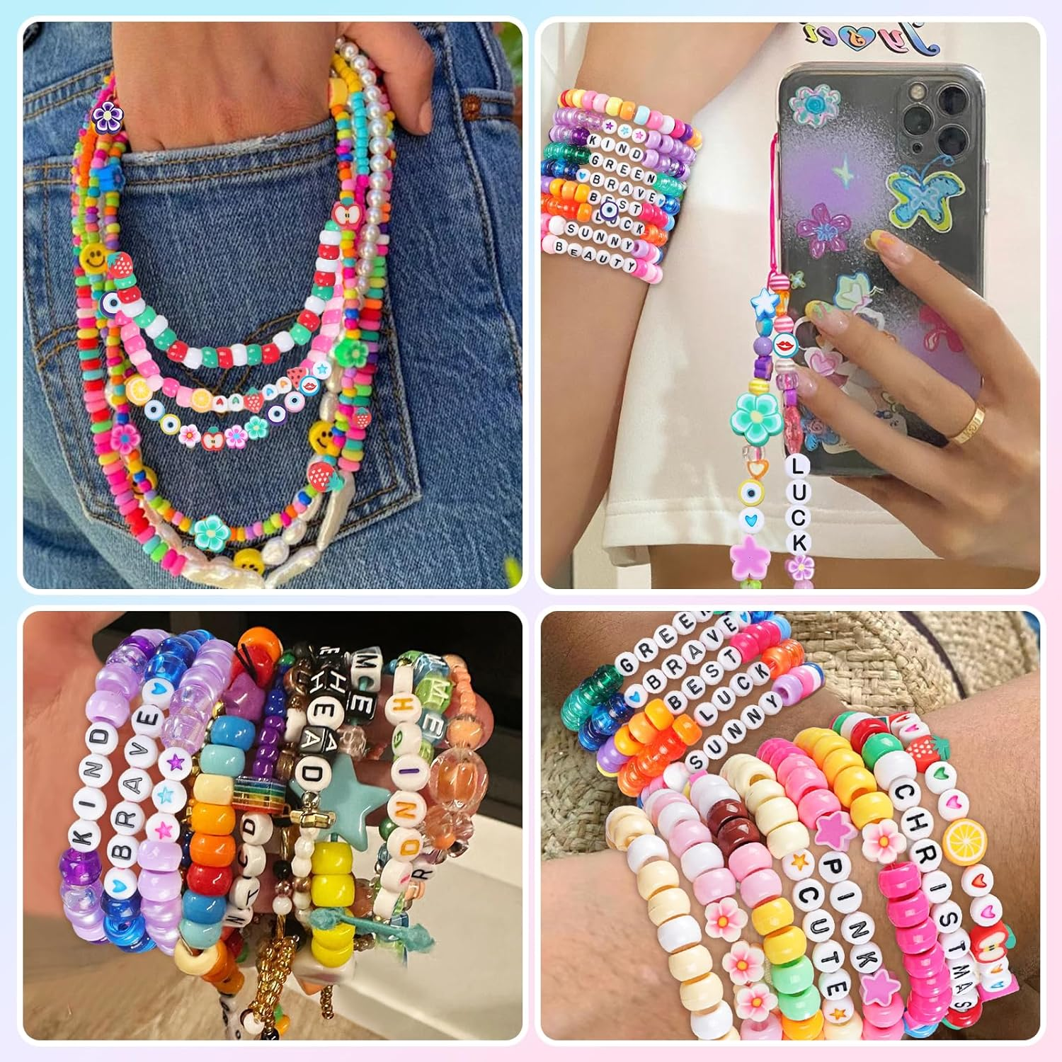 Bracelet making kit: You will receive 5 boxes bracelet making kit contains about 3600 pcs pony beads in 120 colors, about 60 pcs clay beads, 780 pcs letter beads , 60 pcs flat heart and star beads and so on, 7 rolls of strings, a scissors and a tweezers. Quality and vibrant beads: The pony beads for bracelets have 120 iridescent colors in all, and are made of premium materials with smooth surface and accurate 4 mm holes for easy stringing, waterproof, not easy to fade. Wide application: The bracelet making kit for girls 6-12 are very suitable for making necklaces, bracelets, hair braids, earrings, pendants, keychains, phone lanyard and other interesting DIY crafts like beaded pets, etc. Ideal for gift-giving: Our friendship bracelet making kit is warm gift for girls and adults, so it is a perfect gift for your families, kids, friends, teachers and colleagues at birthday, Christmas, Thanksgiving and Mother's and Children's Day! Great for festival: The pony bead kit is suitable for various festivals, by matching the color of the beads, highlighting the theme color, you can create a strong festival atmosphere. For example, the theme of St. Patrick's Day is green, and Christmas is green, white and red, etc. Product Description AMDBHC 5 Boxes Pony Beads For Friendship Bracelet Making Kit A must-have for DIY enthusiasts looking to create beautiful bracelets and jewelry pieces. Our bracelet making kit is designed with a focus on versatility, quality, and creativity, making it ideal for crafters of kids and adults. Inside this jewelry making kit, you will find everything you need to get started on your bracelet making journey. With over 3600 pcs sturdy pony beads in 120 assorted vibrant colors, the creative possibilities are endless. These lightweight and sturdy plastic beads are perfect for making bracelets, hair braiding, DIY crafts, and jewelry projects. Whether you are a beginner or experienced crafter, our bracelet making kit ensures a seamless crafting experience. The included organizer box keeps your beads neatly stored and organized, which will provide you with great convenience. Perfect for various occasions, our pony beads making kit is suitable for creating friendship bracelets. The high-quality materials ensure that your creations will stand the test of time, making them perfect for gift-giving or personal use. Bring out your inner artist with the AMDBHC bracelet making kit today and explore the endless possibilities of bead crafting. Transform simple beads into stunning accessories with ease and let your creativity shine through.