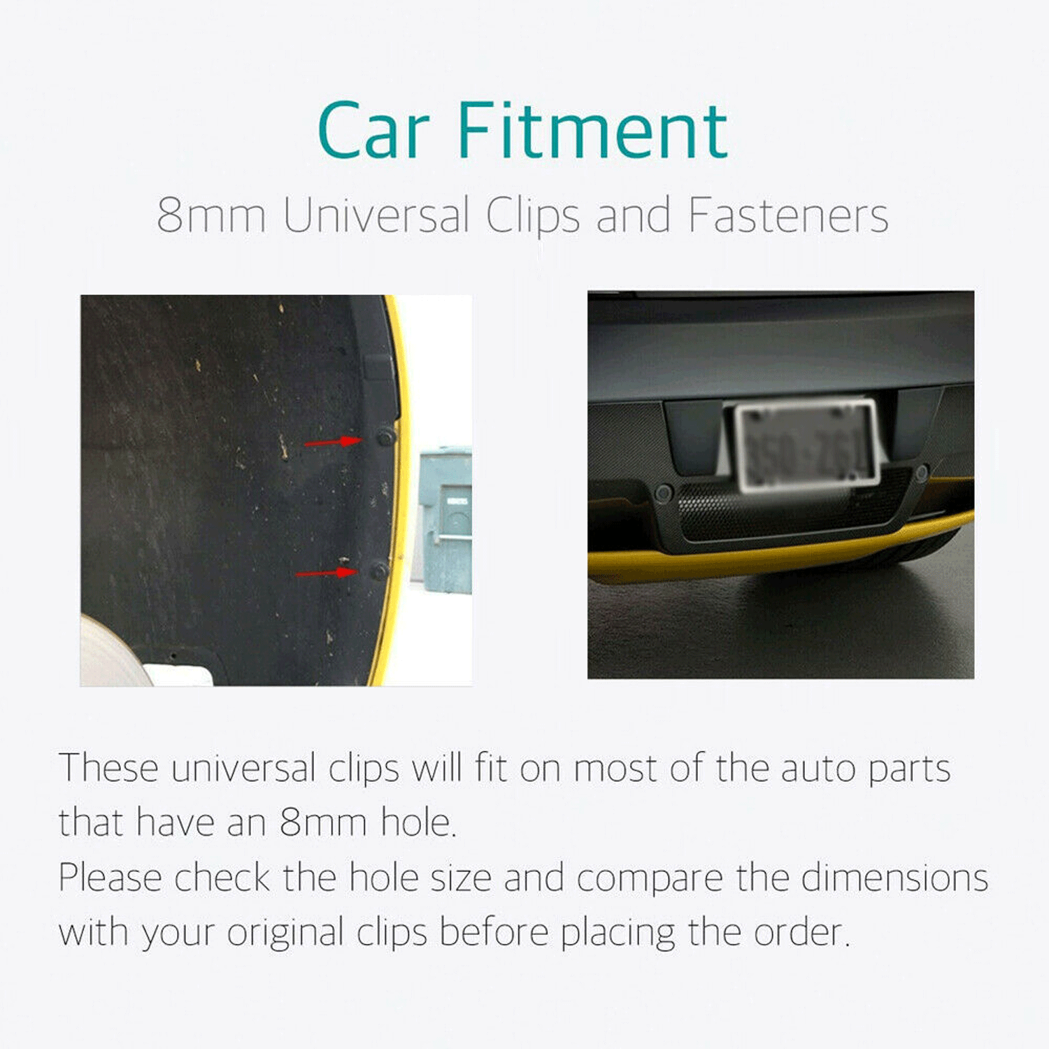 Details: Product Name: Plastic Rivet Material: Plastic Color: Black Max Diameter: 20mm/0.78" Total Length: 25mm/0.98" Stem Length: 20mm/0.78" Fit Hole Diameter: 8mm / 0.31" Package Content: 120PCS(+/-2%) x Plastic Rivets Features: These universal plastic clips will fit on most of the auto parts with an 8mm hole, please check the replace hole size before placing an order. The push pins will be used for holding on radiator yoke, fender, fender flare, bumper, splash shield, retainer, mud flap, grille, etc. Very easy to install and remove easier with a rivet remove tool ( rivet remove tool not included). The sturdy black material will hold up the fender, bumper, splash shield, splash guard, retainer tight and well. Package includes 120 pieces fasteners which will be enough for you to use. 120pcs Nylon Push Type Retainer Clips for 8mm Hole GM 21030249 Chrysler 6503598 Details Note: Before ordering, Please check the size first. Details: Product Name: Plastic Rivet Material: Plastic Color: Black Max Diameter: 20mm/0.78" Total Length: 25mm/0.98" Stem Length: 20mm/0.78" Fit Hole Diameter: 8mm / 0.31" Package Content: 120PCS(+/-2%) x Plastic Rivets Features: These universal plastic clips will fit on most of the auto parts with an 8mm hole, please check the replace hole size before placing an order. The push pins will be used for holding on radiator yoke, fender, fender flare, bumper, splash shield, retainer, mud flap, grille, etc. Very easy to install and remove easier with a rivet remove tool ( rivet remove tool not included). The sturdy black material will hold up the fender, bumper, splash shield, splash guard, retainer tight and well. Package includes 120 pieces fasteners which will be enough for you to use. Product Description: 1. Made of high quality plastic, tough and resistant to cracking. 2. Push in type, fit 8mm diameter hole. 3. Easy to install, just insert the female part into hole, push the male part to the bottom, closed position. 4. Widely used for car accessories such as bumper clip, mudguard cover for brands’ cars: Ford, GM, Chrysler, Toyota, Nissan, Mazda, Jeep, 2001 MR2 Spyder, 06 350z, 1996 Ford, F-250, Motorcycle, Honda, Chevy, Silverado. 5. Rivet post pressure expands legs for fast and permanent fastening. Installation instructions: Check the hole size of your car, make sure the hole size is 8mm. Remove the old clips with a remover tool from your car Put the two parts of the new clips together Push the clips into the hole Payment Delivery details Terms of sales About us Contact us Payment We accept major credit card payments via Paypal. Payment must be received within 7 days of auction closing date. If you do not contact us or respond to our email within 7 days of auction closing date, we do not guarantee the item availability. We reserve the right to cancel any unwanted bids. Delivery details Flat rate shipping charge will be applied to the 48 continental USA States. Extra shipping fee will be charged to ship item(s) to HI, AK, PR, GU, VI, APO, FPO . Item(s) will be shipped via UPS Ground or USPS or Fedex within 3 Business days after payment is received. A Tracking Number will be upload on platform as soon as item(s) is shipped. International buyers please note, we are not responsible for any custom duties, taxes and brokerage fees. For some oversize packages, we may not be able to ship via USPS. Terms of sales All of our items are professionally made and guaranteed to fit. A professional installation is always recommended. Please send a message over eBay if you have any questions. We accept returns within 30 or 60 days after you received the item(s). All returned items must be new and in original package. The buyer will pay return shipping fees. No refund will be made for damaged parts. Shipping and handling fees and insurance fee are not refundable. About us Our warehouses are located in CA and NJ The transportation time is approximately 3-5 working days Contact us Your satisfaction is our top priority. We stand behind all products that we sell. If you have a problem with any of our listings, please allow us to work it out. Our business times are Monday-Friday 9:00- 5:00 Pacific Time. Office closes on weekends and holidays. We are striving to earn a 5- star rating with every purchase. Please take a moment to leave us a positive feedback when you receive your order. If you are not satisfied, please let us know before you leaving feedback. Please always include your purchase eBay item number in the mail whenever you have any questions.