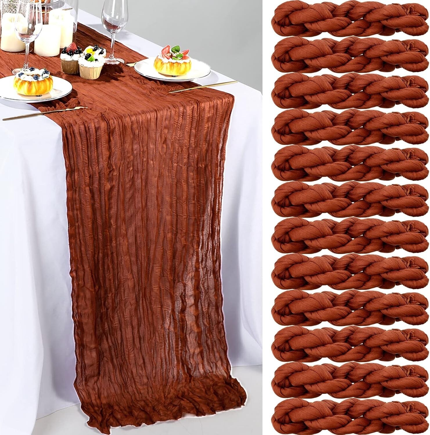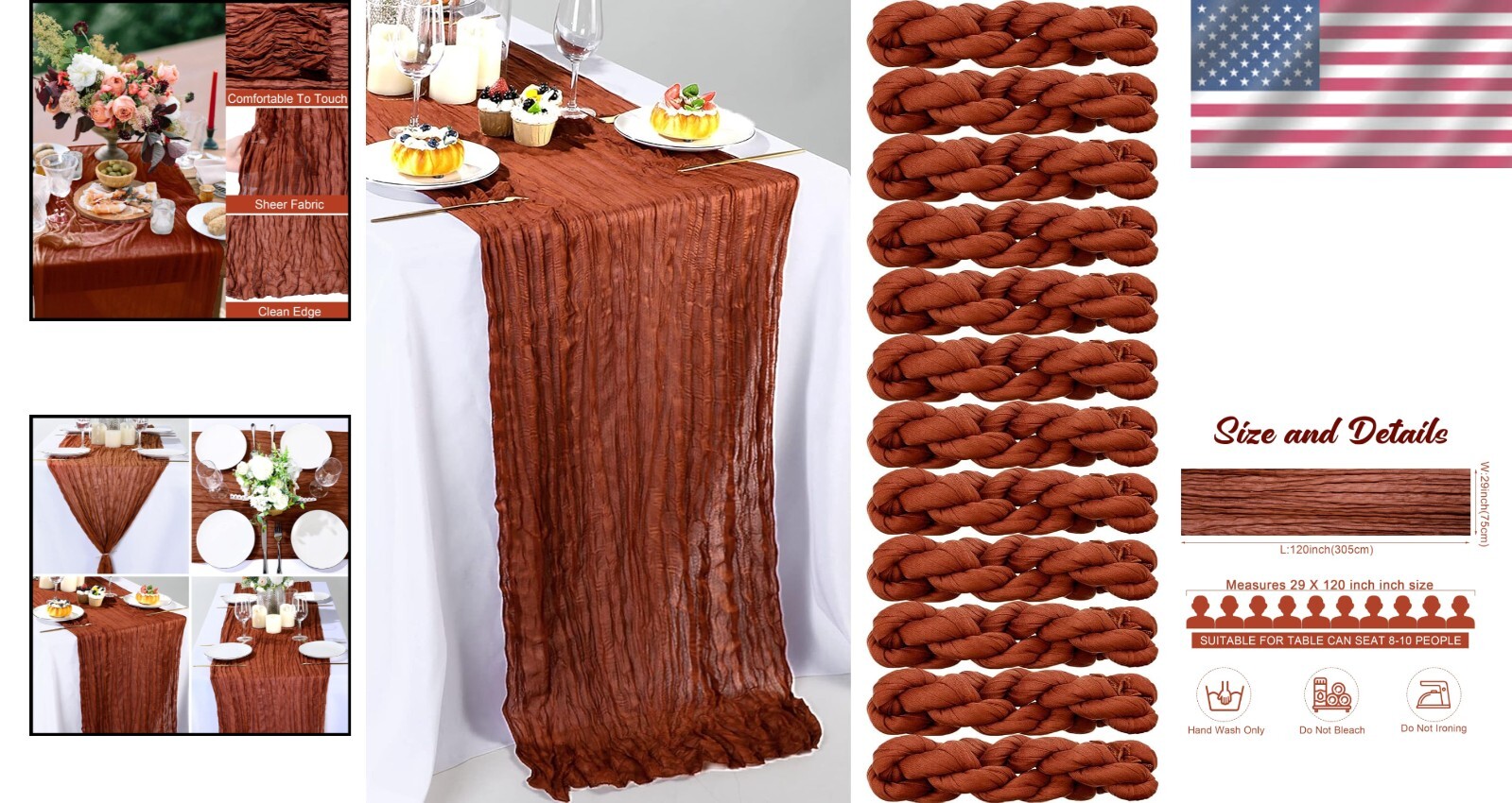 120"x29" Rustic Cheesecloth Set - 24 Light Weight Table Runners in Rust Color ‹ › ‹ › ‹ › ‹ › ‹ › ‹ › ‹ › ‹ › ‹ › 120" x 29" Rustic Cheesecloth Set - 24 Light Weight s in Rust Color Product Highlights: Sufficient Quantity: Enjoy a generous set of 24 exquisite cheesecloth s, each measuring 120 x 29 inches (10 ft long), perfect for all your decorating needs. Quality Material: Crafted from quality polyester, these boho s boast a sophisticated touch—lightweight yet robust, combining transparency with comfort. Table Decor: Edges are tightly stitched for durability, resists abrasion and maintains structure, making them ideal for various festive occasions. Gorgeous Colors: Choose from an enchanting array of colors including rust, light blue, and peach coral; harmonious combinations with fragrant flowers for a striking table presentation. Easy to Style: Versatile and chic, these runners enhance any theme—be it boho, rustic, country, or retro—delivering elegance whether for weddings or everyday dining experiences. Transform Your Events: Indulge in the beauty of your gatherings with the 120" x 29" Rustic Cheesecloth Set, designed to elevate any table setting with a touch of sophistication. Perfect for baby showers, weddings, holiday parties, or intimate dinners, these runners bring a romantic ambience that captivates guests at first sight. The romantic drape and delicate folds create a picturesque dining atmosphere. Hand-washable for easy maintenance, remember to keep them away from bleach and irons. Whether it’s an elegant wedding reception or a cozy candlelight dinner, these runners are the quintessential decor piece that emphasizes style and warmth. Why Choose Our Rustic Cheesecloth Runners? Stand out with our collection! The combination of functionality and aesthetic appeal makes these s a must-have for anyone looking to enhance their events and daily life. Add the final touch to your tablescape and let your gatherings shine with elegance—order your Rustic Cheesecloth Set today! Shipping Free & Fast Shipping - We offer free shipping to most of the USA with a normal delivery time of 3-7 days. However, due to the current situation, additional delivery time (up to 3 weeks) may be required for some items. Alternative Carriers - We may use alternative carriers (e.g. USPS, FedEx, UPS, etc.) to ensure your package arrives safely and on time. Due to the use of multiple carriers, we are unable to provide a tracking number automatically. Handling Time - Orders are processed and shipped within 1-2 business days of receiving cleared payment. Shipping Restrictions - Shipping to Alaska, Hawaii, Puerto Rico, Guam, and other US territories may incur shipping charges or delivery restrictions. Please contact us before ordering, or your order can be refunded/cancelled. State Restrictions - There may be restrictions based on your state of purchase. For example, certain items may not be shipped to California due to state regulations. Contact for Tracking Updates - If you require tracking updates or have any concerns about the delivery of your order, please feel free to contact us, and we will be happy to assist you. Return Please see our eBay Return Policy. Thank you. Payment We accept all major credit cards, PayPal, and Apple Pay for your convenience. Your payment information is secure and encrypted to ensure a safe and seamless transaction. Please complete your payment within 3 days of purchase to avoid any delays in shipping. Feedback Your feedback is extremely important to us. We strive to provide the best products and customer service possible. If you are satisfied with your purchase, please take a moment to leave us a positive review. If you have any concerns or issues with your order, please contact us before leaving negative feedback. We are committed to resolving any problems and ensuring your satisfaction. Contact Us If you have any questions or concerns, please feel free to reach out to our customer support team. You can contact us through the eBay messaging system. We are available Monday to Friday, 9:00 am to 5:00 pm EST, and we will do our best to respond to your inquiry within 24 hours. Thank you for supporting our small family business! UPC: Not Set Unit Quantity: 24 Material: 100% Polyester,Polyester,Cheesecloth Theme: Not Set Occasion: Anniversary,Apology,Baby Shower,Bar Mitzvah,Birthday,Christmas,Congratulations,Easter,Engagement,Funeral,Get Well,Good Luck,Halloween,International Women's Day,Labor Day,Mother's Day,Multipurpose,New Home,Party,Retirement,Romance,Surprise,Sympathy,Wedding,Thanksgiving Features: Hand Wash Only,Abrasion Resistant,Fade Resistant,Shrink Resistant,Deform Resistant,Light Weight,Comfortable Touch,Romantic Style Department: Adults,Boys,Girls,Kids,Men,Teens,Unisex,Unisex Baby & Toddler,Women Character: Not Set Brand: Unbranded Color: Rust Type: Table Runner Pattern: Solid Shape: Rectangular Style: Boho MPN: Not Set Item Length: Not Set Country/Region of Manufacture: Not Set Character Family: Not Set Item Width: Not Set Model: Not Set Unit Type: Unit Care Instructions: Hand Wash Only Personalize: Not Set
