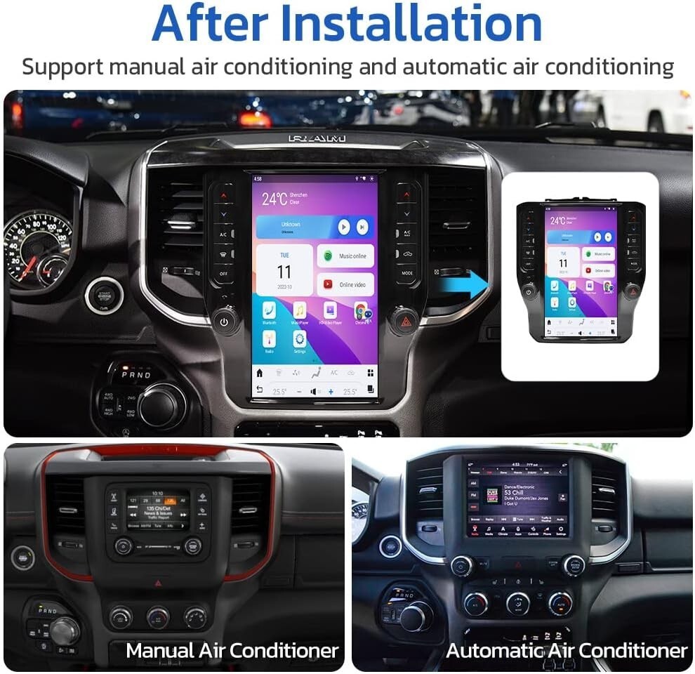 About this item 【Application car Models】12.1 inch Radio Stereo Replacement Android Head Unit fits for 2019 2020 2021 2022 2023 Dodge RAM Truck 1500/2500/3500 New Body Style. Please Note: If Your Original Car Radio Screen Is 12 Inches, Or Has A Factory 360 Camera, Please Do Not Buy This Product, It Is Not Compatible With Your Car. 【Super High Configuration】Pure Android 13 OS. 12.1 Inch IPS capacitive big touch screen. RAM 6GB +ROM 128GB, 1920*1080 Resolution, Built-in 4G SIM card reader, Built-in Bluetooth & wifi. Qualcomm QCM6125(Snapdragon 665) processor, High Performance, Low Power Consumption, faster and Stable. Mali-T860 image processor supports 4K video player and will provide you with an excellent experience in the car. 【Wireless CarPlay/Android Auto】iPhone and Android users can use CarPlay (Apple) or Android Auto (Android) to enjoy a seamless experience using the power of their smartphone for additional features of each system. Connect your smartphone to the RAM radio via Bluetooth or a data line. A smarter, safer, and more fun way to use your phone in the car. 【GPS, 5G WiFi & Bluetooth 5.0】Built-in GPS Navigation: (1)Get the traffic information at any time only when the head unit is connected to the network. (2) Download the offline maps, the GPS function still works without the network. Never get lost! Supports dual band WiFi 2.4Ghz & 5Ghz, Apps get access to the internet at super high speed and steadily. Built-in Bluetooth 5.0 version. Hands-free calls, play music, and download phonebook by connecting phone. 【On Screen Climate Control】This T-Style radio replacement multimedia center replaces the factory display screen and climate control center, enhancing the dash with a multi-touch panel encased in a factory-match bezel. The climate controls are recreated on-screen, allowing you to access all related features. 【Extended Function】FM/AM Car radio receiver; USB/AUX port; music player, video player, etc. 【Kind One-on-one Service】 If you are not sure if your vehicle model is suitable for installation, you can send us a picture of your car's central control before purchasing, and our engineers will confirm and reply to you as soon as possible. If you have any other questions, you can also contact us at any time. Product Description Android 13+ 6GB RAM 128GB ROM + Wireless carplay and Android Auto Upgrade your car radio with a 12.1-inch Big touch screen, and radio built-in Android system, it supports operating most functions like Carplay, Android auto, Hands-free, GPS navigation, and retained of Air conditional panel functions. We can set the climate controls panel and car setting on the radio's screen, package comes with all installation harness wires, easy to install, plug and play. For Dodge Ram 2019 2020 2021 2022 2023 Truck Include the 4G SIM Reader Card Support the Wireless Carplay +Android Auto Support the DSP function to improve the sound quality The climate will show on the new display after the installation Bluetooth 5.0 Connection Support to connect with Android phone or iPhone Bluetooth. Take Phone Call Hands-Free - Free both hands by dialing and listening to a call, on the radio by Bluetooth connection. Music Everywhere - You can instantly share all your favorite music in driving from your smartphone. Support day and night model ● Security changes in an instant. ● After starting with the small light immediately/automatically, the system will automatically switch to the dark theme effect interface, and driving at night is safer. ● Note: Compatible with some third-party apps that come with dark mode functions. More functions -- Surprise you Apple Carplay: Carplay will run automatically after your iPhone is connected. With Carplay, you can use all the essential iPhone functions on the road, making phone calls, navigating, and playing music with Siri's help. Rear View Camera: Support factory OEM backup camera, The system will power on the camera automatically when you reverse and display the image on the touch screen, working as parking assistance, which keeps you safe. Google Store: Support 4G SIM card and WIFI, 128GB RAM is big enough for you to download a wide variety of apps, such as Google Maps, Waze, Youtube, etc., and enjoy your trip. LCD Touchscreen Stereo: The double din Bluetooth radio is designed with pixels 1920*1080 HD display, you can enjoy responsive touch feeling with your fingers. Support 1080P video playback on the stereo monitor. AM FM Tuner: The mechless car stereo picks up all of your favorite AM/FM radio with 30 stations for up-to-date music, news, sports, weather forecast Steering Wheel Control: Compatible with all factory steering wheel control functions. Easy to switch songs, channels and adjust the volume to help you to minimize distractions and keep your eyes on the road. Mirror-Link Function: This touch screen car radio support screen mirroring from iPhone and android smartphone. Split Screen: You can switch and run two apps on the screen side by side. This means you can listen to your favorite music while whilst navigating, or making a phone call with your browser open. Installation Instructions Special car dedicated non-destructive installation Our products are dedicated to the car, the wire is the socket docking without breaking the line, do not cause secondary damage tothe car. Please kindly notes : If you received any problem items,please contact us before giving any feedback, we will confirm the problem and reply you ASAP and give a best solution for this,Please don't worry we are responsible for any possible issues. It's our responsibility to solve the problem until you satisfied. Payment Payment Information Immediate payment is required upon selecting "Buy It Now" or upon checking out through the basket. Return We hope that you will be pleased with your order. However, in the event that your order is not suitable, we are happy to accept returns for a refund (excluding postage) or an exchange with 30 days o